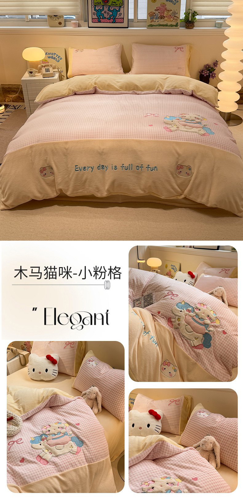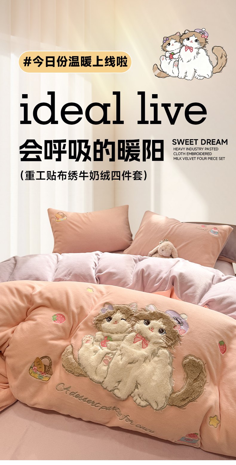 (总)佰亿莱 2026新款重工牛奶绒贴布绣四件套,豹纹KT猫-咖,豹纹KT猫-蓝,快乐朋友,礼物狗狗,猫咪公主,木马猫咪-小粉格