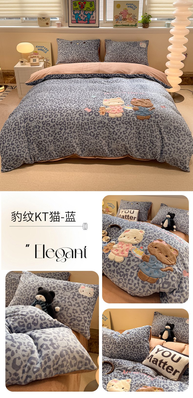 佰亿莱 2026新款重工牛奶绒贴布绣四件套 豹纹KT猫-咖