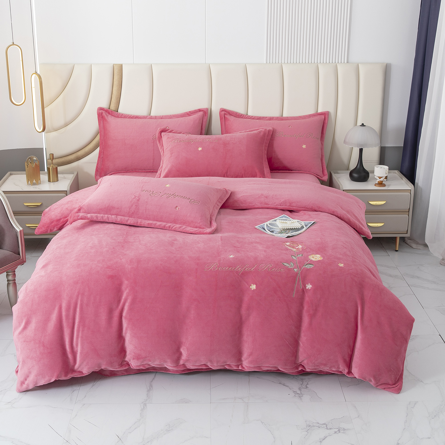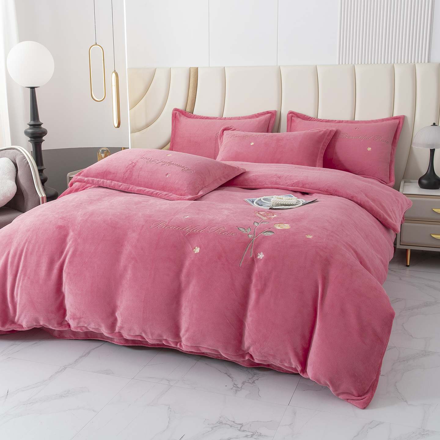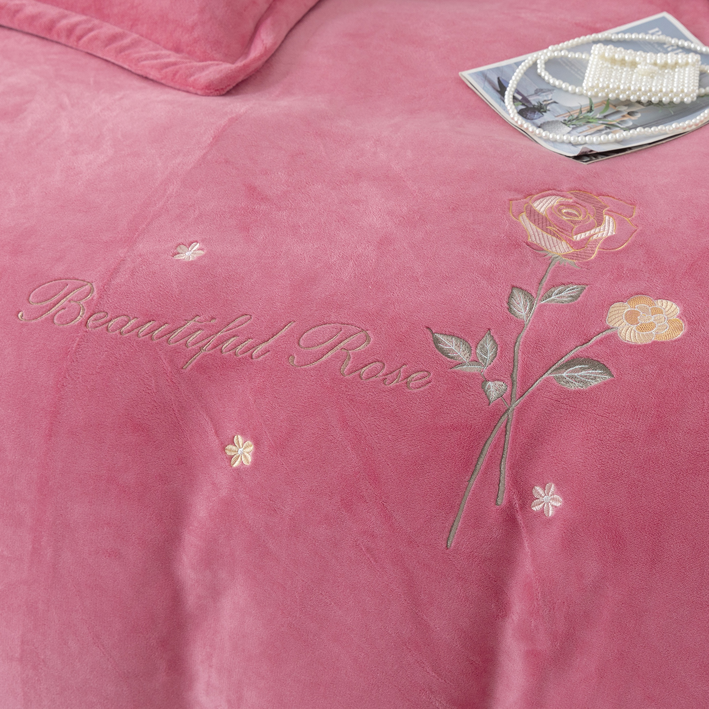商品名称:贝尔 2025新款牛奶绒刺绣四件套-花语系列 花语-粉色