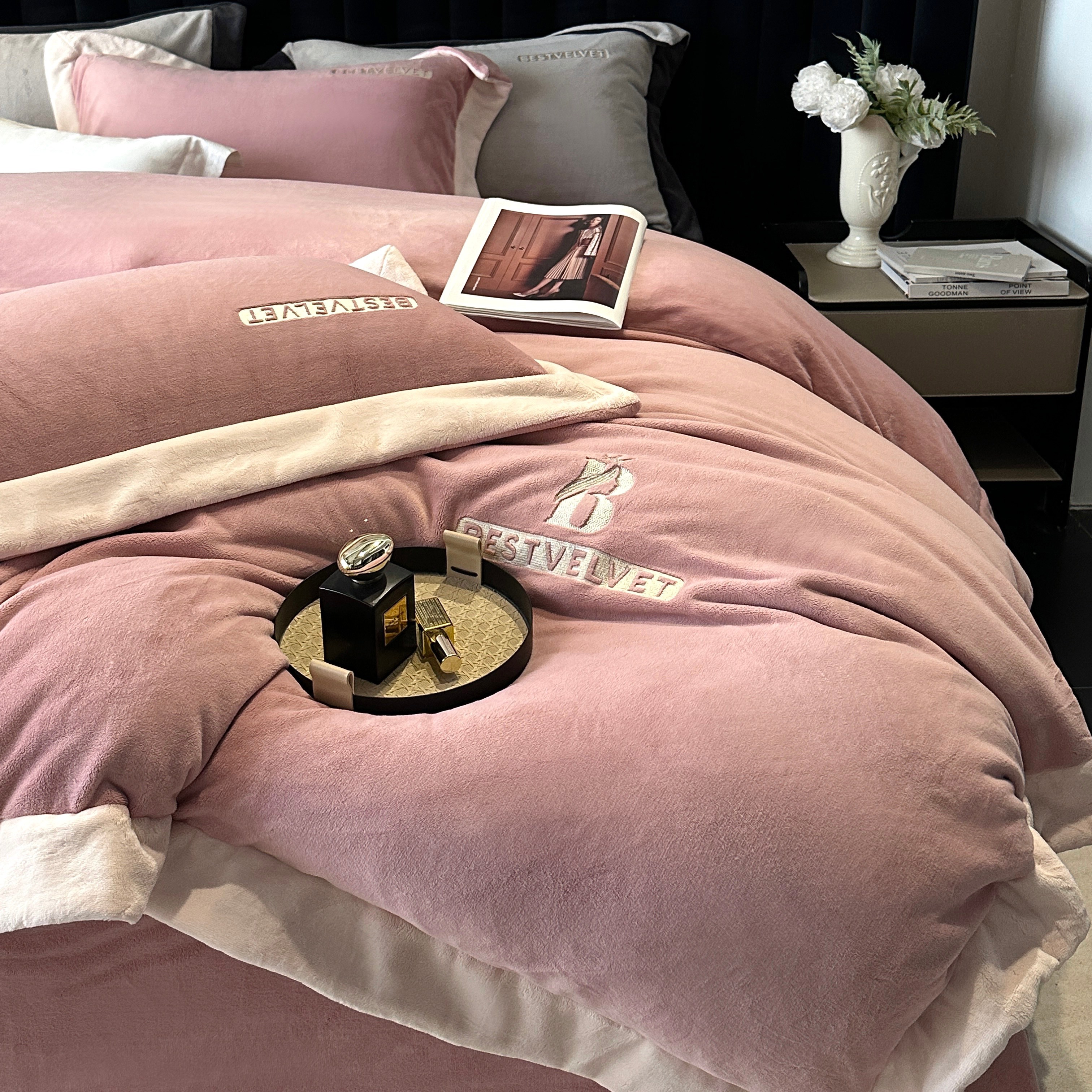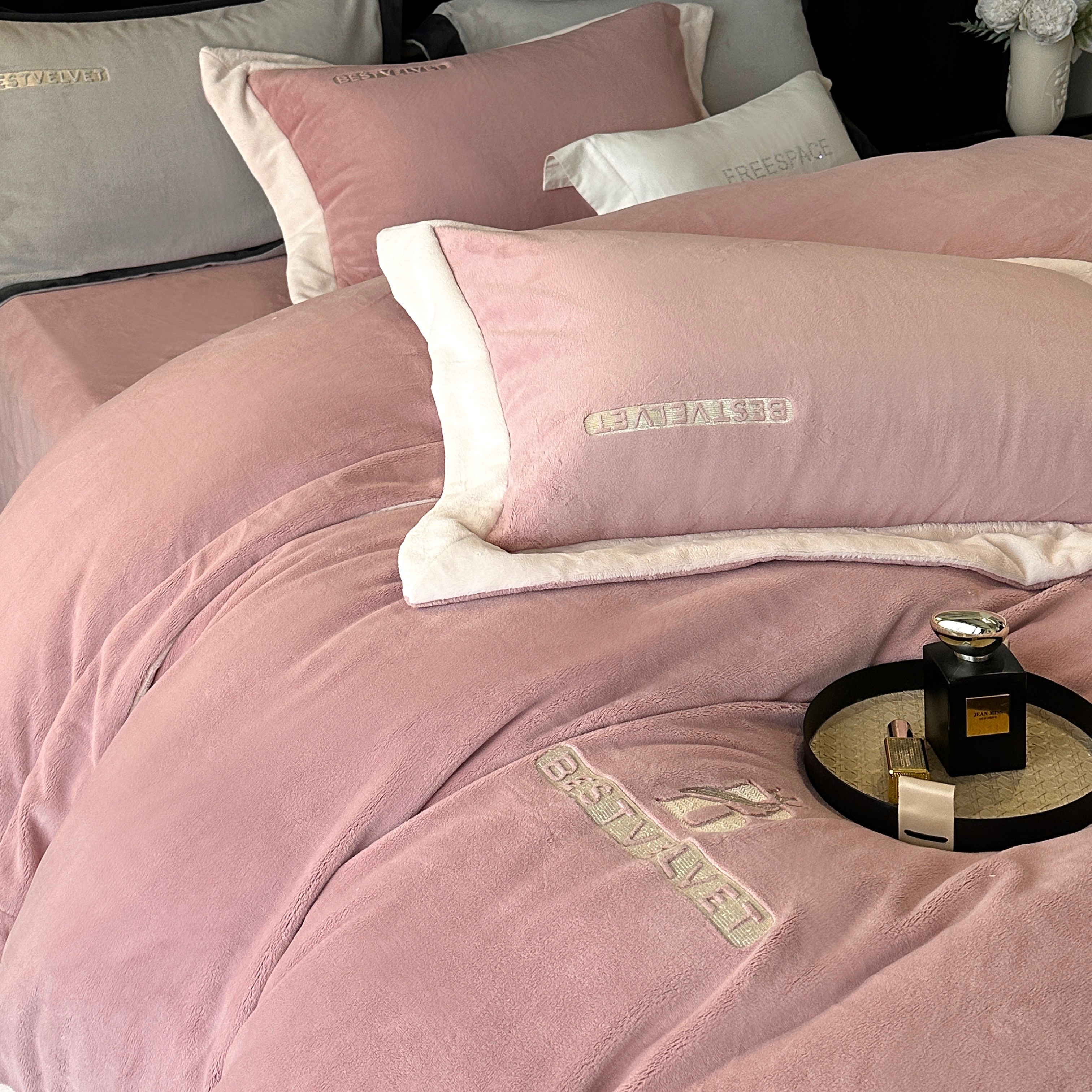 (总)南泉坊 2025新款230克全消光牛奶绒刺绣四件套,墨尔本-豆沙,墨尔本-灰,墨尔本-咖