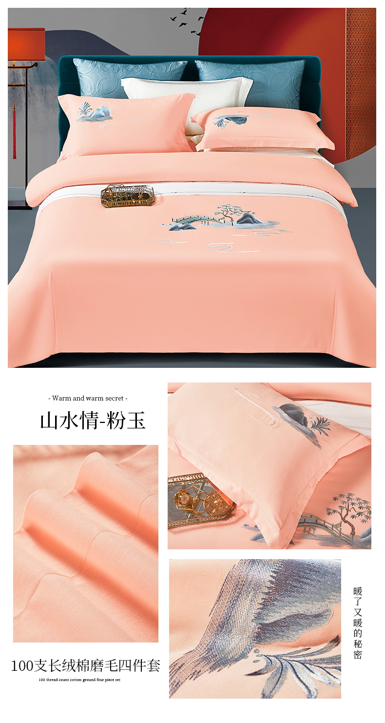 (总)浩情国际婚庆供货中心 2026新品-100支全棉长绒棉磨毛高端刺绣系列四件套,轻曼-豆沙,轻曼-湖兰,轻曼-米驼,轻曼-浅绿,轻曼-浅玉,轻曼-银灰,山水情-豆沙,山水情-粉玉,山水情-湖兰,山水情-米驼,山水情-浅灰,山水情-水兰
