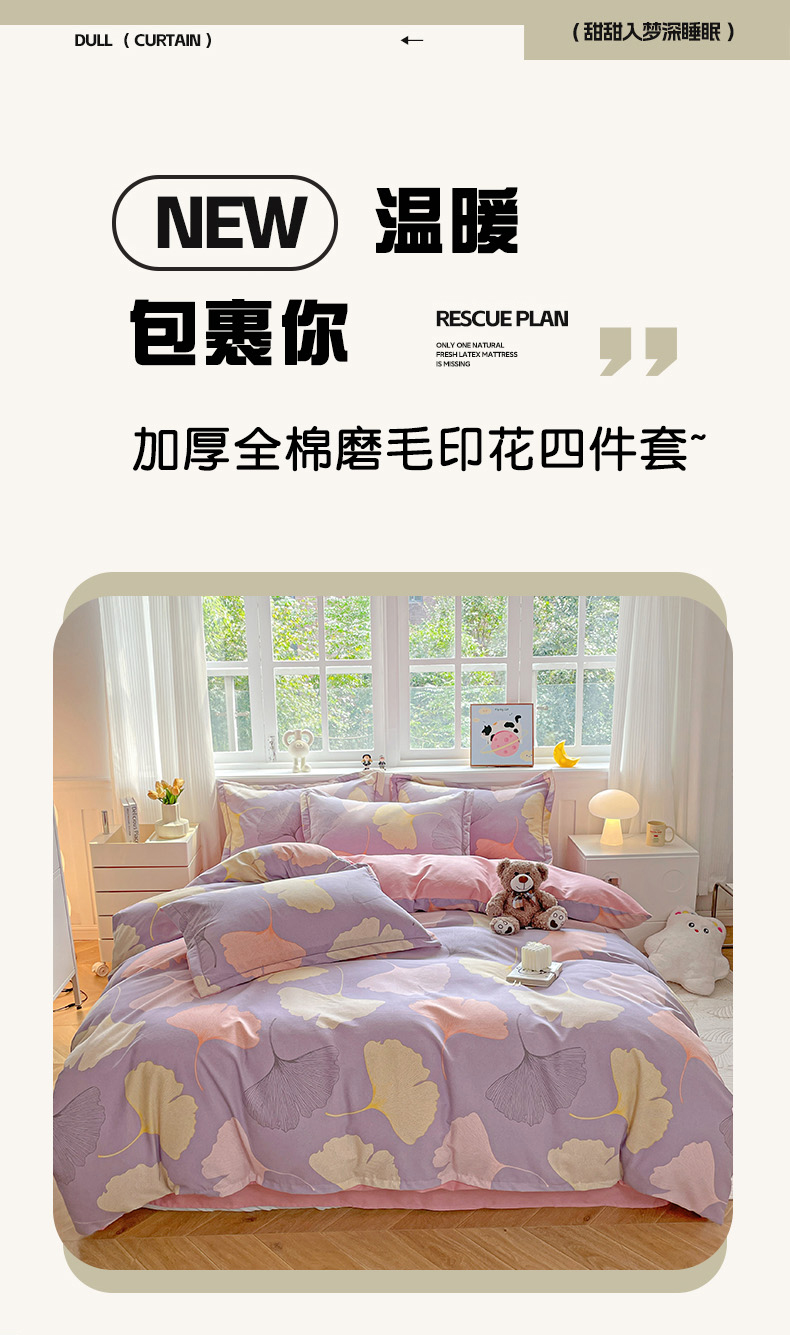 (总)曲之慕 2026新款全棉纯棉加厚喷气磨毛印花四件套,浅花悠悠,林见兔,波西米亚,花舞悠然,卡尼亚,克莱尔,米莱,米莱-兰,米莱-紫,向阳花开,南瓜屋,爱意浓,吾安心,登威熊,芬迪,花恬,花意,空间,晚秋,幽羽,费洛斯,浅香,秋叶,啬园,汀兰,云梦泽,艾格拉,蓝汐,蓝漾,萝莉,暖漾,绮梦,青枝语,秋韵,柔晖,絮语,紫韵,爱意花间,花蕊粉,四叶草,幽梦玉