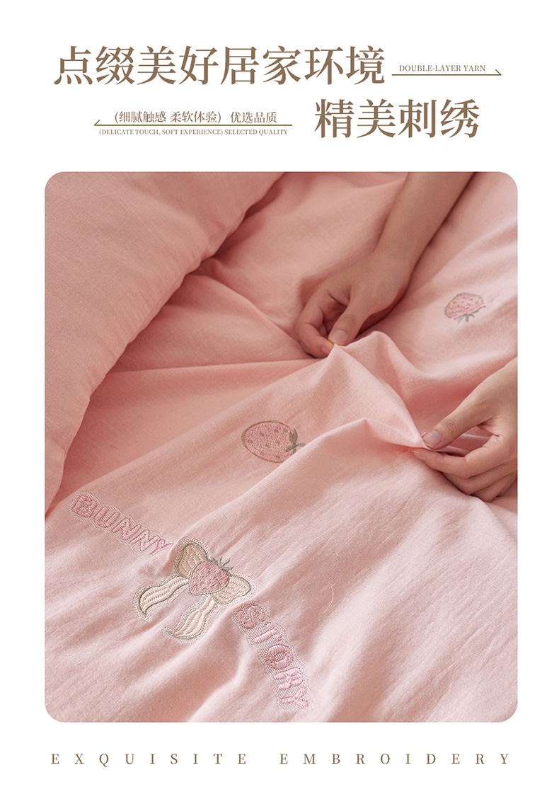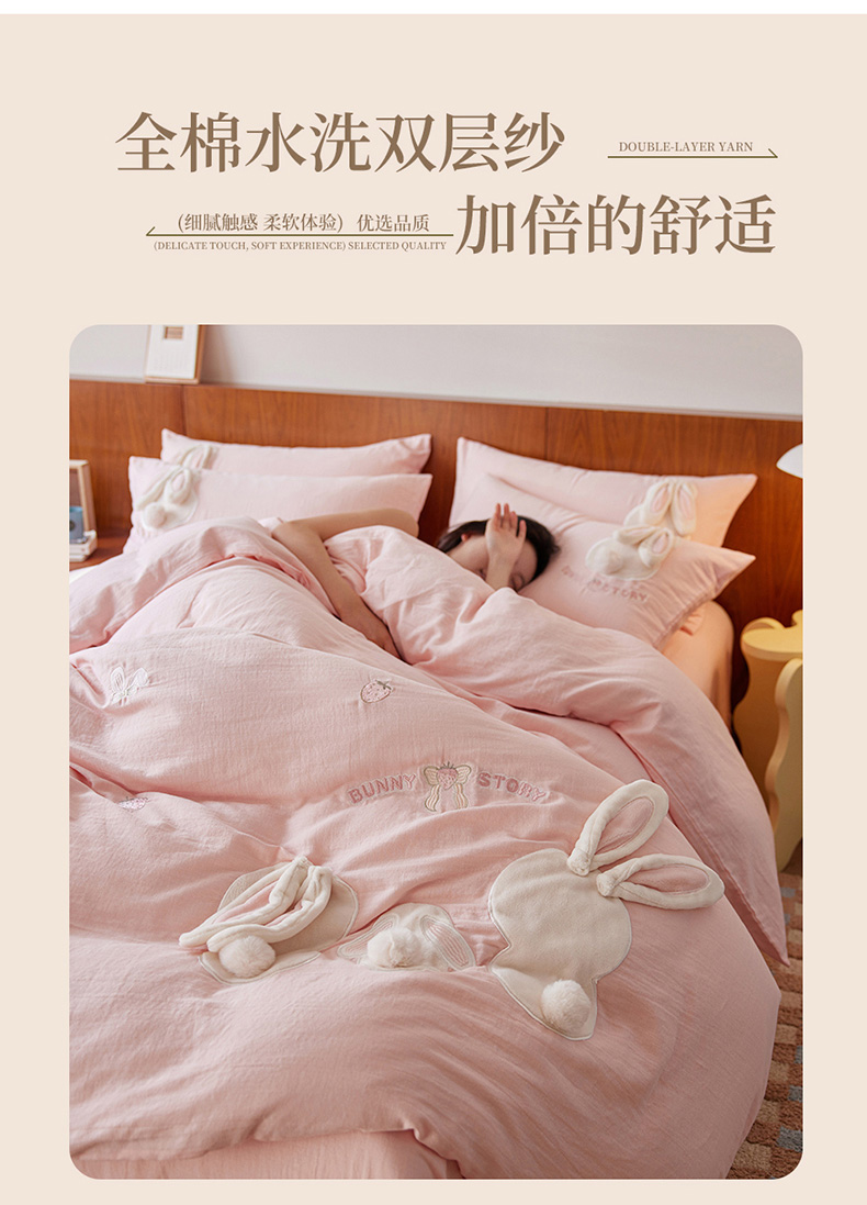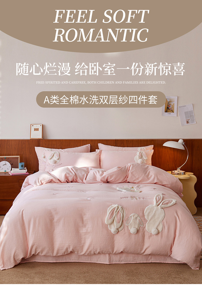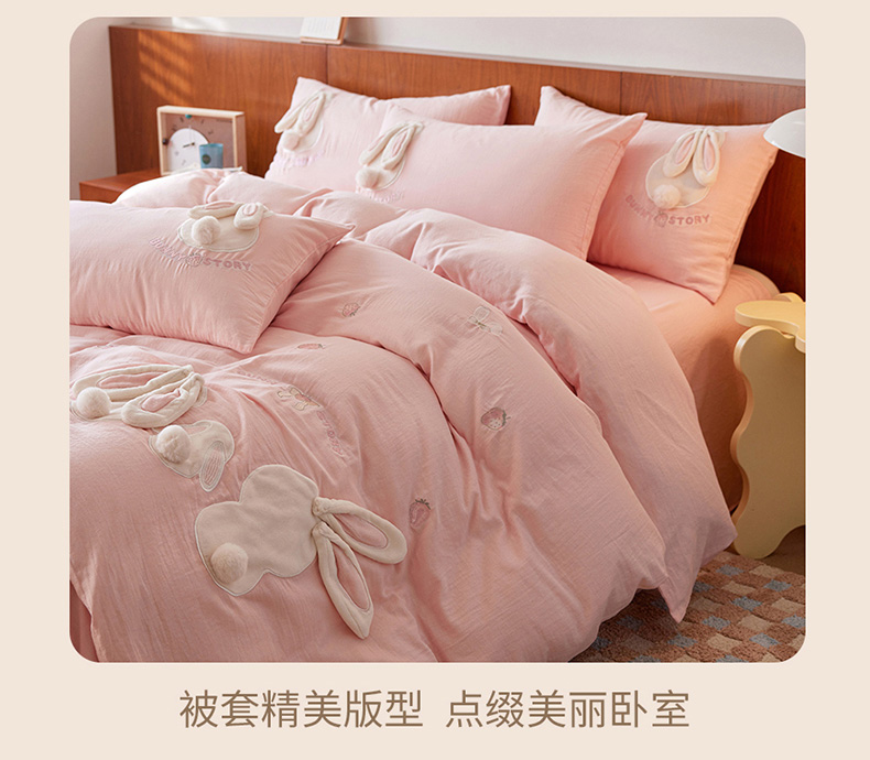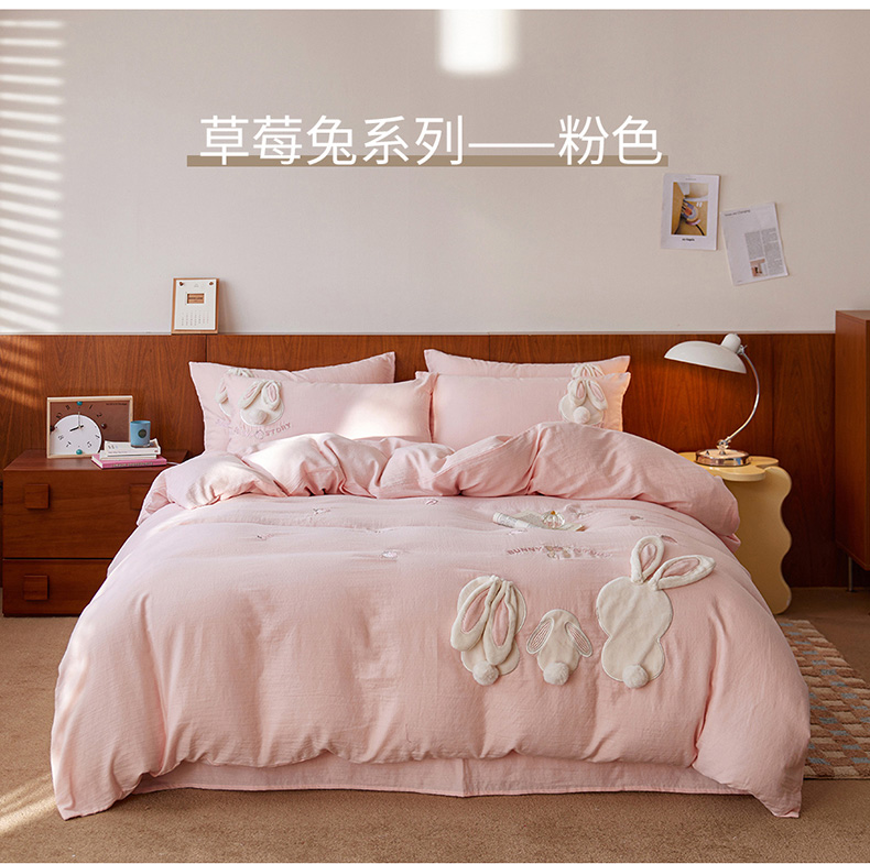 当前位置: 91家纺网 > 商品网购 > 床品套件 > 四件套 > 全棉普通四件套 > 爱缦 2025新款A类全棉水洗双层纱四件套-草莓兔系列(控价298起) 草莓兔-粉色
