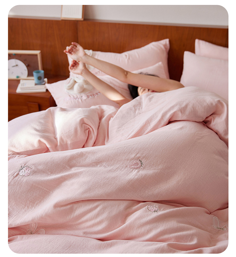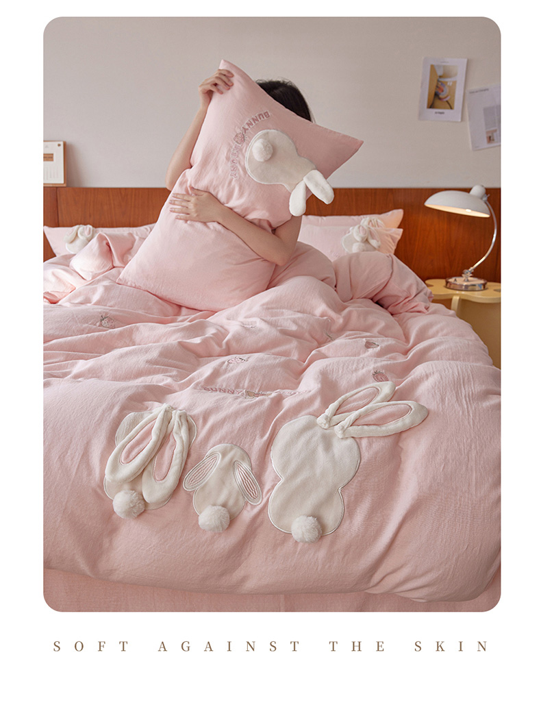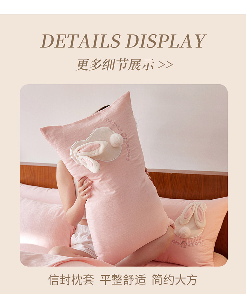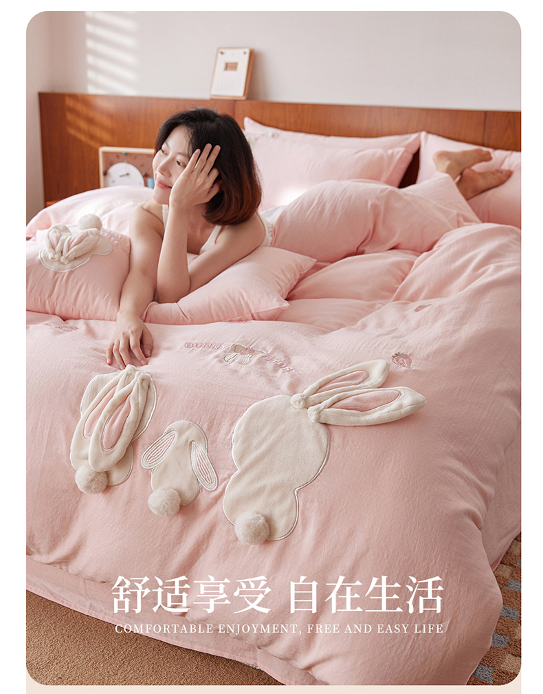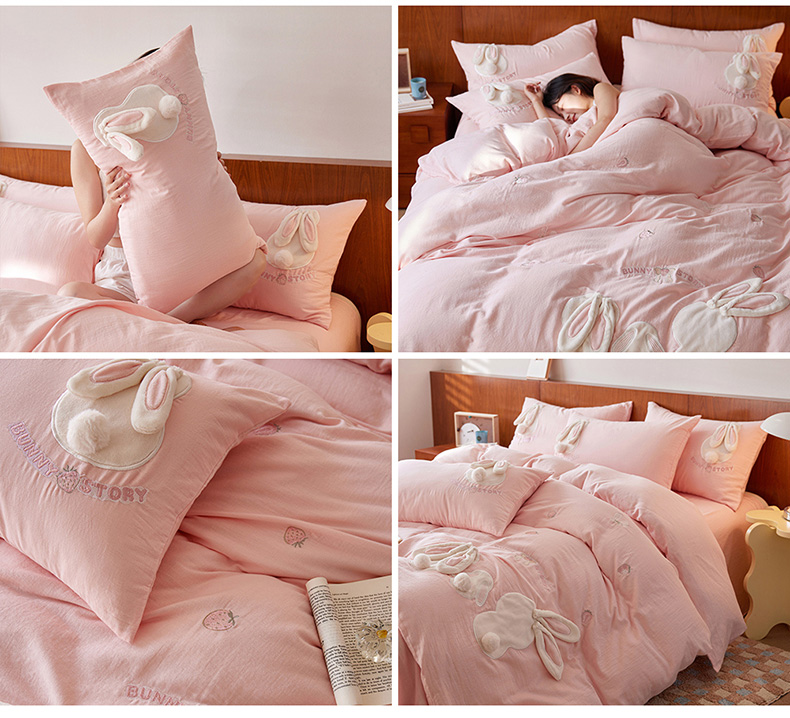 当前位置: 91家纺网 > 商品网购 > 床品套件 > 四件套 > 全棉普通四件套 > 爱缦 2025新款A类全棉水洗双层纱四件套-草莓兔系列(控价298起) 草莓兔-粉色