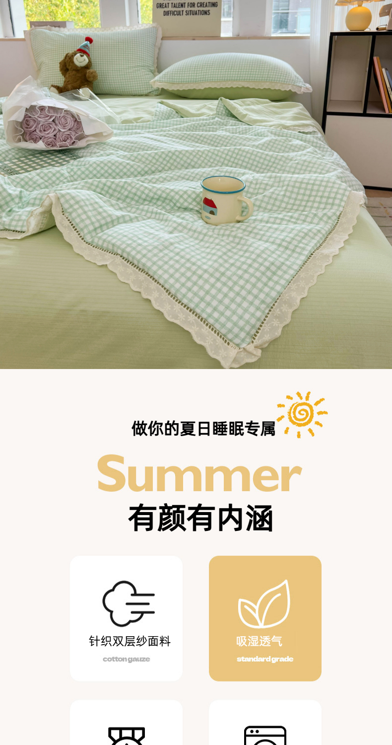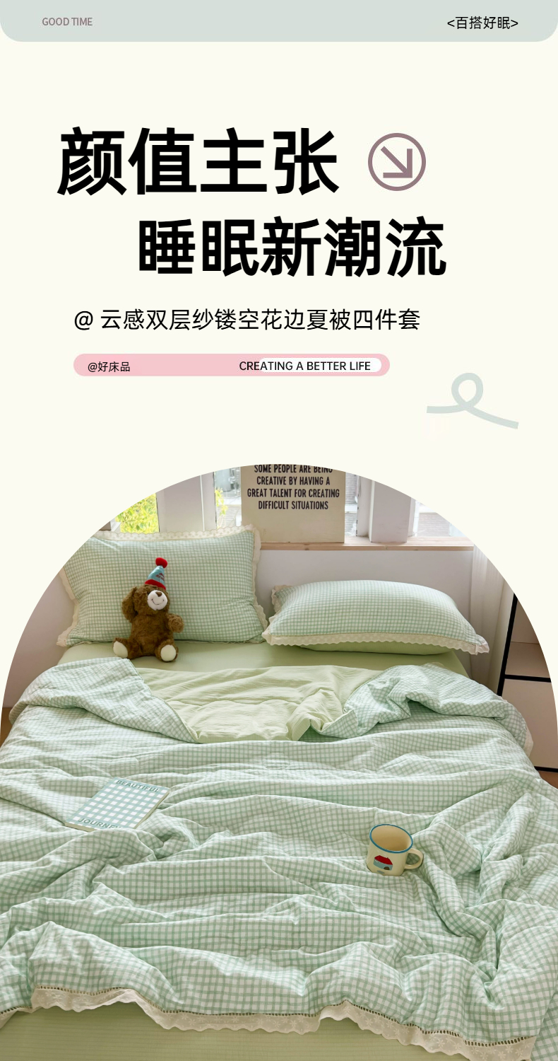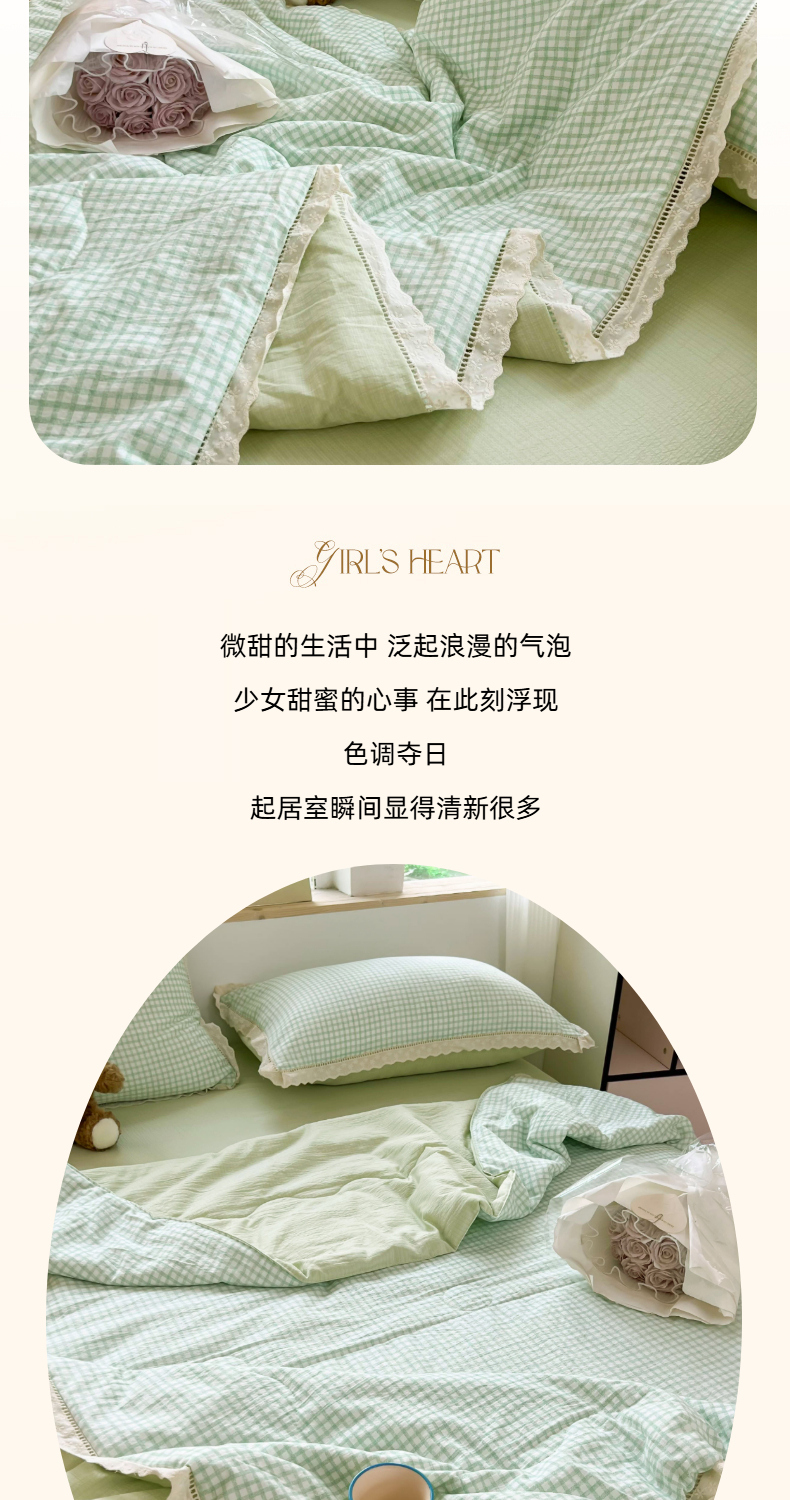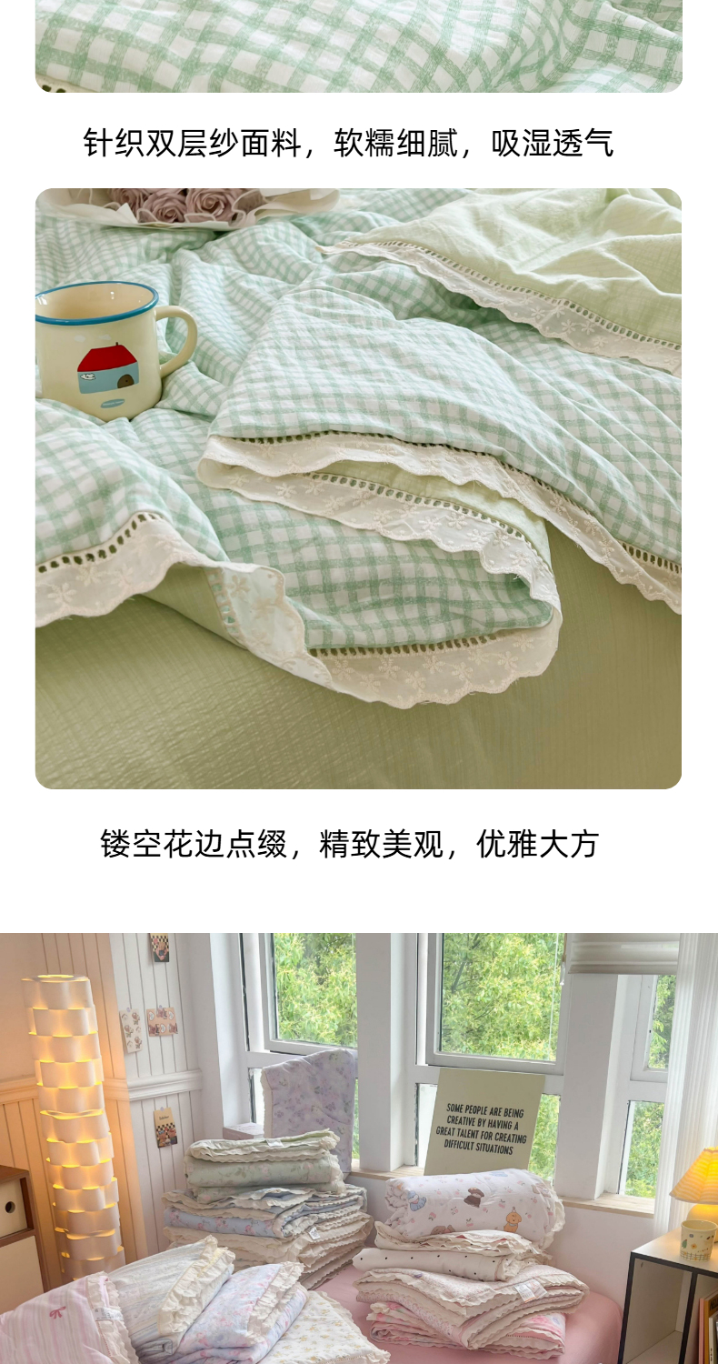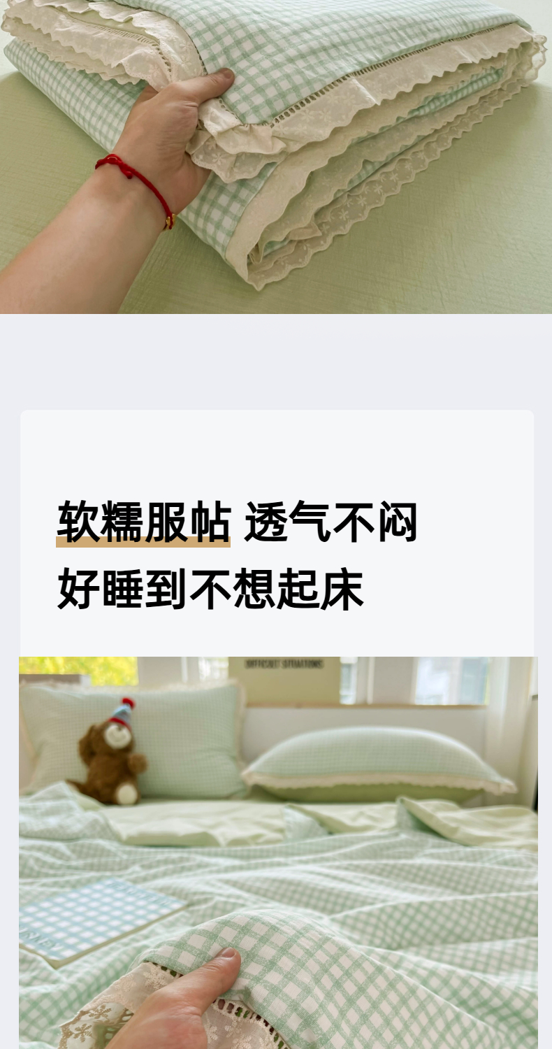 商品名称:温眠家纺 2025新款云感双层纱镂空花边夏被四件套 小绿格