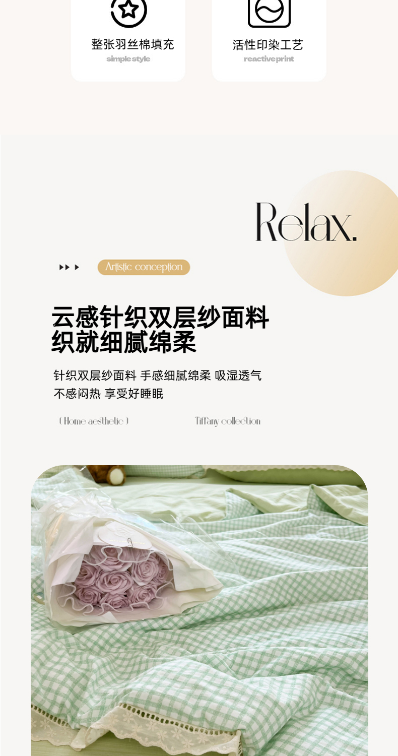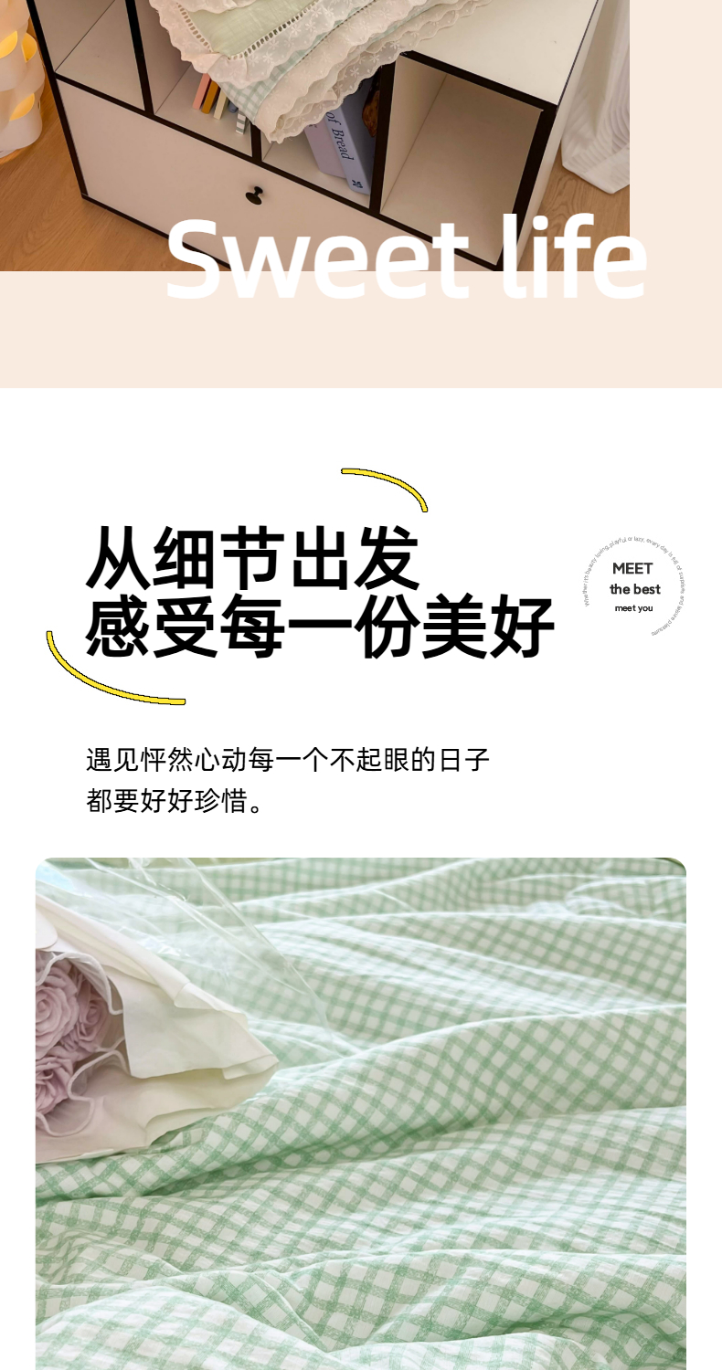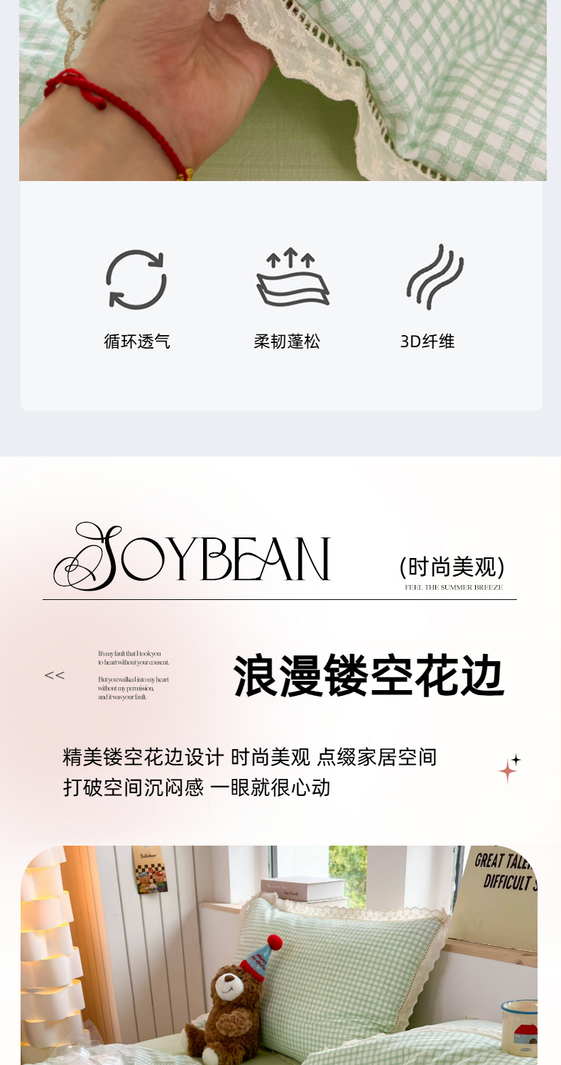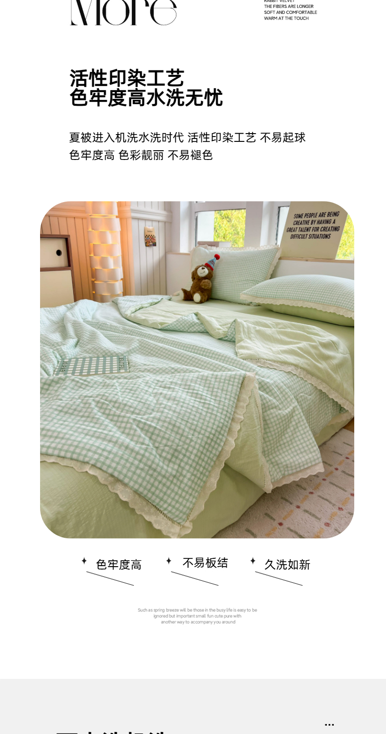 商品名称:温眠家纺 2025新款云感双层纱镂空花边夏被四件套 小绿格