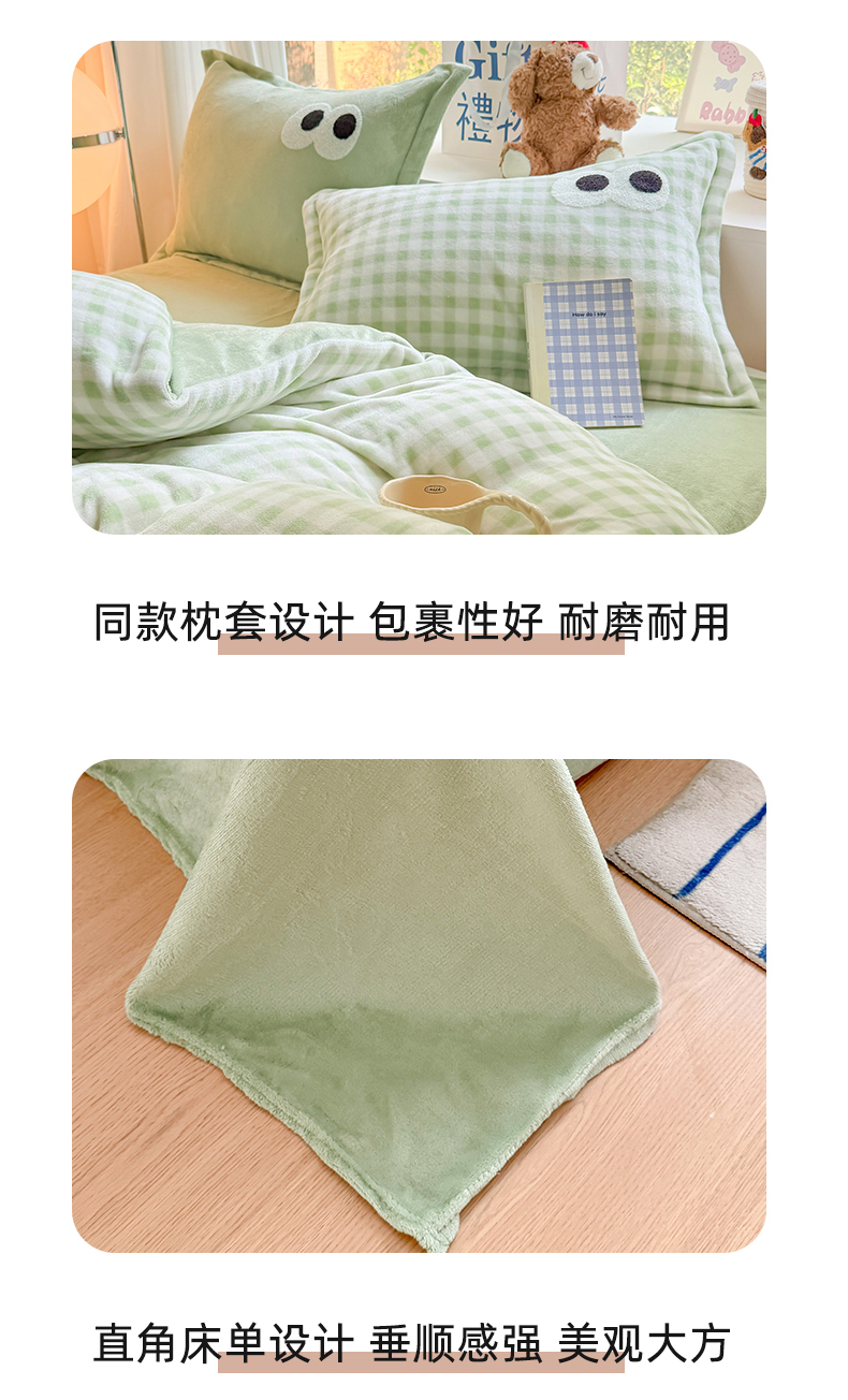 商品名称:温眠家纺 2025新款ins加厚毛巾绣大眼睛混搭撞色奶油格子牛奶绒四件套 绒-绿格