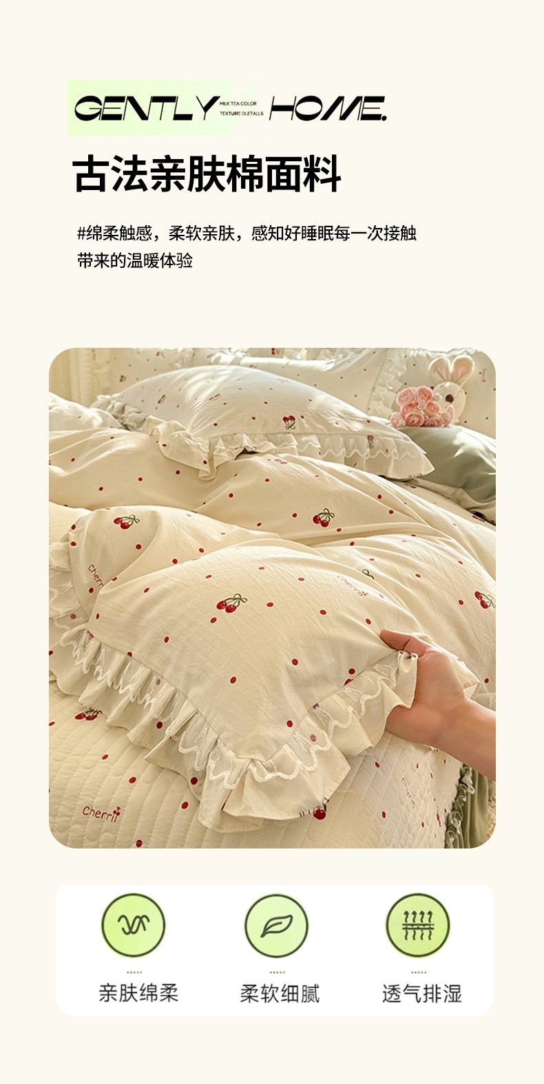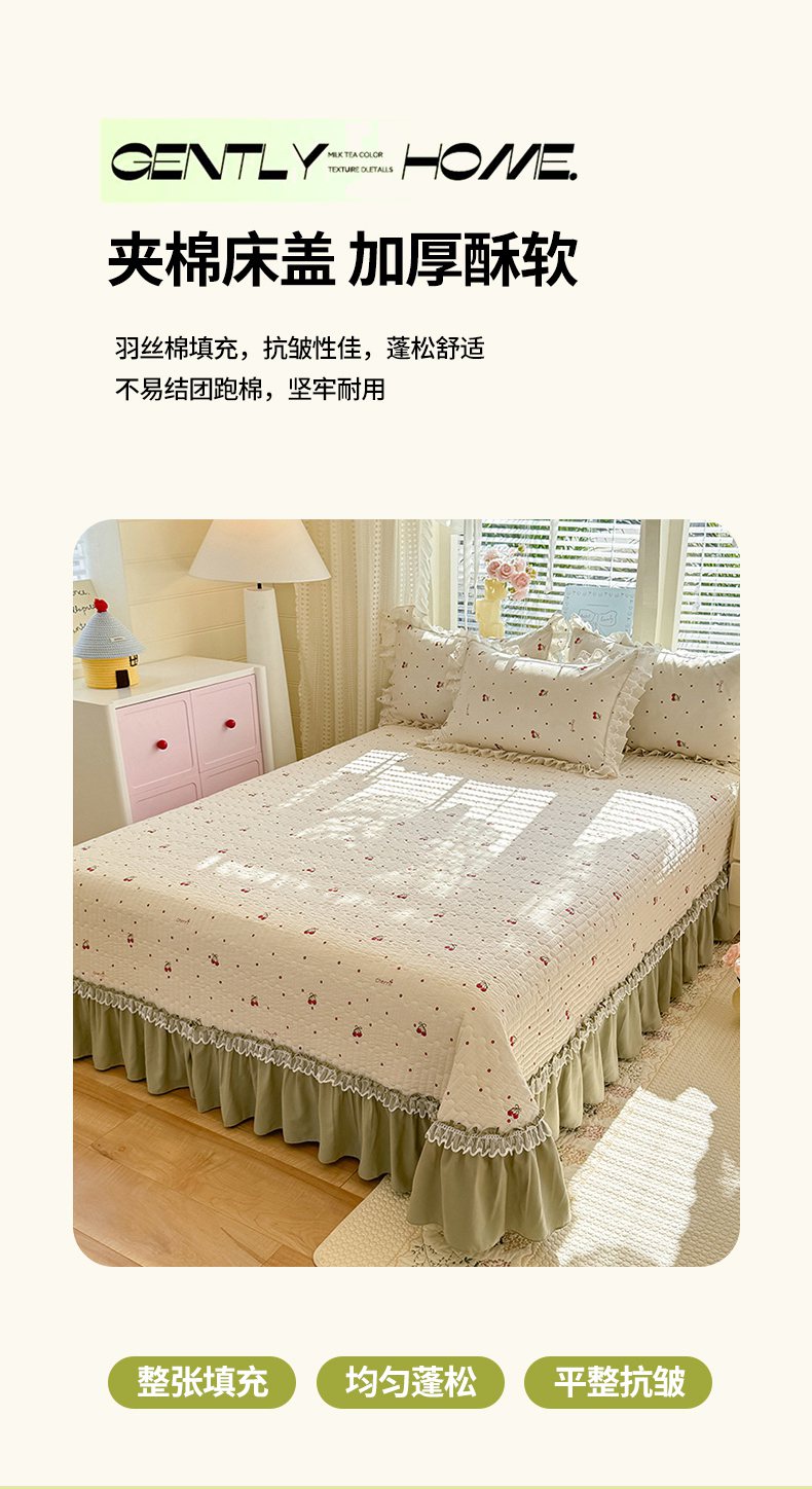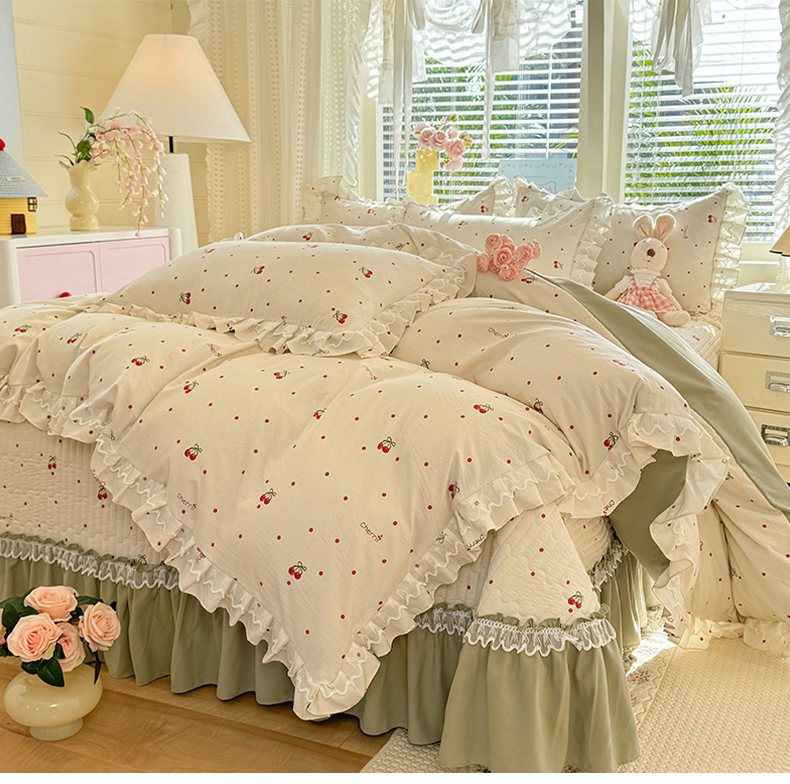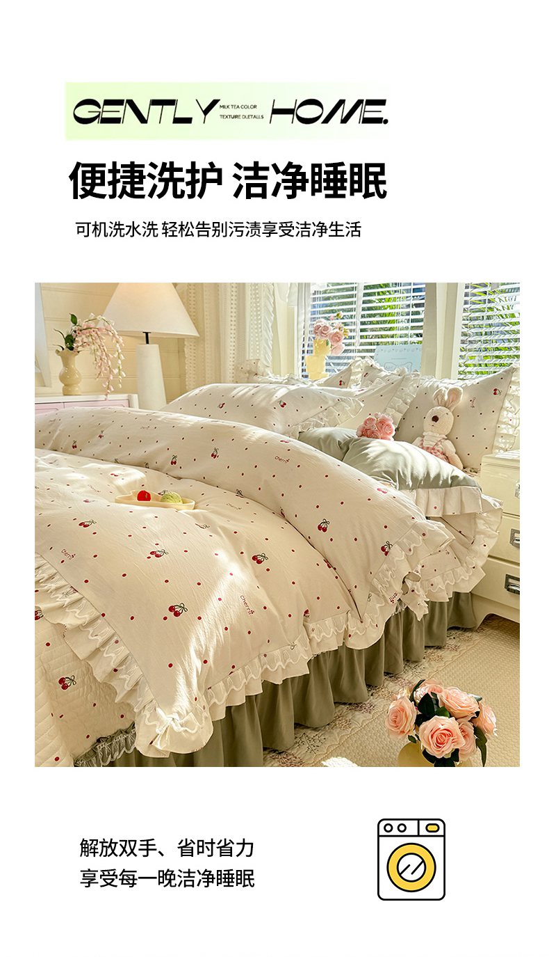 当前位置: 91家纺网 > 商品网购 > 床品套件 > 四件套 > 其它四件套 > 韩约家纺 2026新款韩式双层花边古法棉感床盖四件套 甜心樱桃
