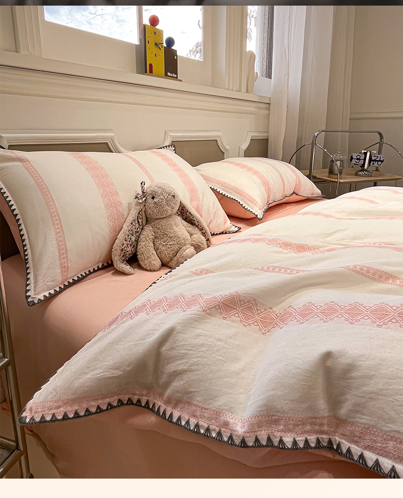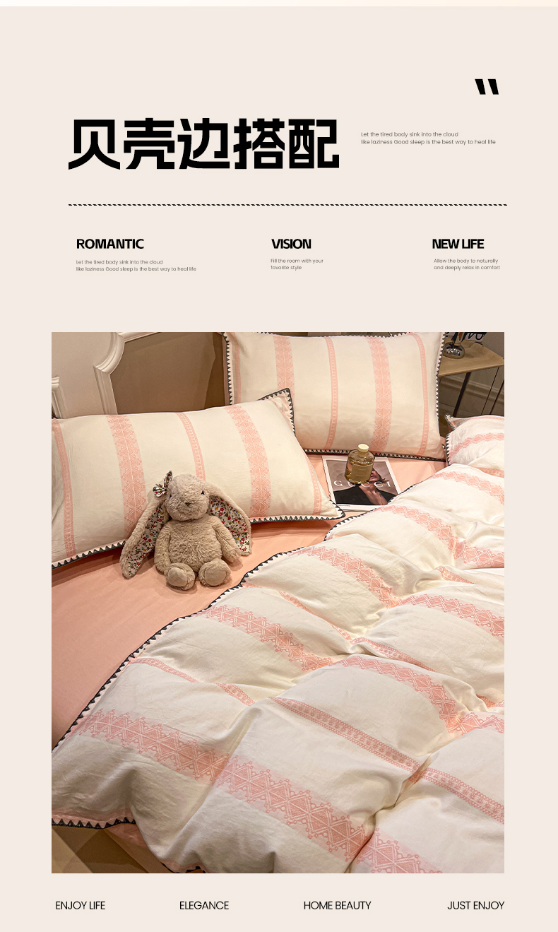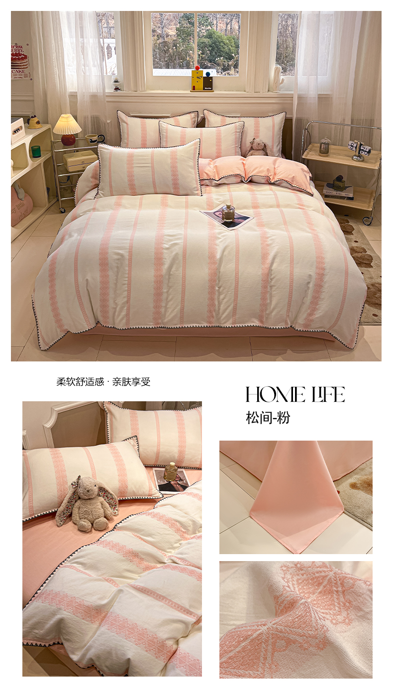 当前位置: 91家纺网 > 商品网购 > 床品套件 > 四件套 > 全棉普通四件套 > 莱茵家居 2026新款A类全棉纯棉色织大提花贝壳边四件套-序语松间系列 松间-粉