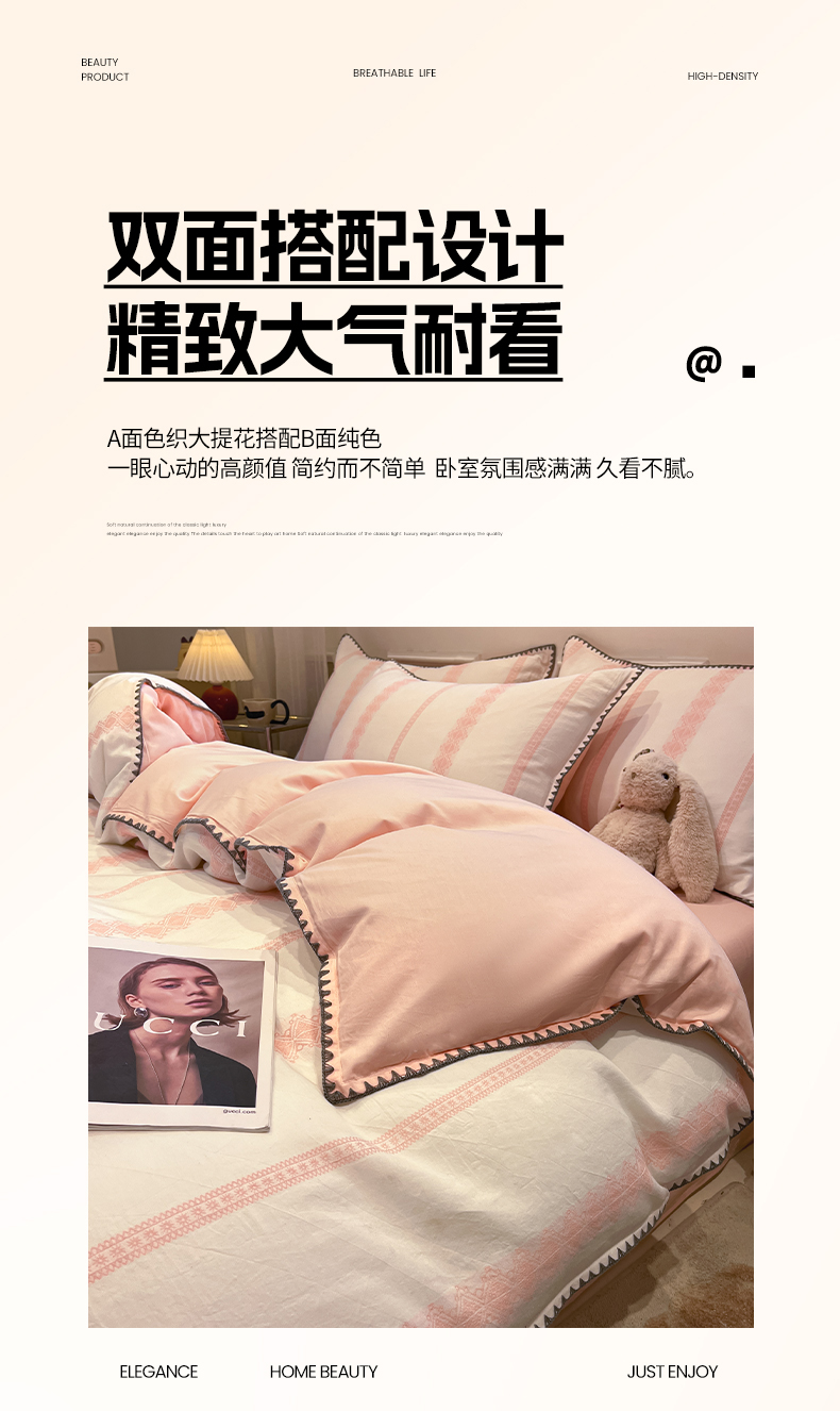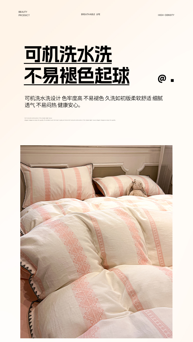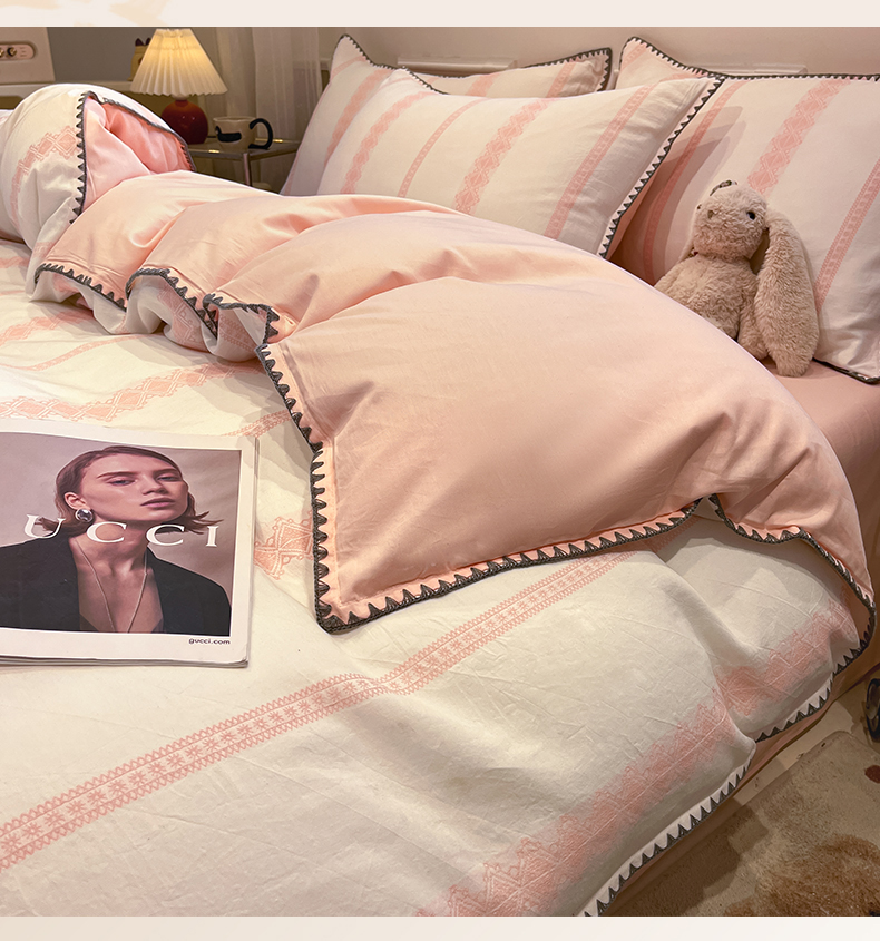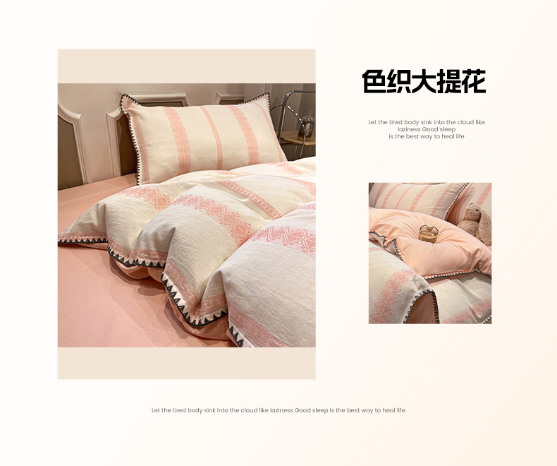 当前位置: 91家纺网 > 商品网购 > 床品套件 > 四件套 > 全棉普通四件套 > 莱茵家居 2026新款A类全棉纯棉色织大提花贝壳边四件套-序语松间系列 松间-粉