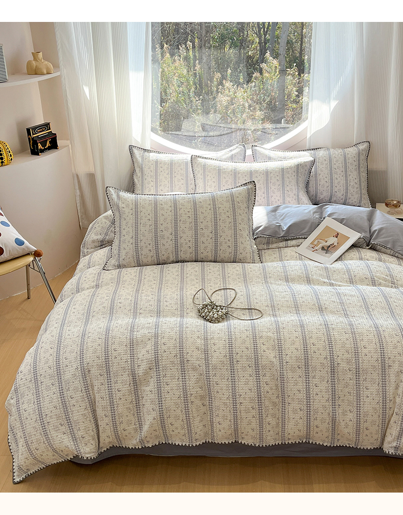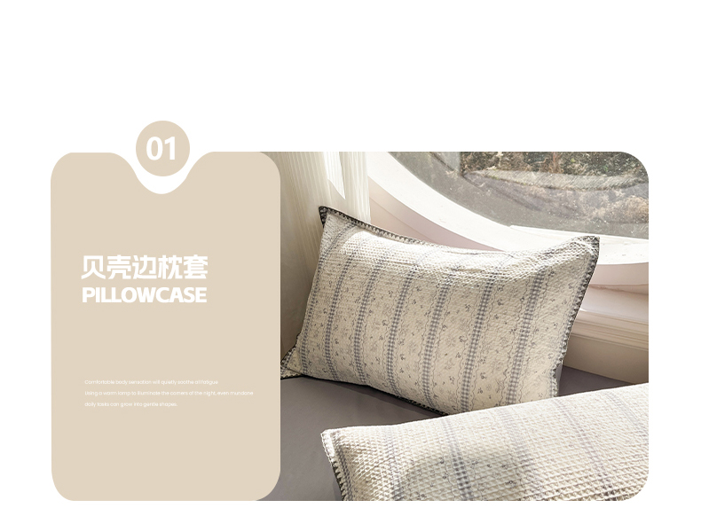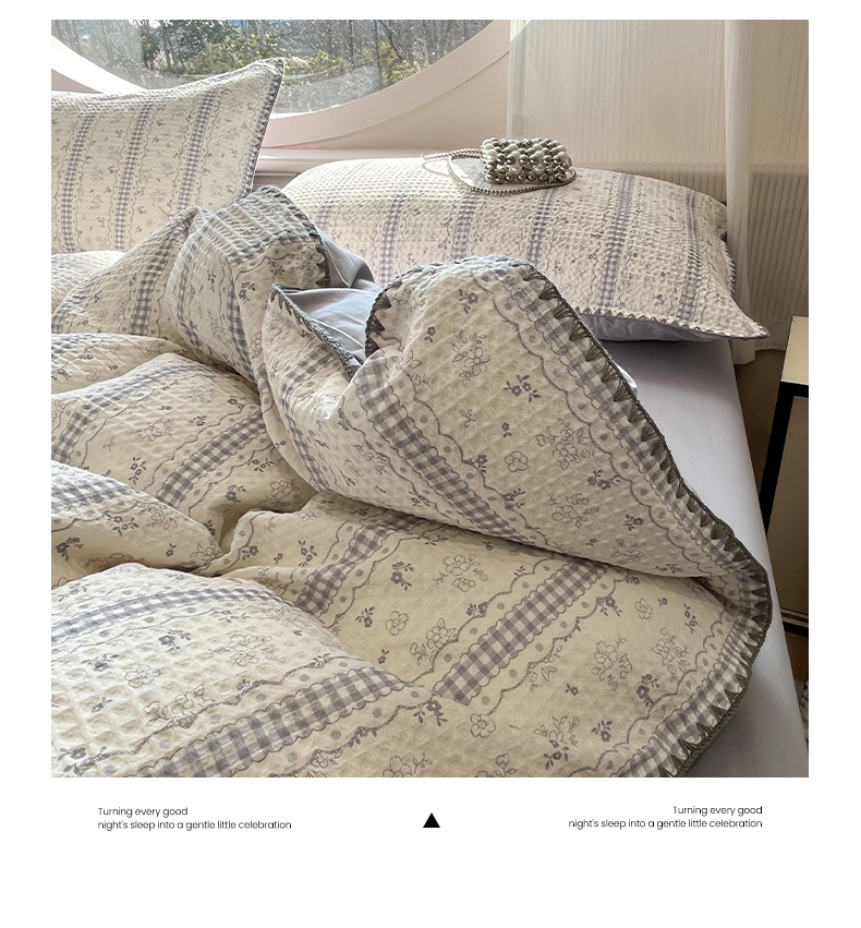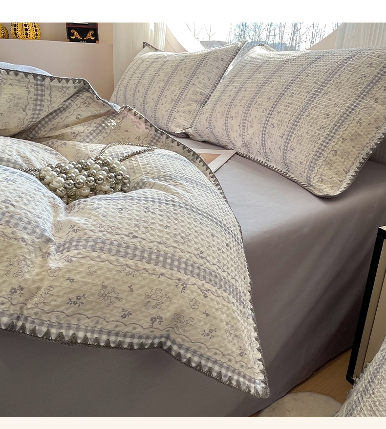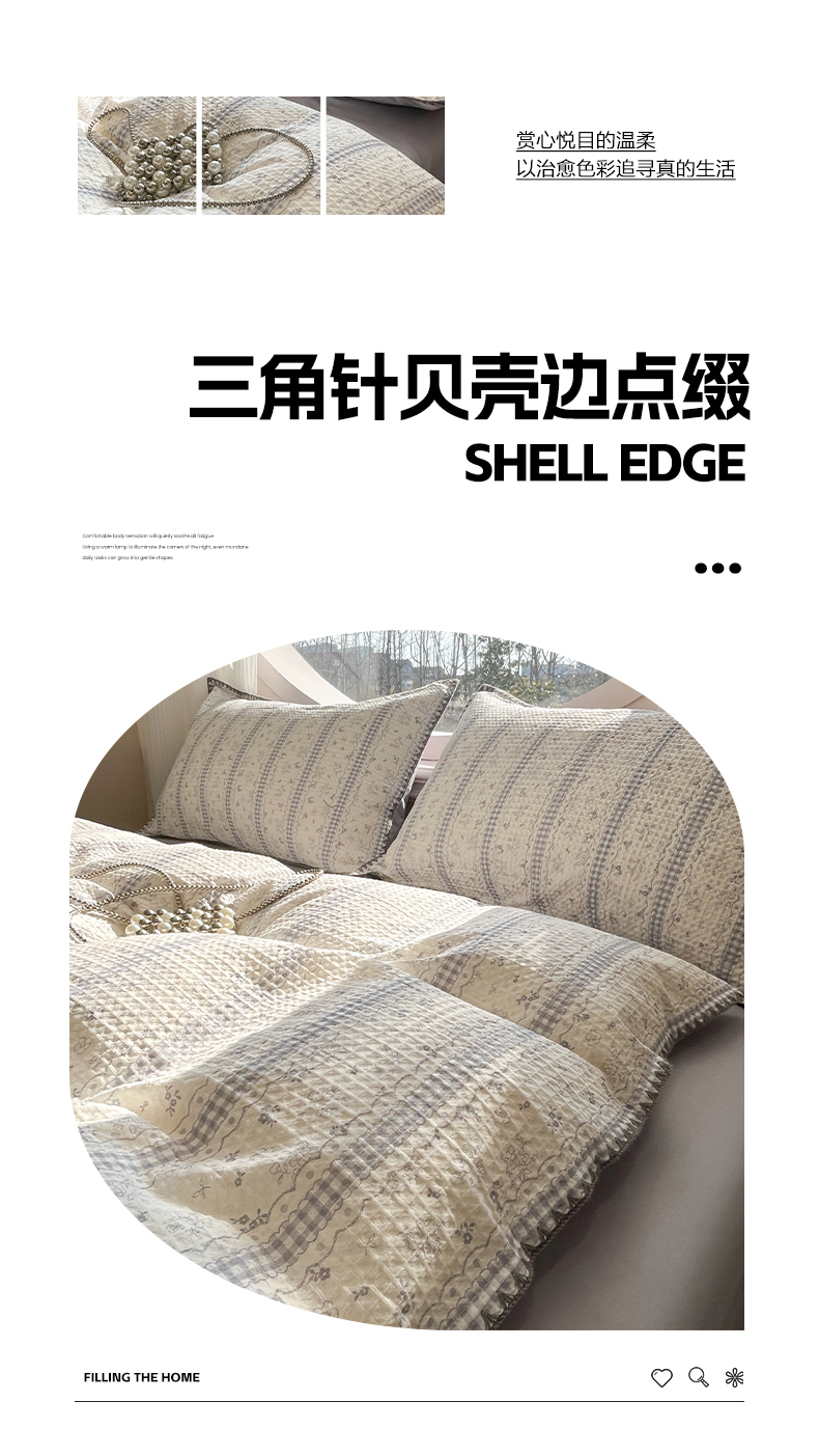 当前位置: 91家纺网 > 商品网购 > 床品套件 > 四件套 > 全棉普通四件套 > 莱茵家居 2026新款A类全棉华夫格印花贝壳边套件-华夫系列 华夫-丁香