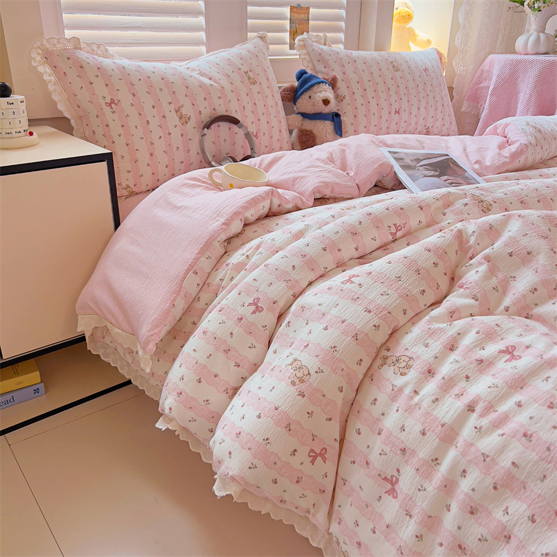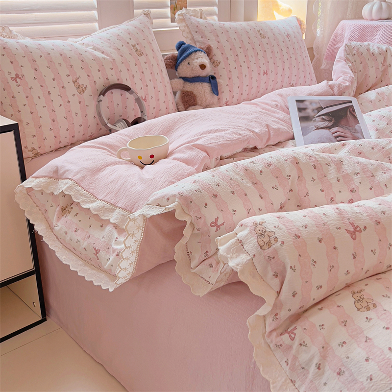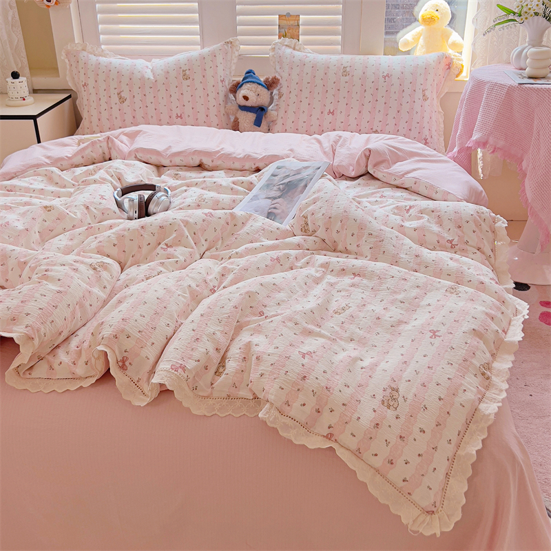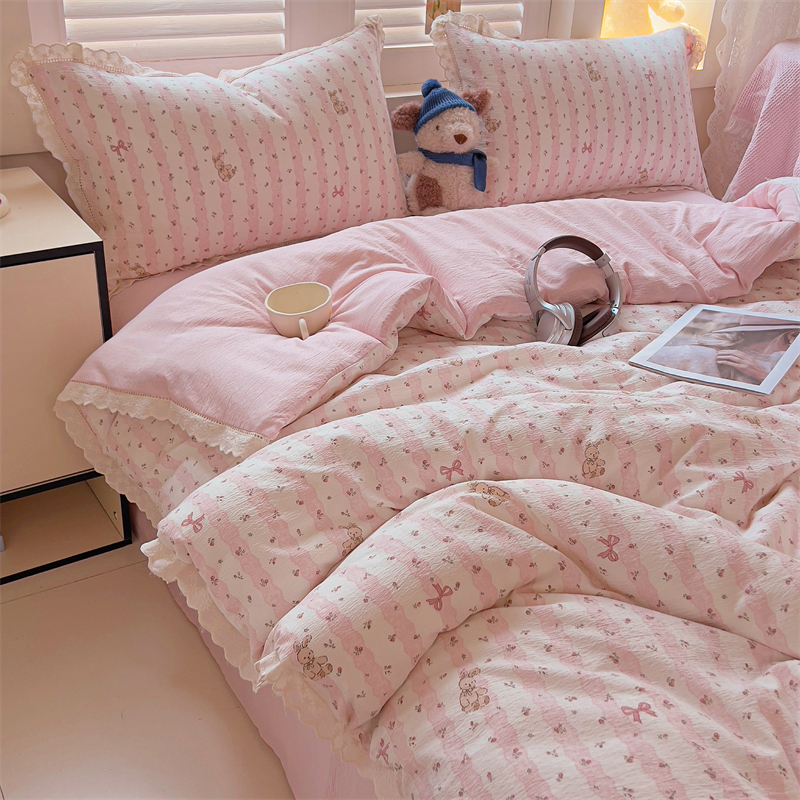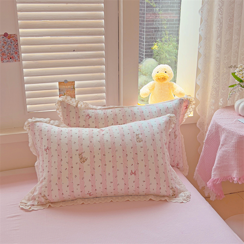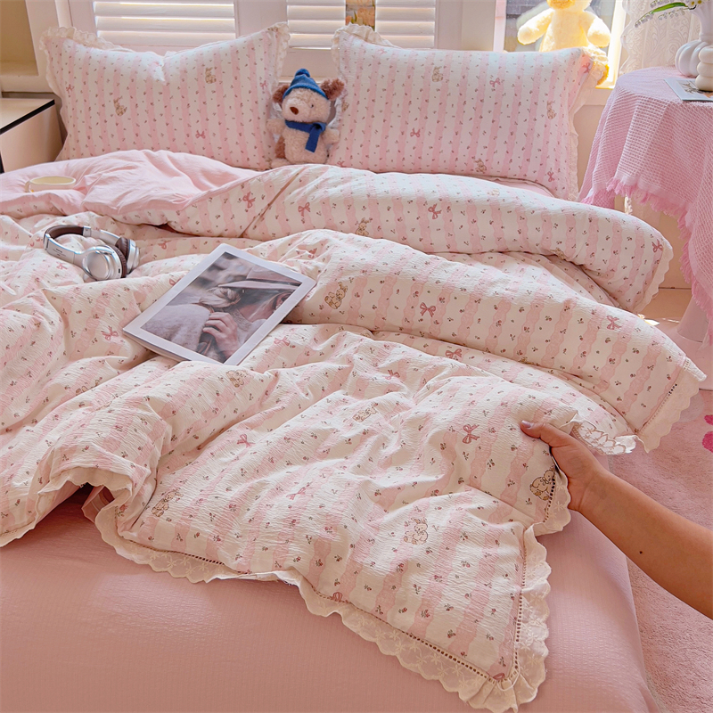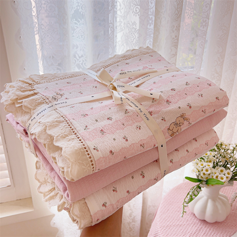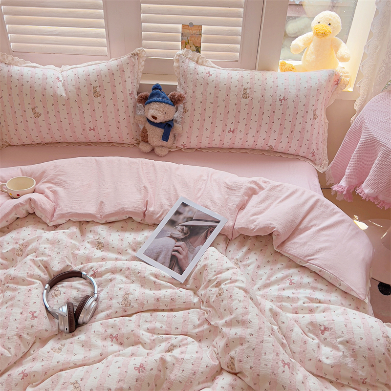 壹号库家纺 2026新款云感木棉皱皱纱双层纱四件套-全棉花边款 蕾丝小兔