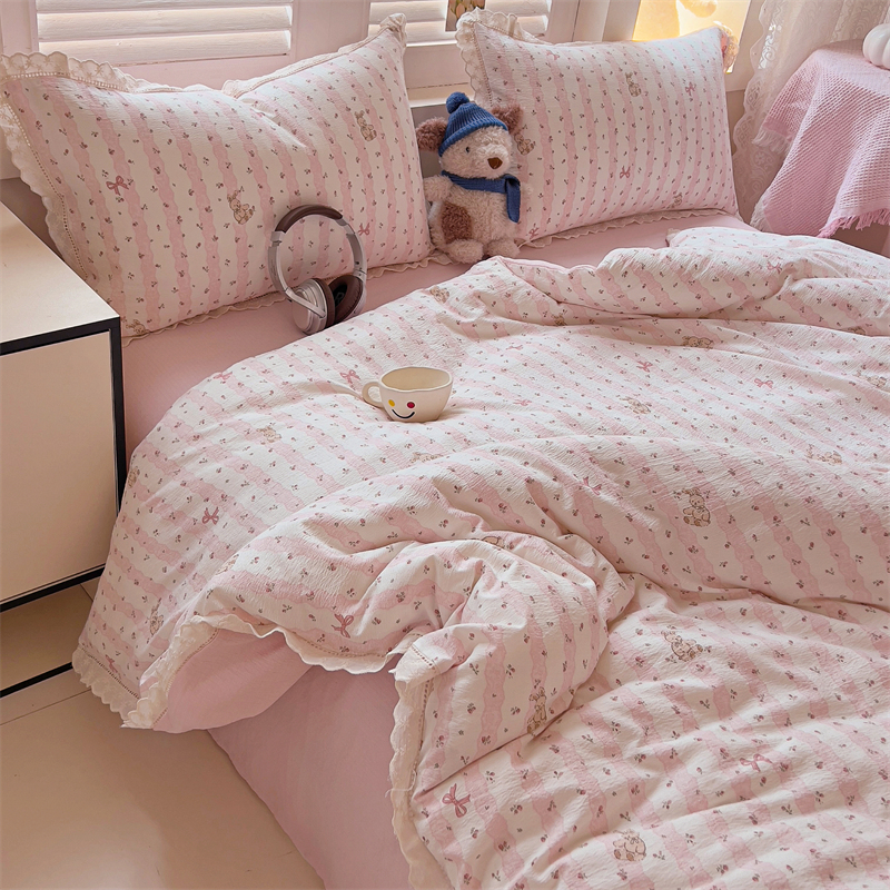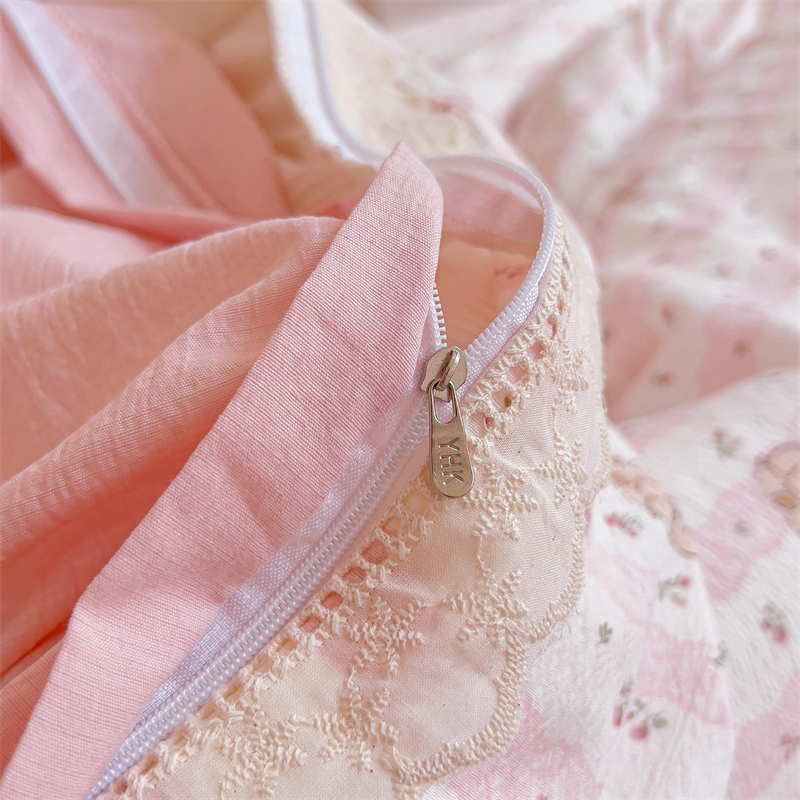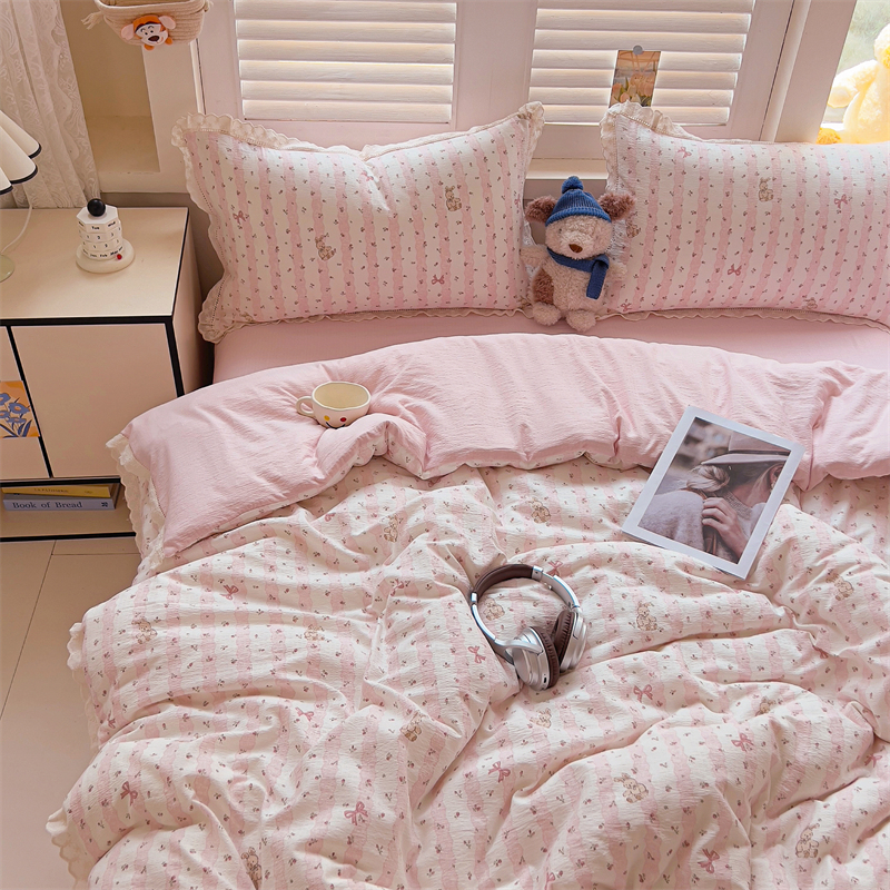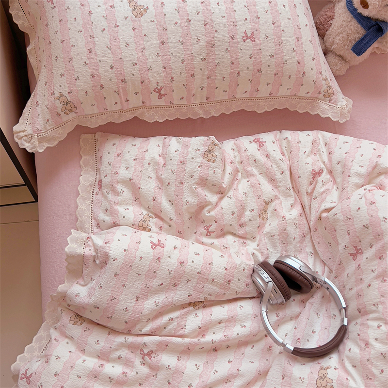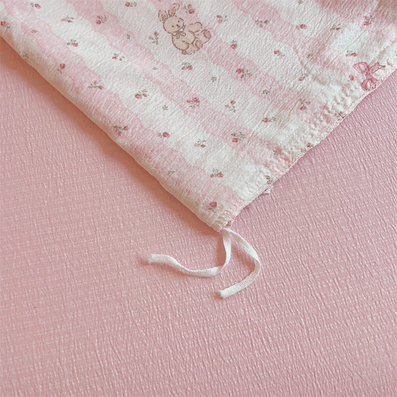 商品名称:壹号库家纺 2026新款云感木棉皱皱纱双层纱四件套-全棉花边款 蕾丝小兔