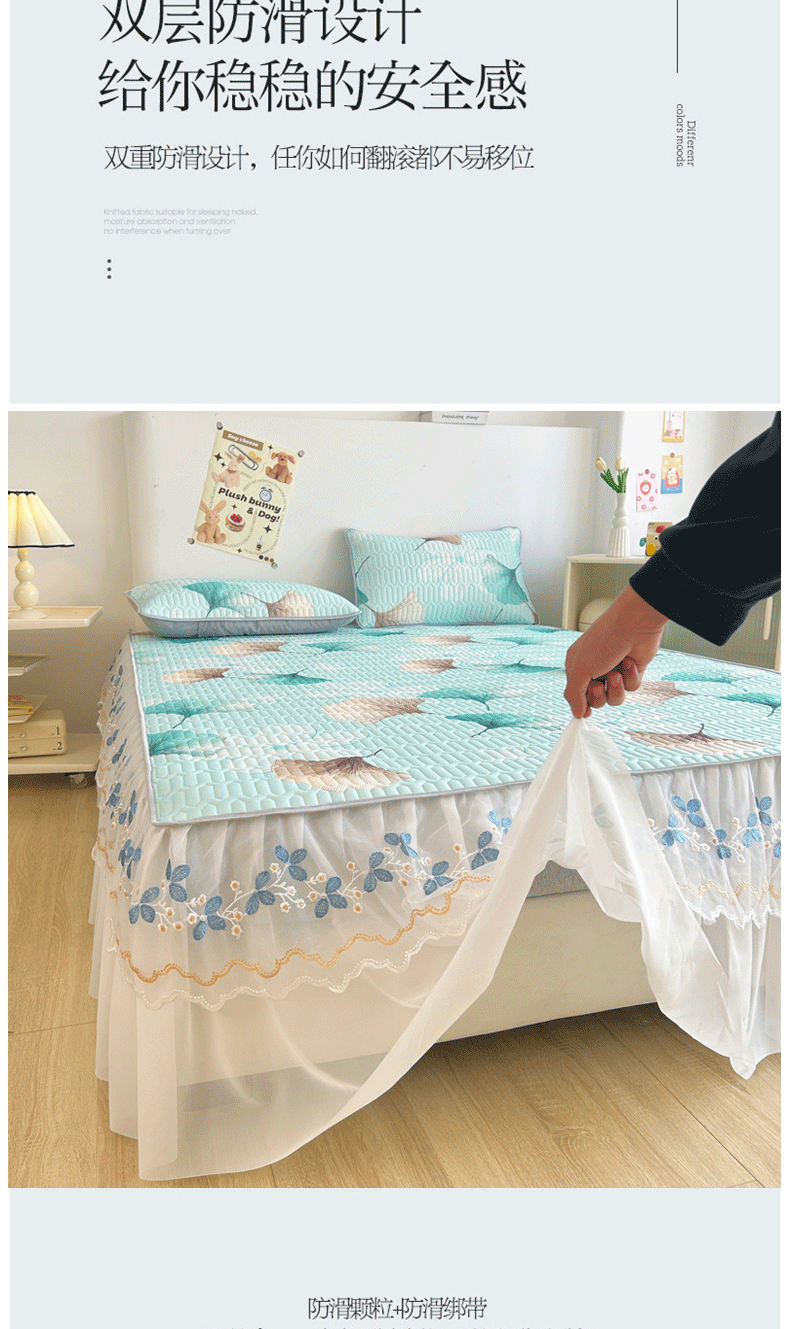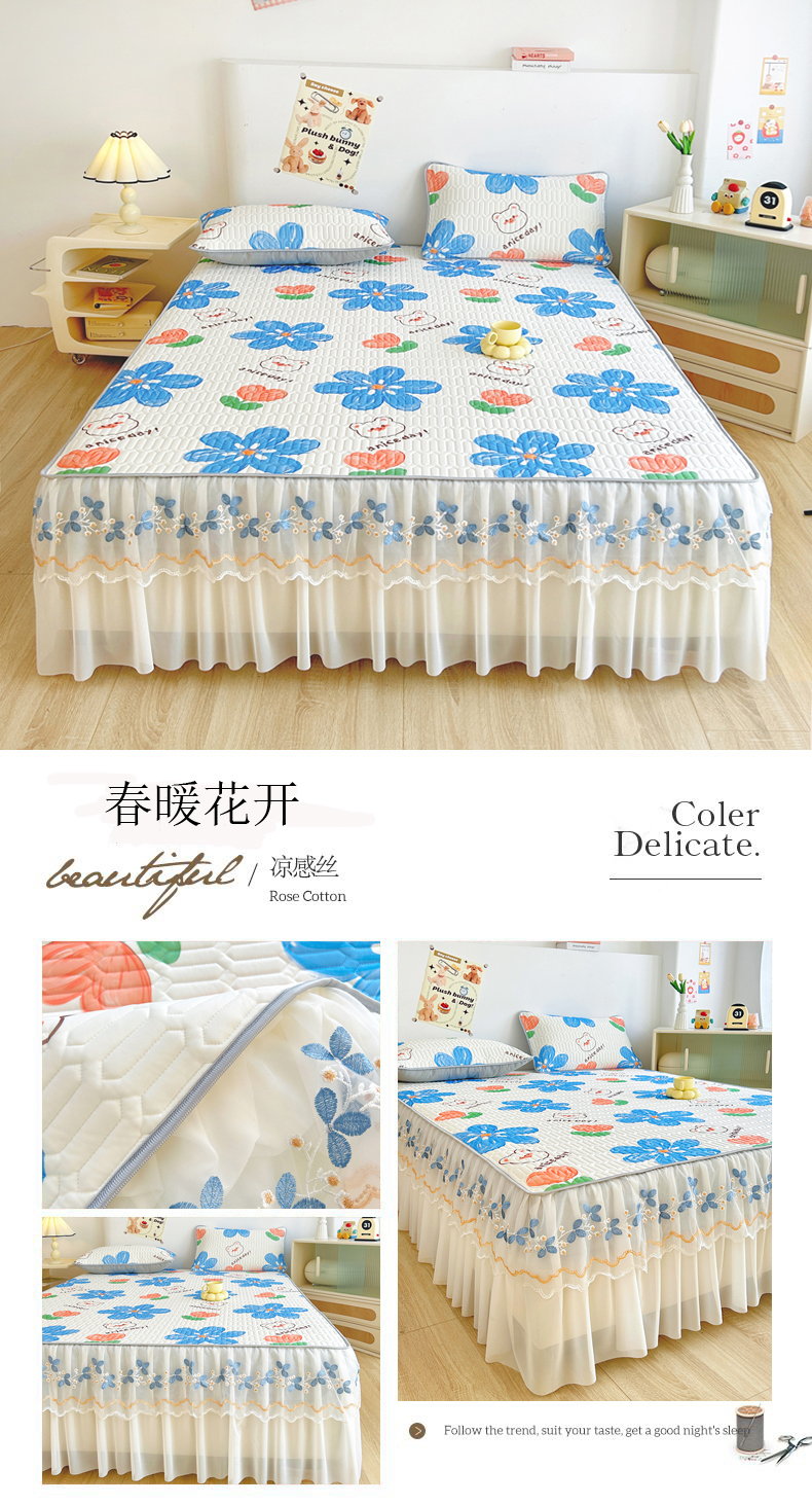 (总)能好家纺 2026春夏新款纯色+印花凉感丝乳胶凉席床裙款三件套,薄荷绿,豆沙,灰色,酒红,孔雀蓝,墨绿,雪青,棕色,古韵,小熊,雅韵,幽梦