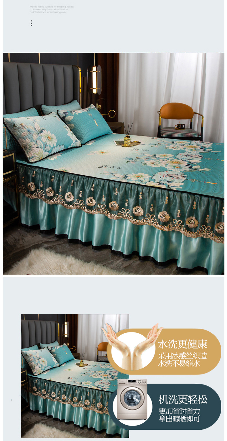 商品名称:能好家纺 2026春夏新款纯色+印花凉感丝乳胶凉席床裙款三件套 古韵
