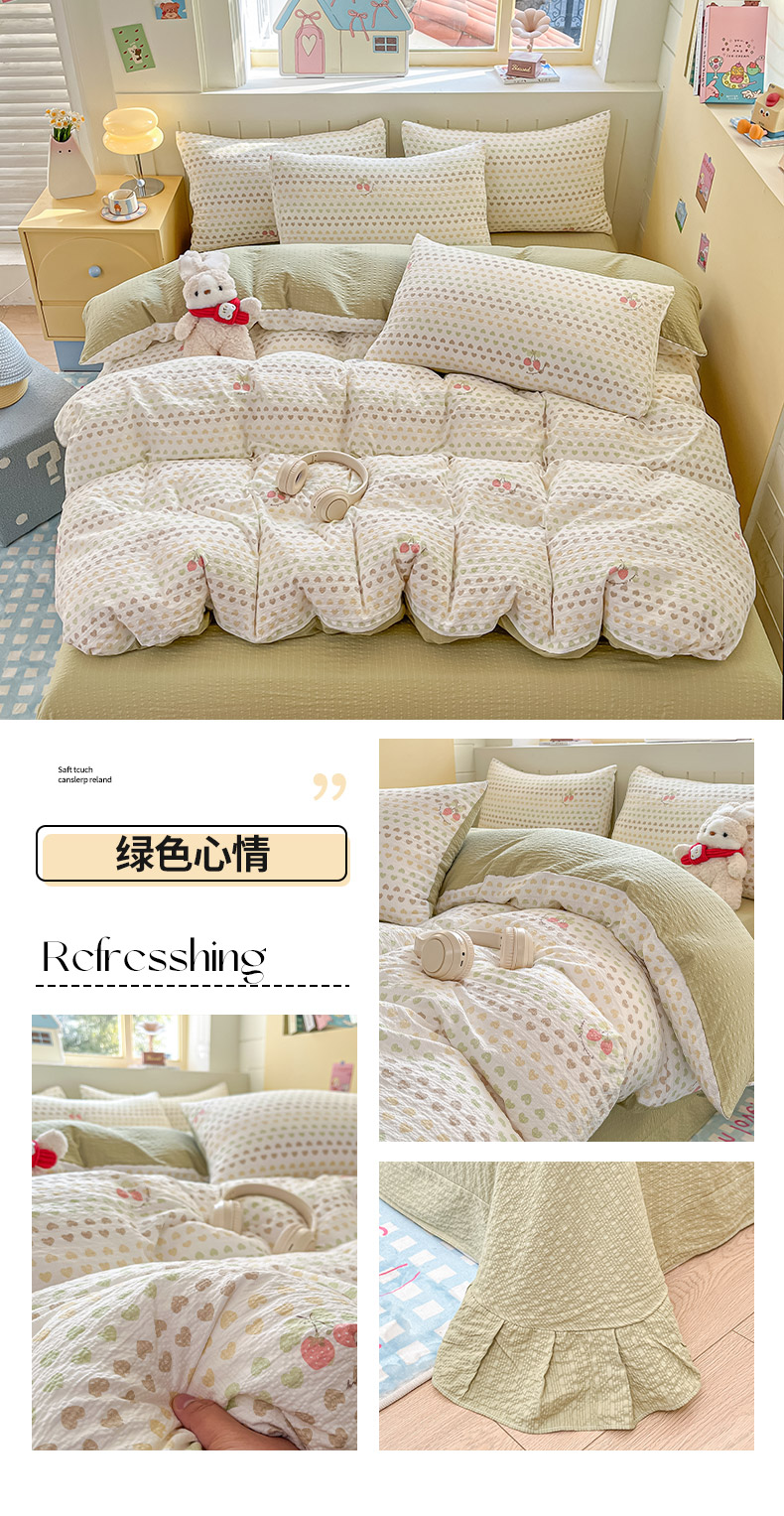 当前位置: 91家纺网 > 商品网购 > 床品套件 > 四件套 > 其它四件套 > 金梦拉家纺 2026新款A类高品质高克重超柔泡芙纱泡泡纱小清新四件套 绿色心情