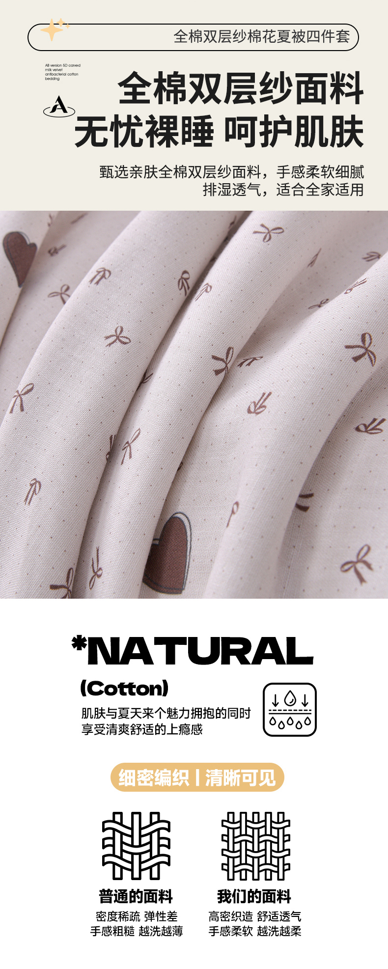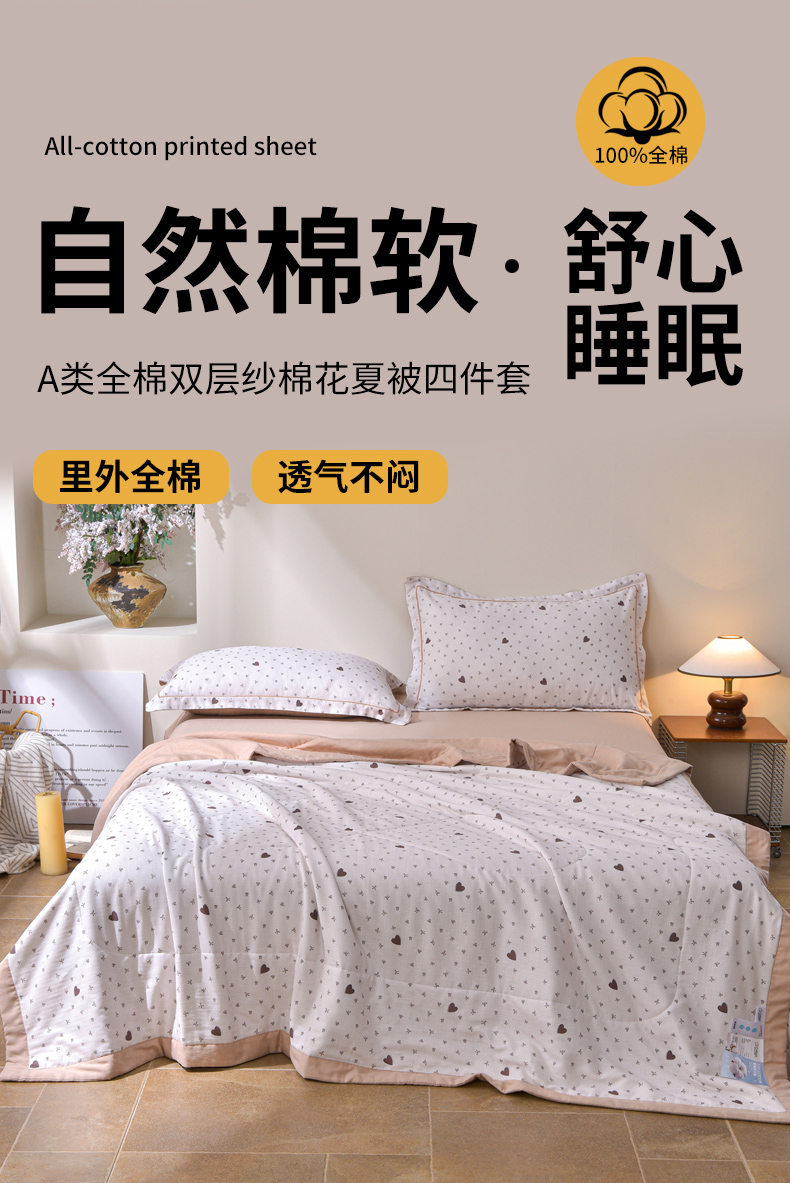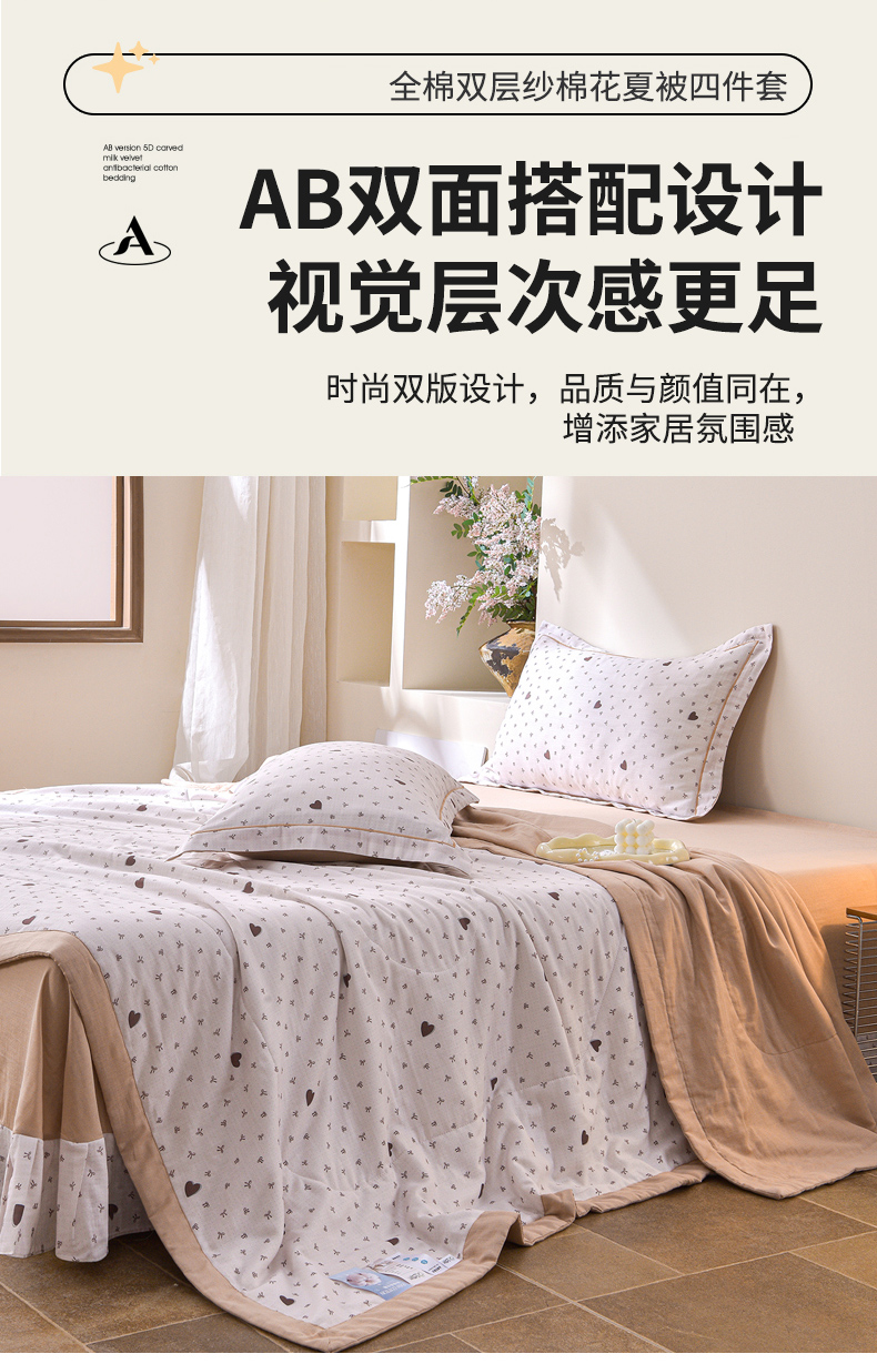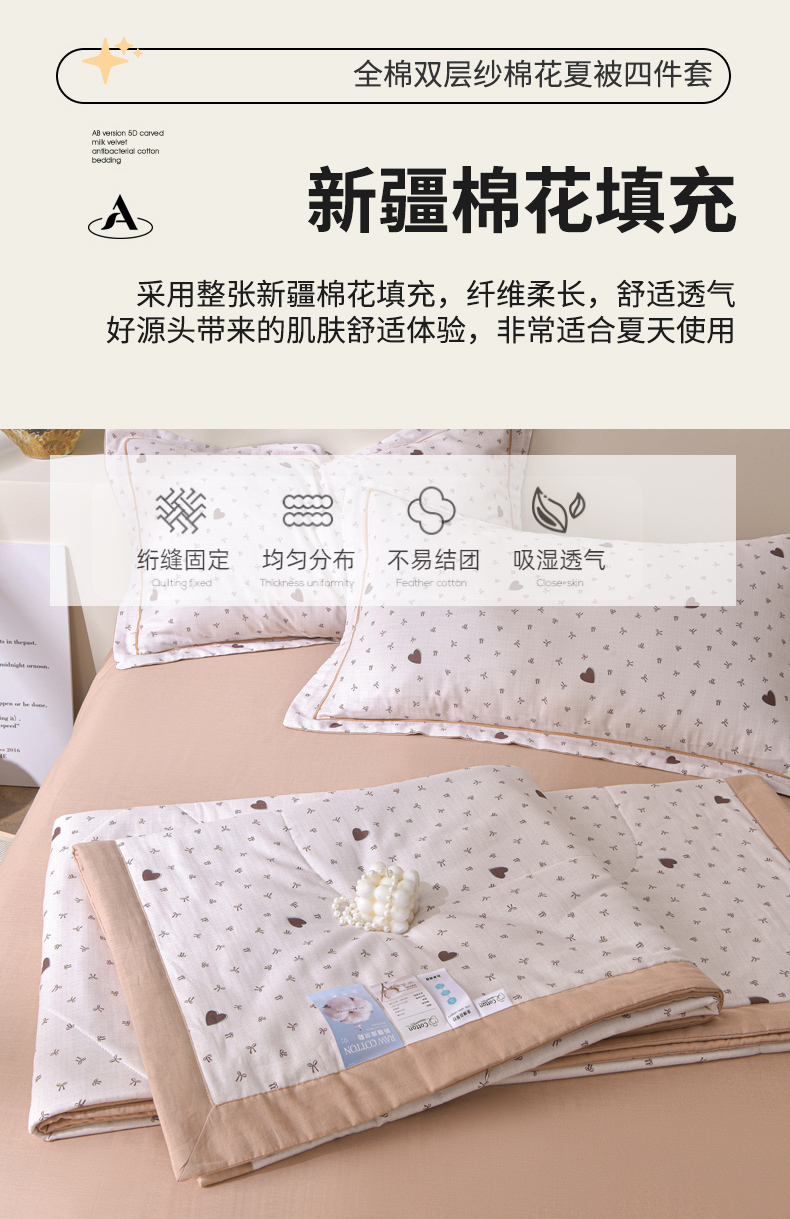 • 91家纺网 家纺一手货源 找家纺 金昱纺 2026新款A类全棉双层纱新疆棉花夏被四件套(带检测报告,包检测,有微信+买家秀) 甜心结-咖