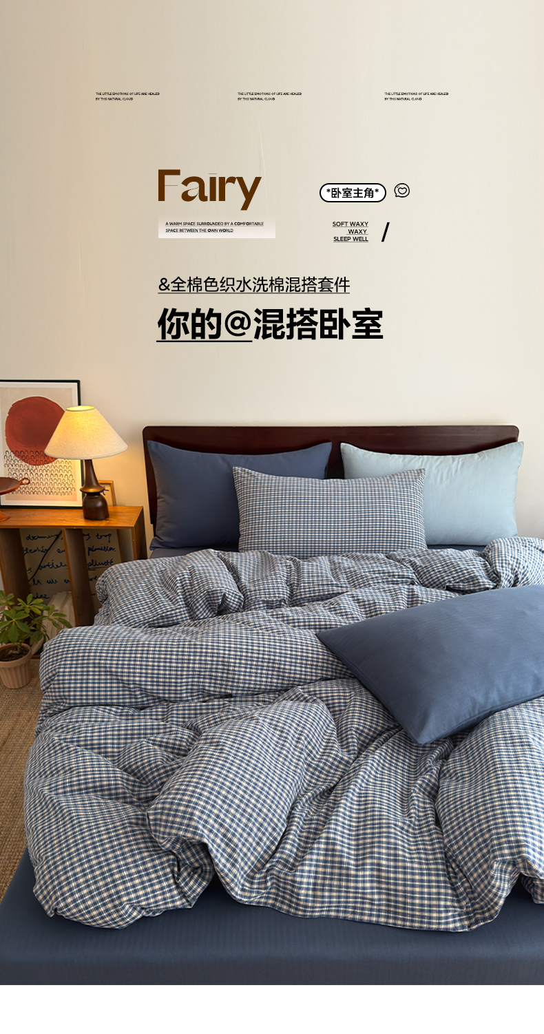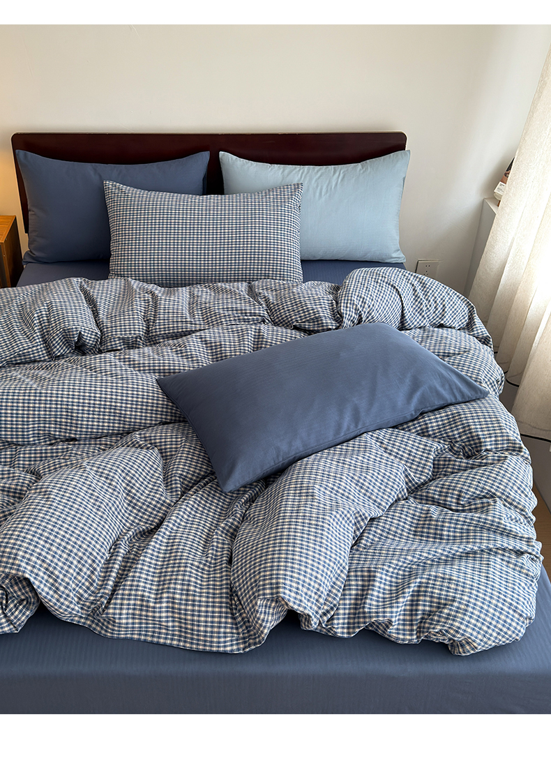 当前位置: 91家纺网 > 商品网购 > 床品套件 > 四件套 > 全棉普通四件套 > 玖弘家居 2026新款全棉色织水洗棉人字纹格子混搭四件套系列 海军蓝+海兰