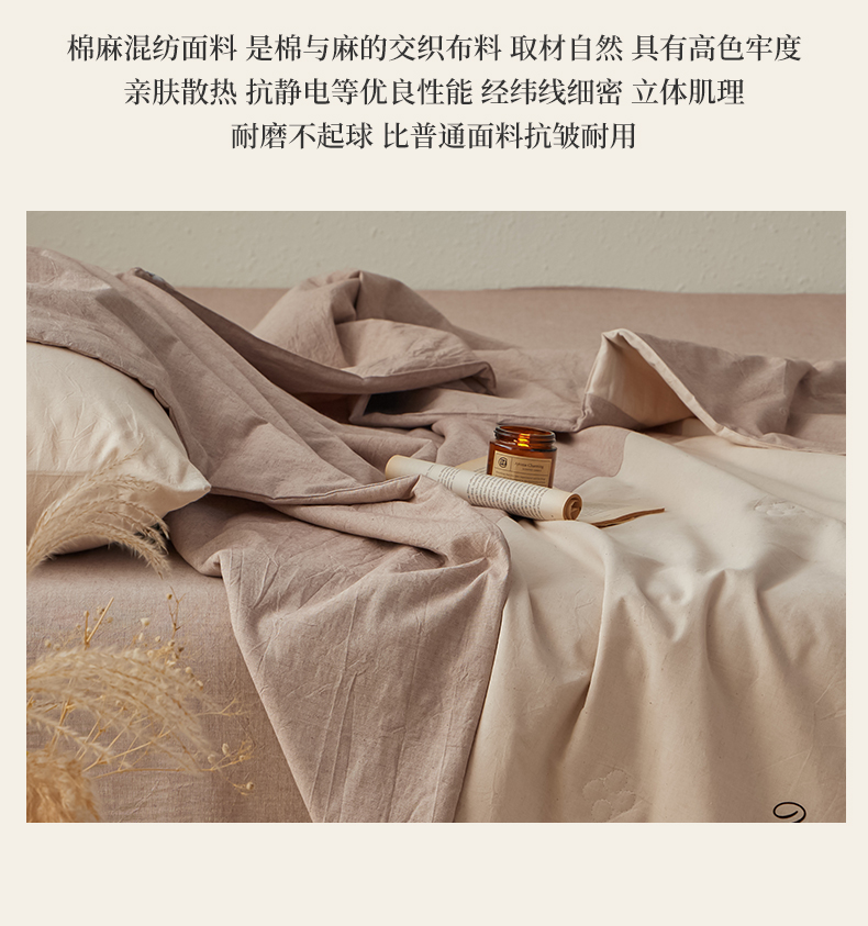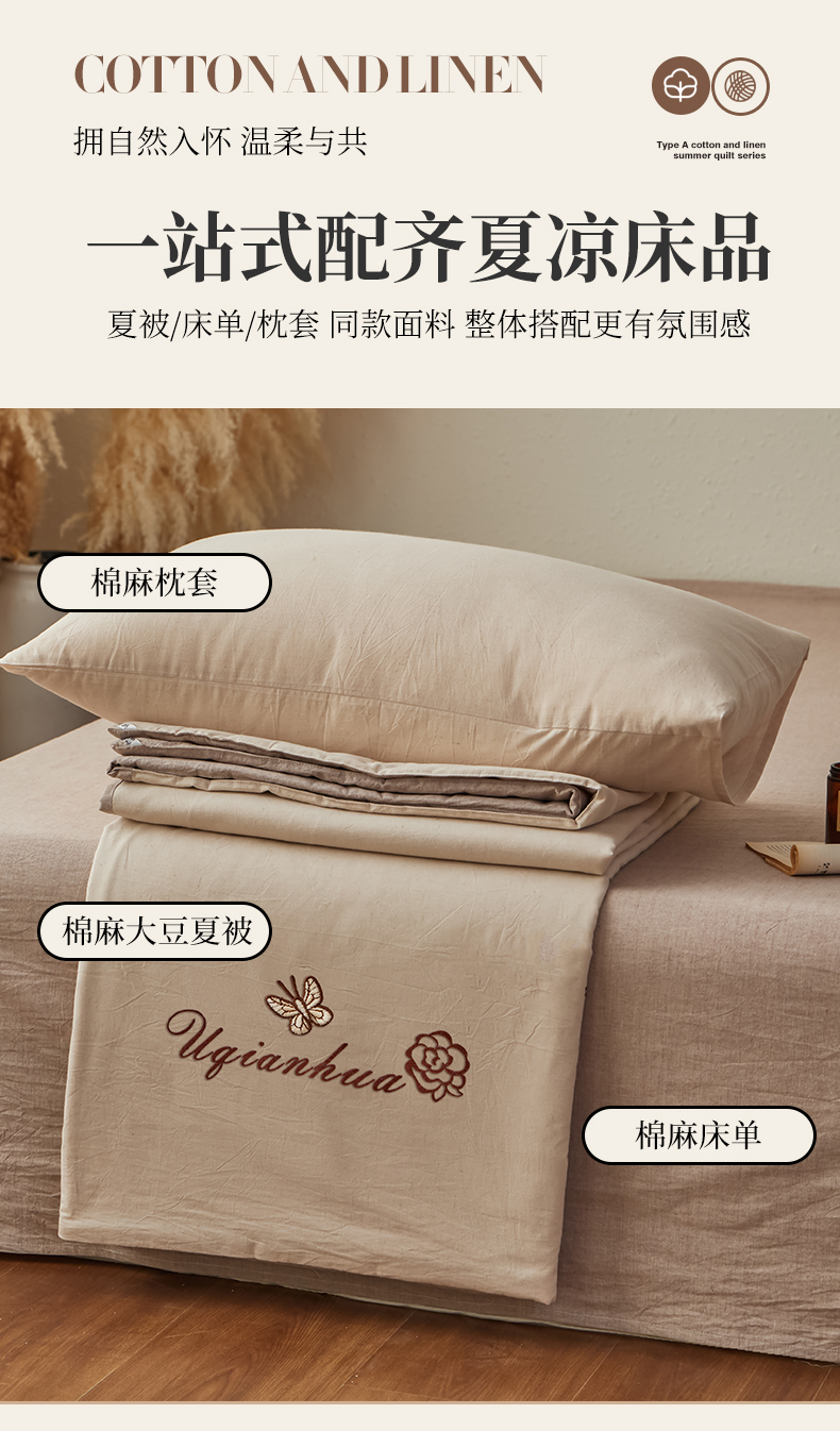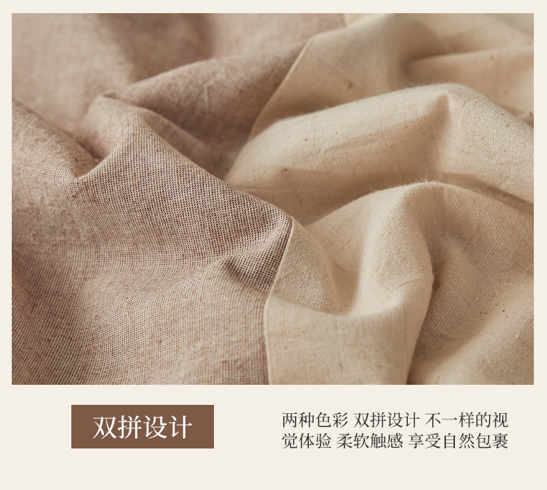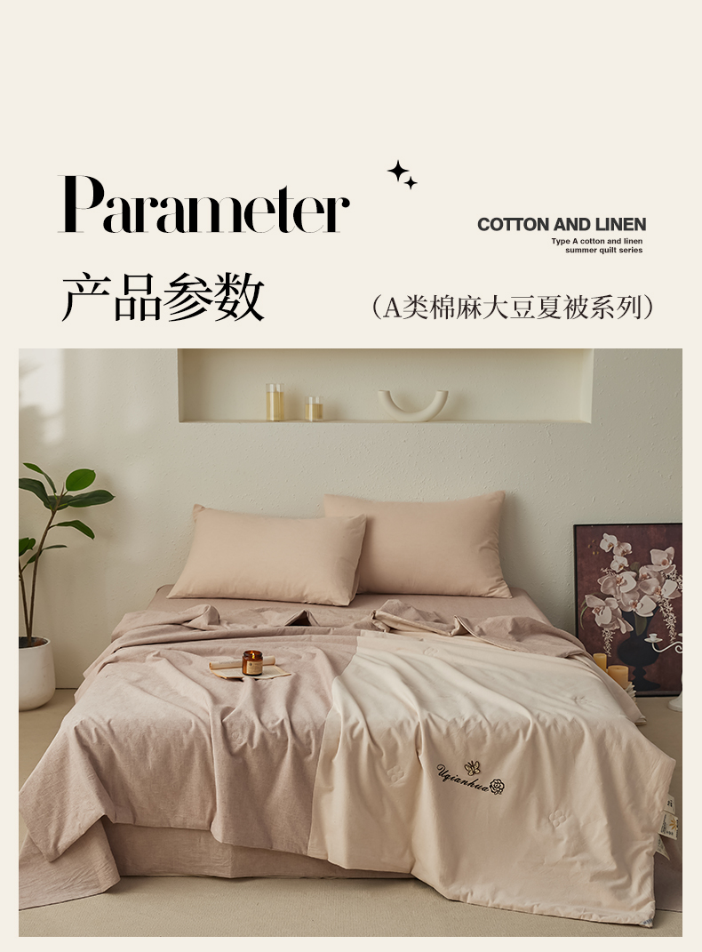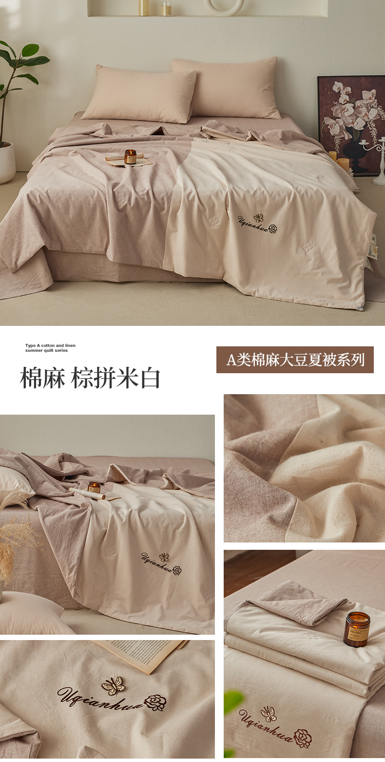 商品名称:尊妙被业 2026新款A类棉麻亚麻夏被大豆夏被四件套 棉麻 棕拼米白