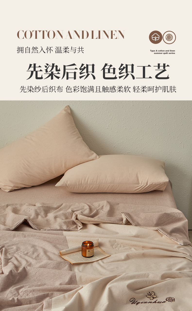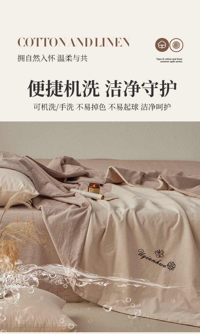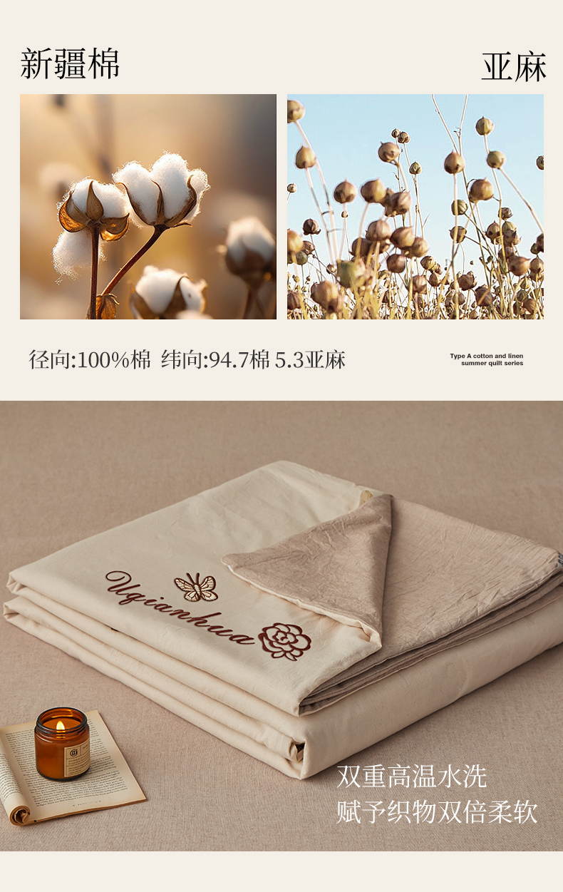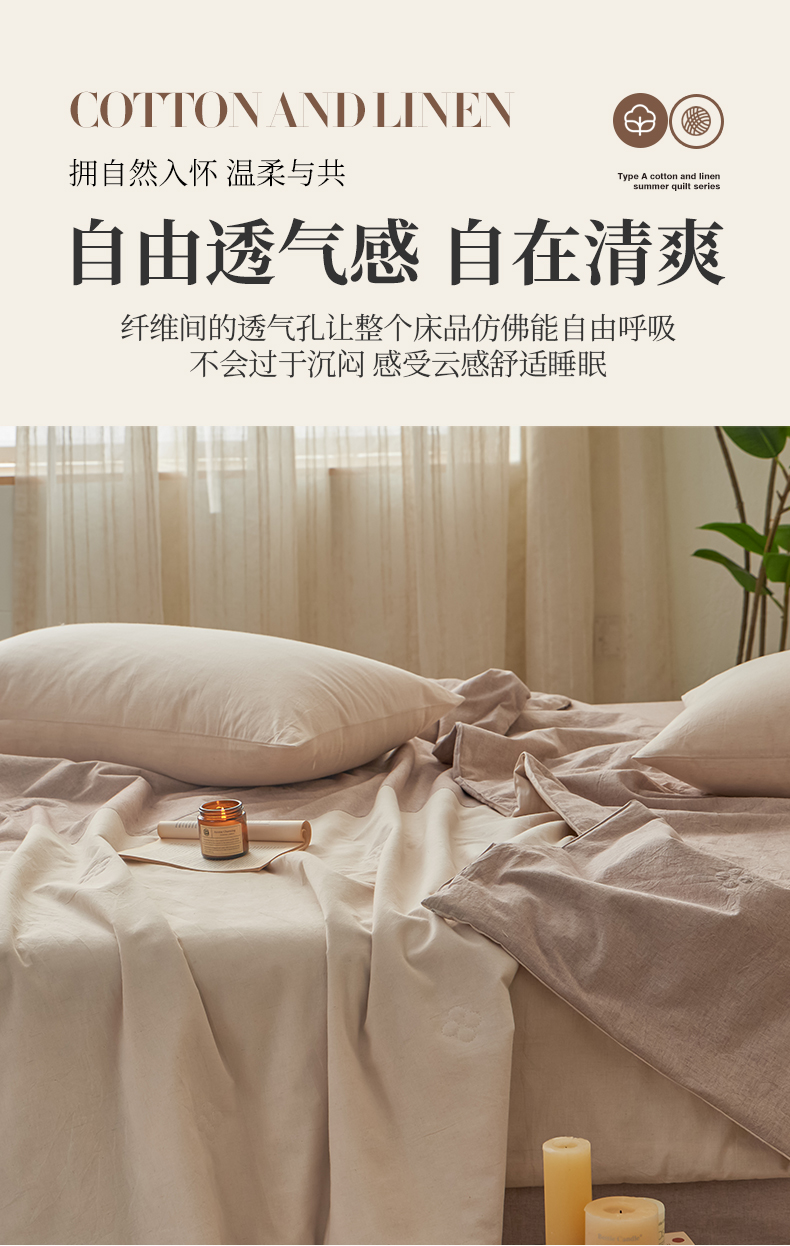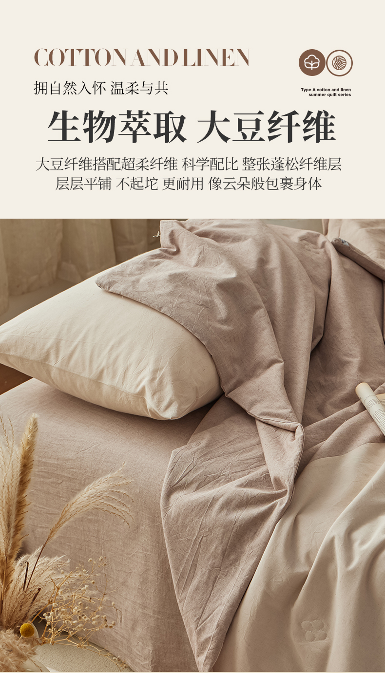 商品名称:尊妙被业 2026新款A类棉麻亚麻夏被大豆夏被四件套 棉麻 棕拼米白