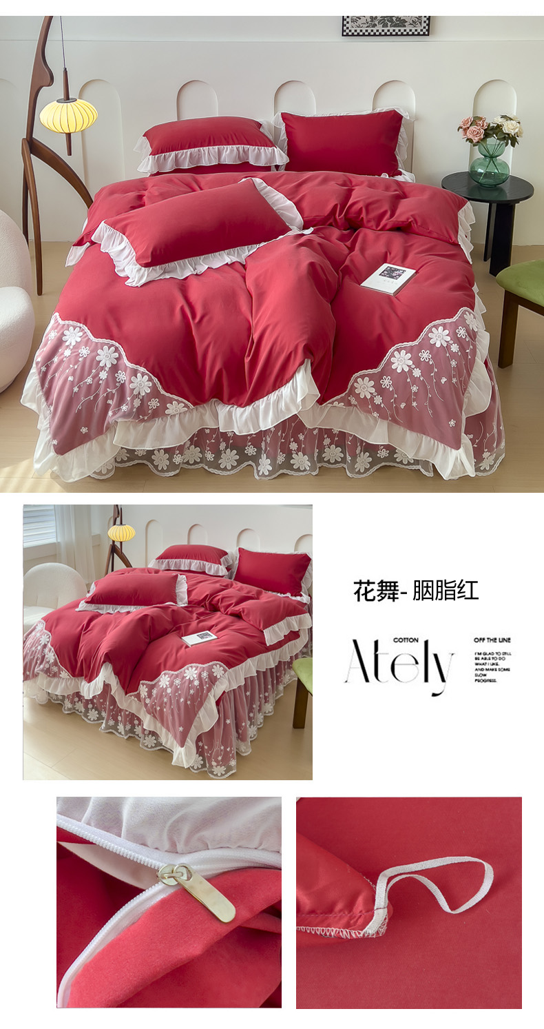 睡美人 2026新款锦棉蕾丝款系列韩版公主风床裙四件套-花舞 花舞-胭脂红