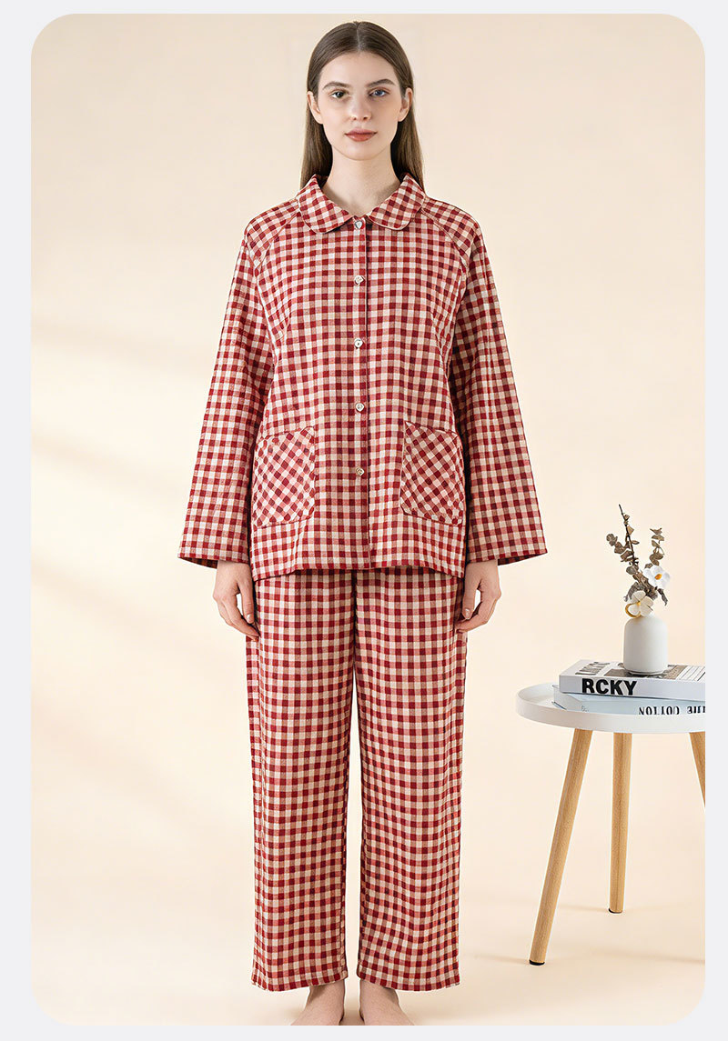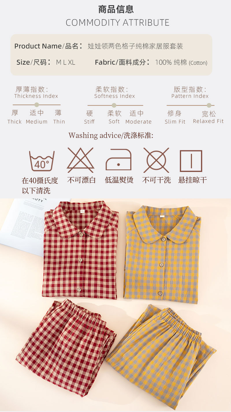 商品名称:(总)洛兰沙家居馆 春季新款2026纯棉睡衣女格子韩版宽松家居服长袖长裤休闲外穿套装