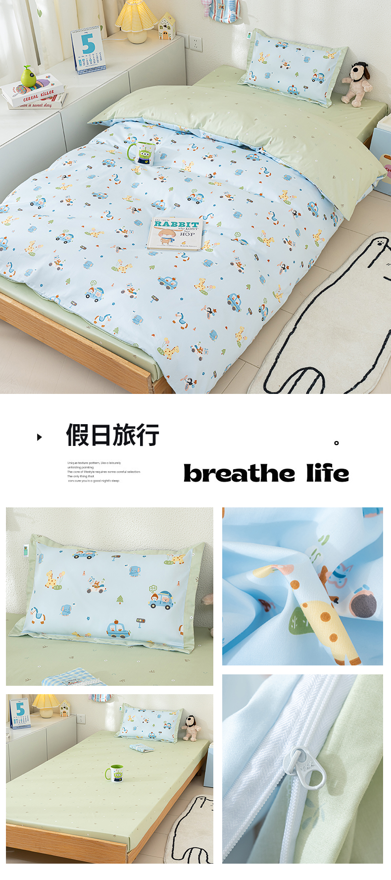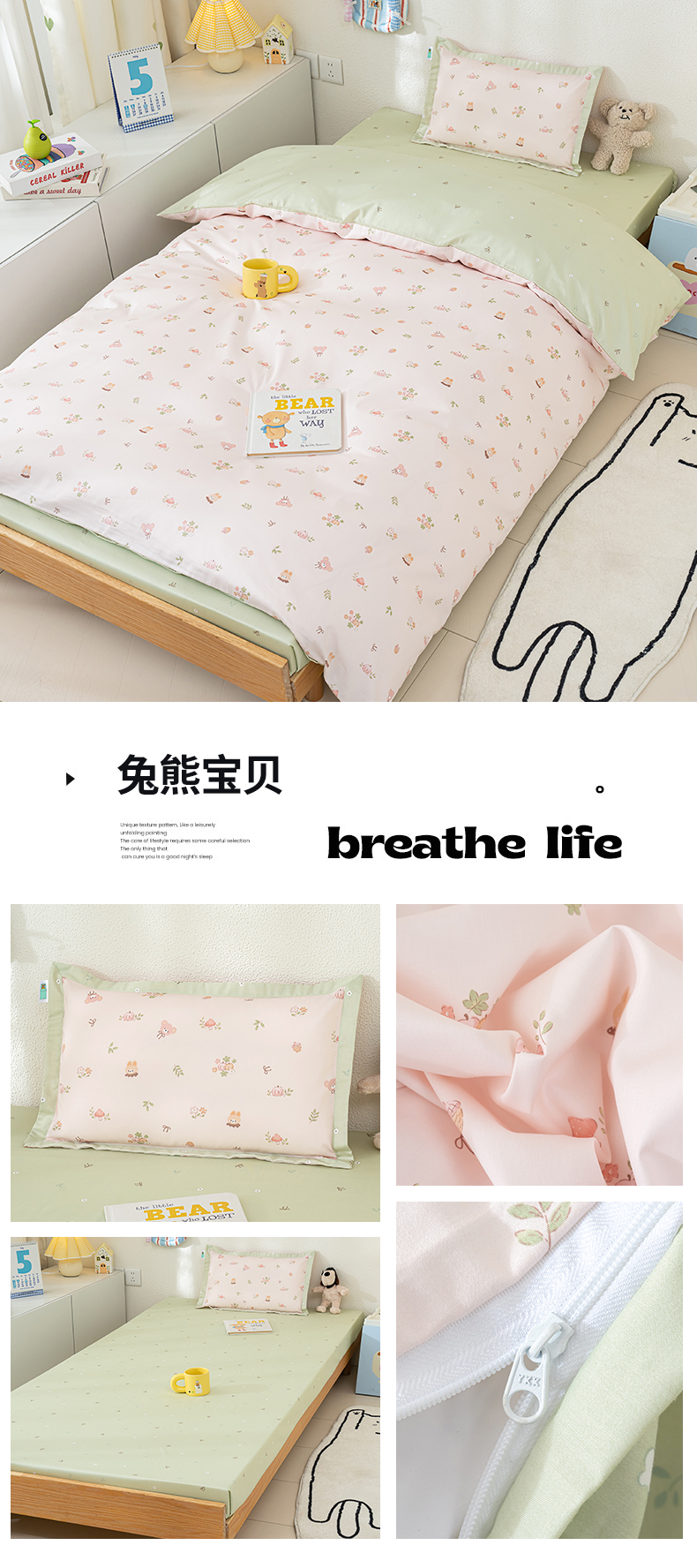 (总)良佐生活 2026年新款A类铂金精梳全棉学生三件套,甜心熊,挖机小分队,调皮象,福宝,乐兔粉,布布,太空探险,乐兔蓝