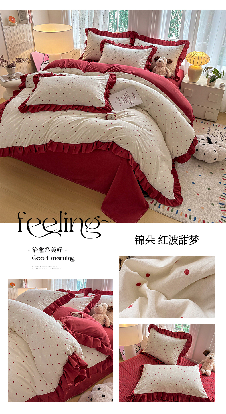 当前位置: 91家纺网 > 商品网购 > 床品套件 > 四件套 > 其它四件套 > 铠畅 2026春夏新款锦朵系列 韩版水洗棉小清新古棉床单床笠四件套 锦朵 红波甜梦