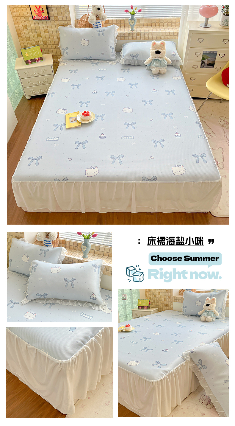 川悦生活 2026新款雪纺冰丝床裙凉席三件套 床裙海盐小咪