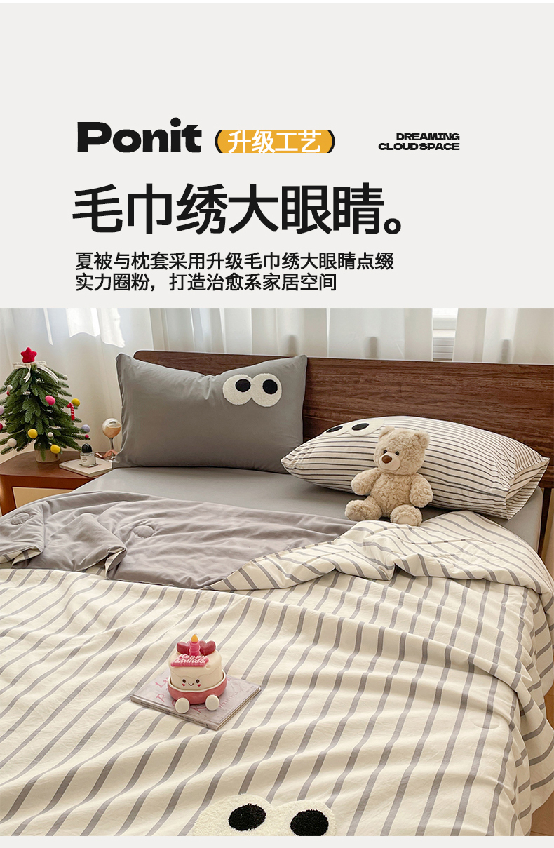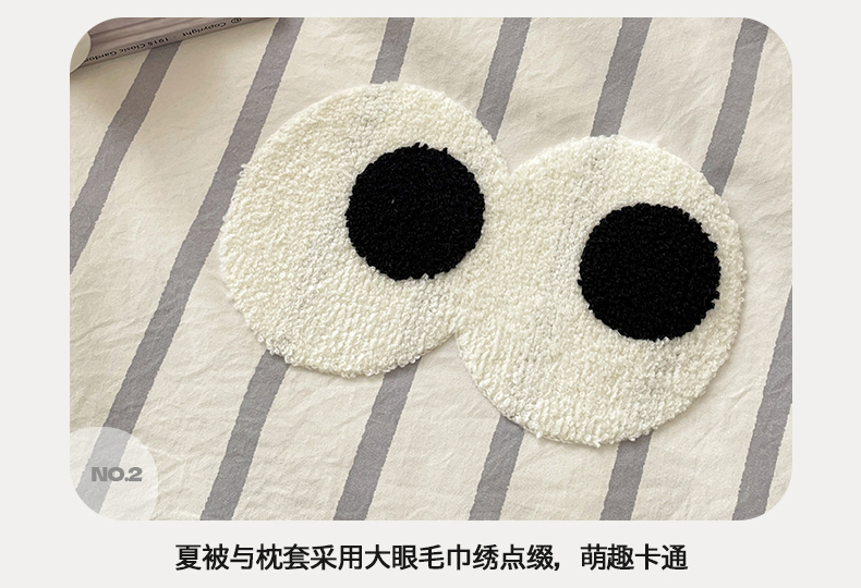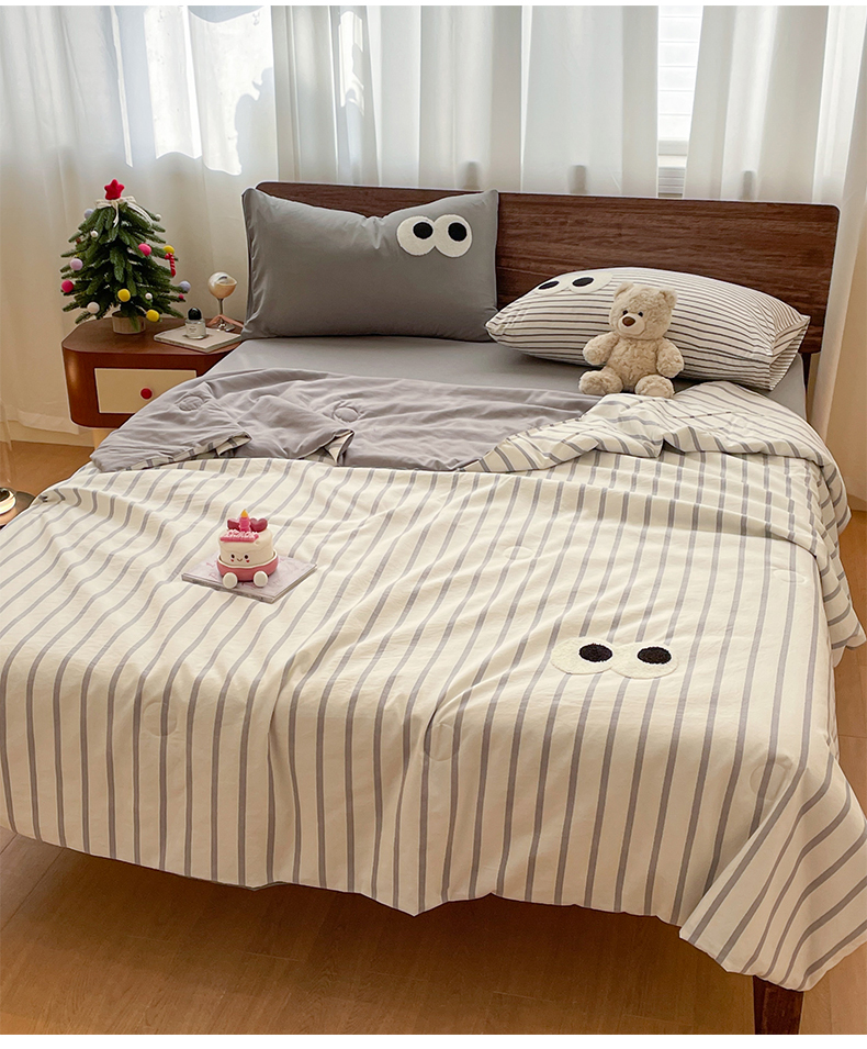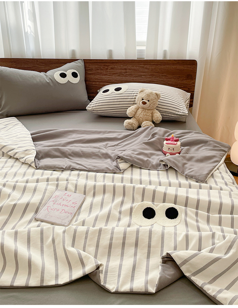 • 91家纺网 家纺一手货源 找家纺 桃心家居 2026春夏新款A类ins云柔水洗棉升级毛巾绣大眼睛大豆单夏被夏被四件套 水洗棉-大眼睛夏被灰条拿铁