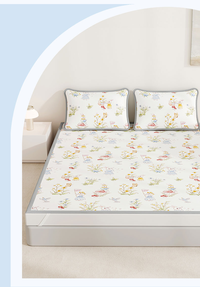 • 91家纺网 家纺一手货源 找家纺 家品罗兰 2026A类数码印花大版卡通冰丝凉席双人席可机洗学生宿舍空调软席三件套三明治网底 精灵小兔
