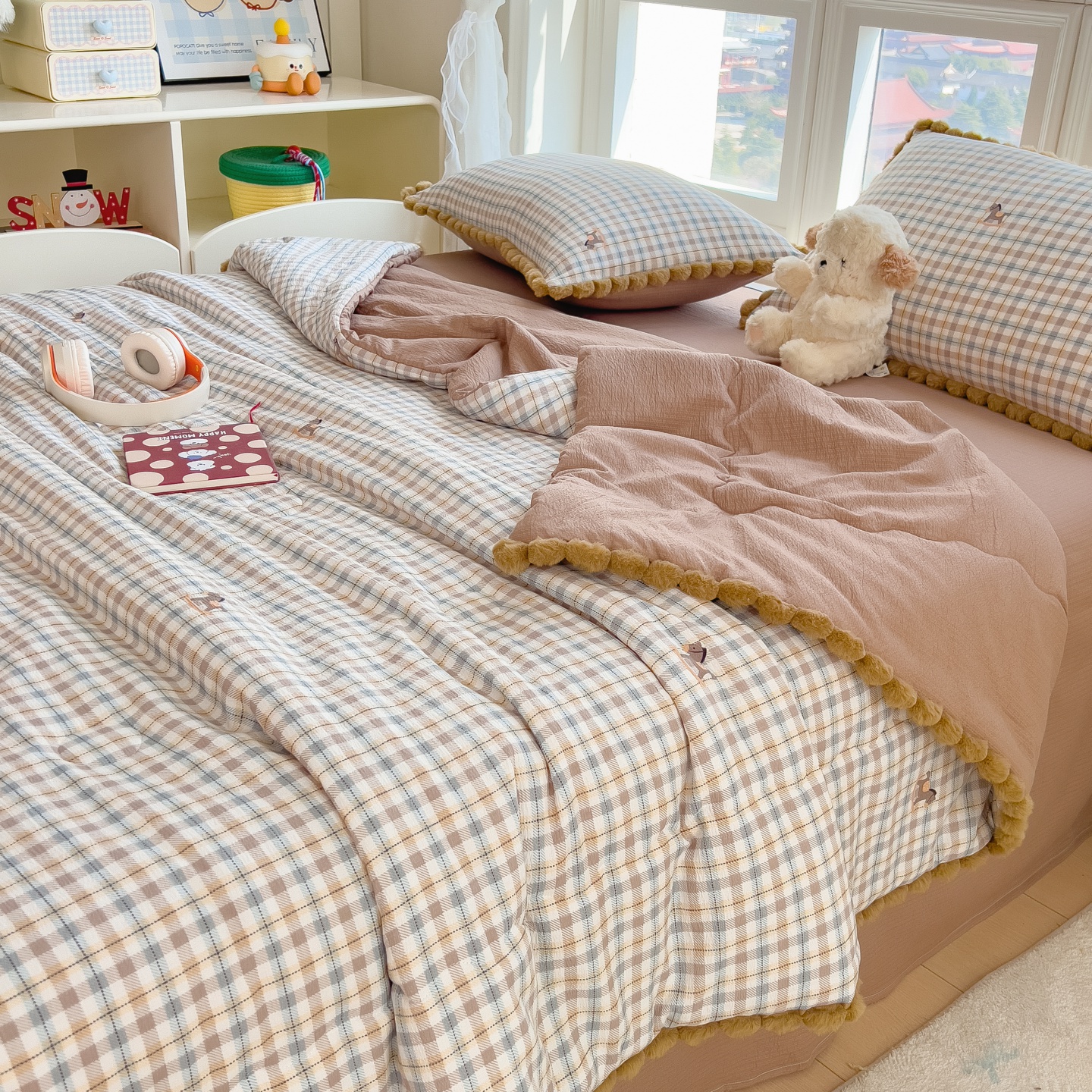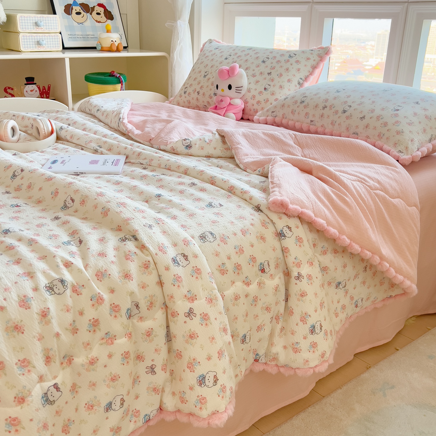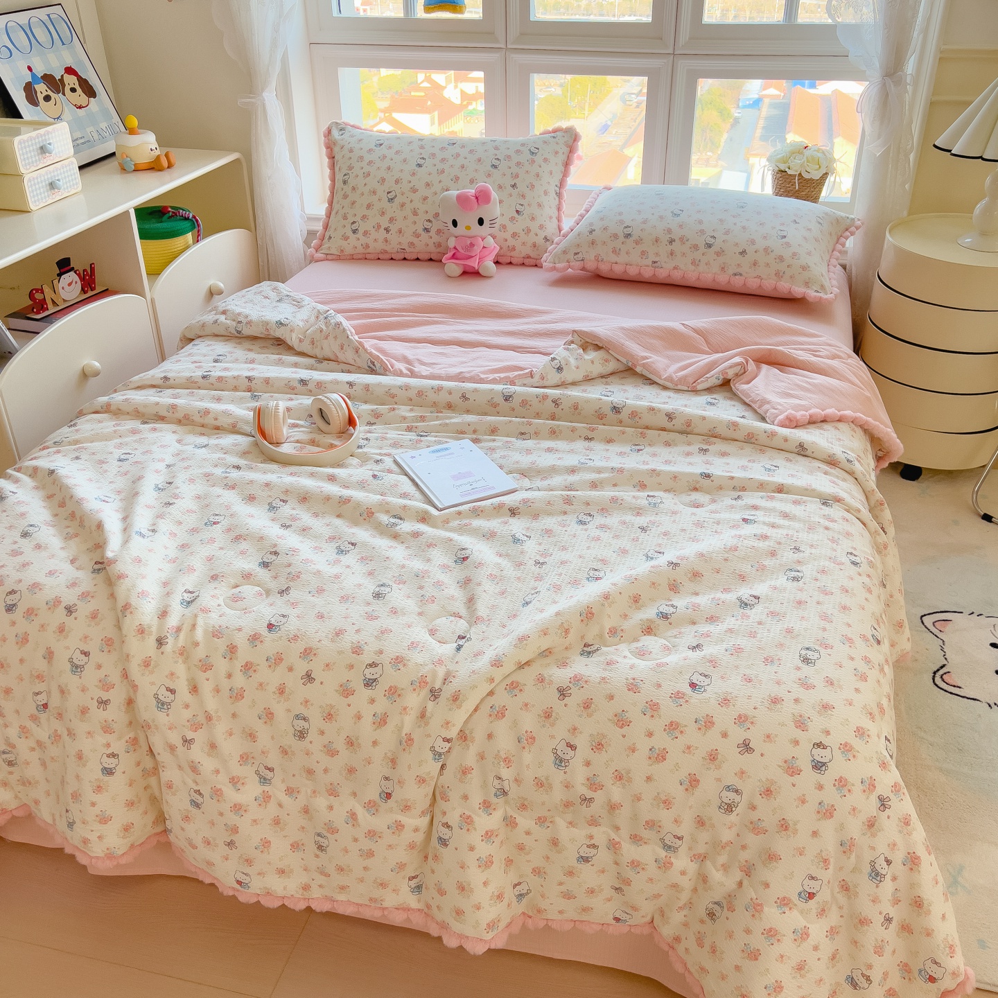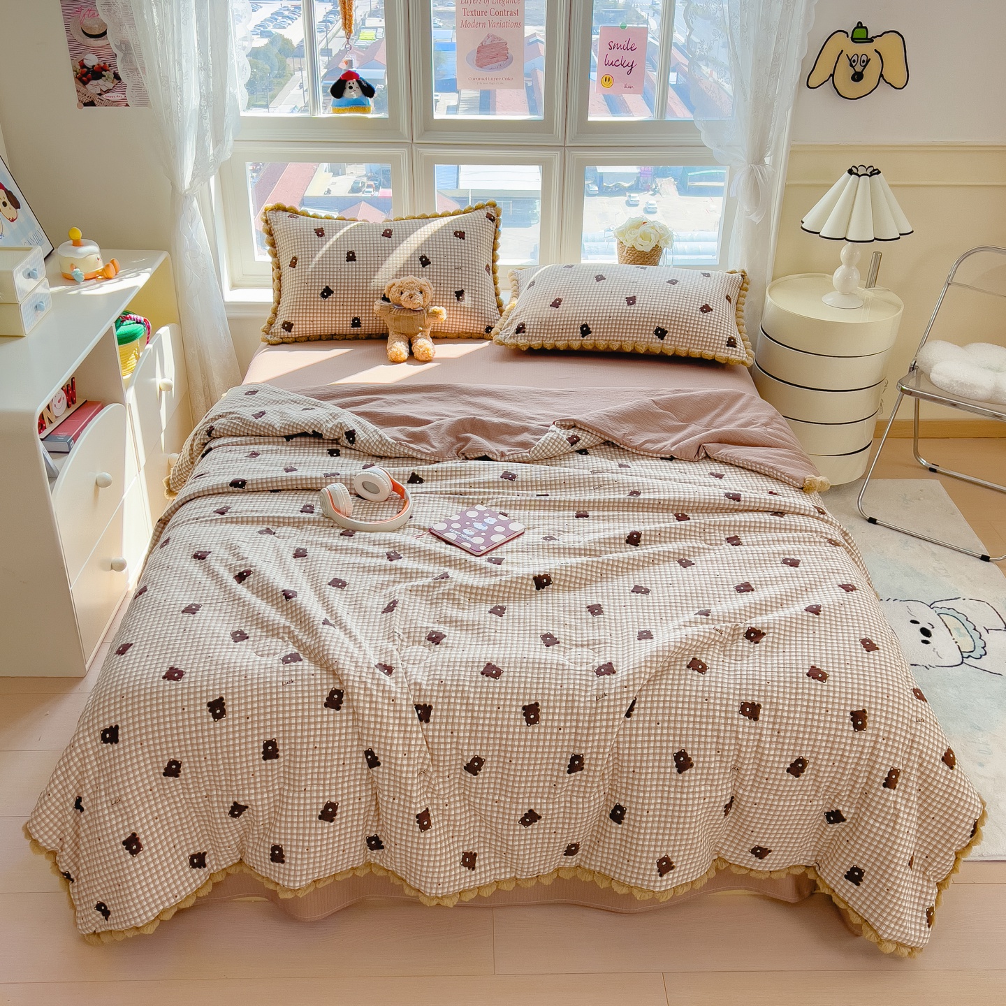 • 91家纺网 家纺一手货源 找家纺 宝士康家纺 2026新款10A抗菌毛球花边邹邹纱夏被 花乡小熊