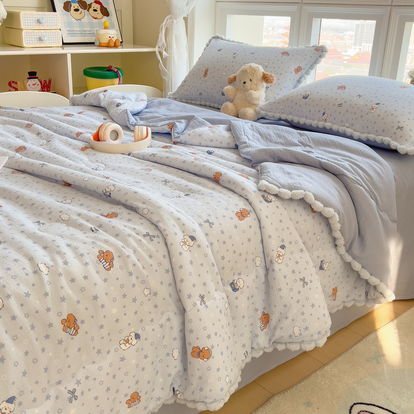 • 91家纺网 家纺一手货源 找家纺 (总)宝士康家纺 2026新款10A抗菌毛球花边邹邹纱夏被,蓝星狗,花乡小熊,乐趣,萌兔花园,沐春,素锦纹,雾格马