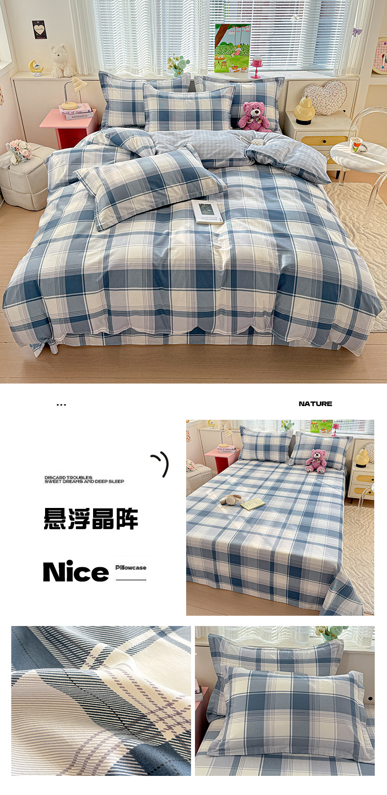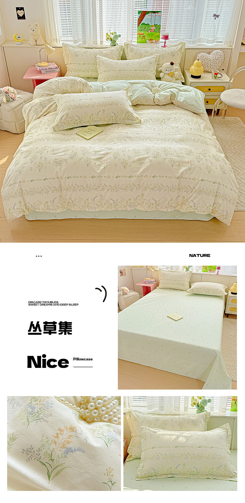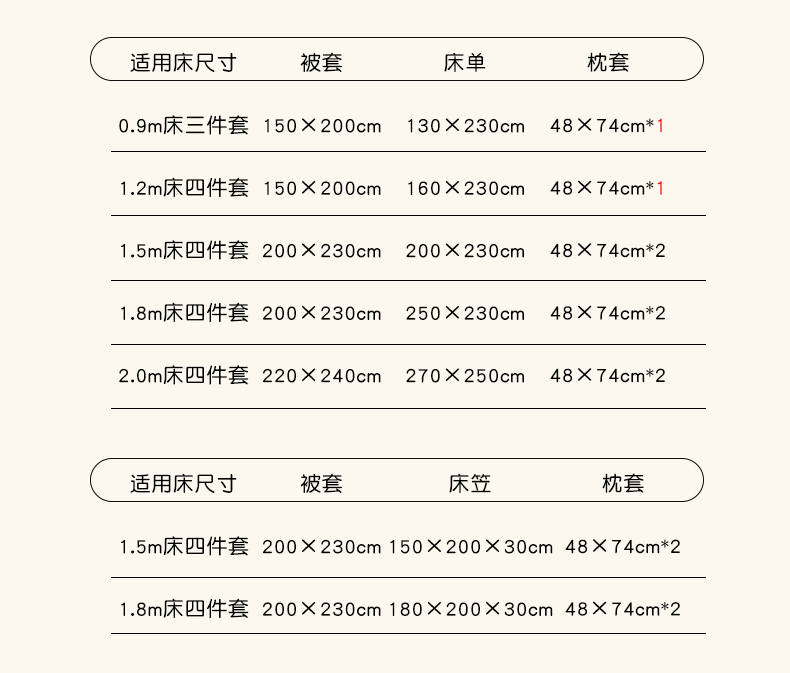 1.5米床四件套:被套200*230 床笠150*200*30 枕套48*74一对