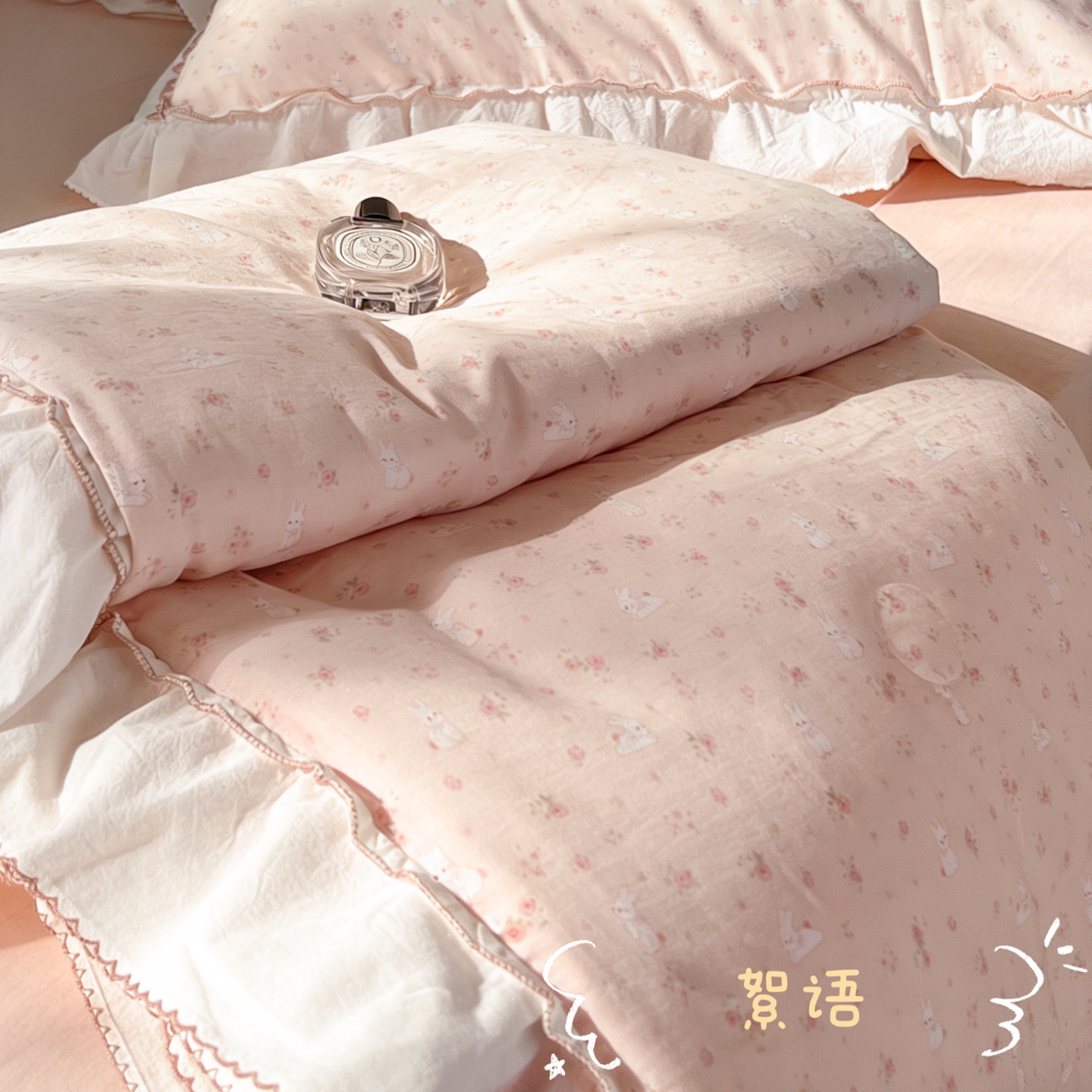 • 91家纺网 家纺一手货源 找家纺 荣轩家居 2026新款韩式月芽款大花边全棉双层纱夏被夏凉被空调被 海盐兔兔
