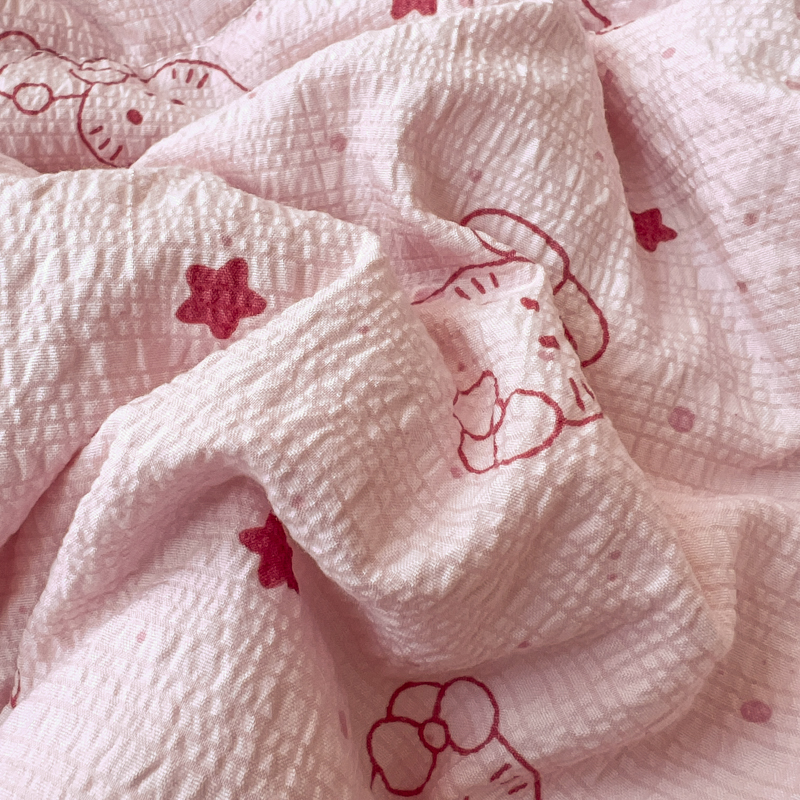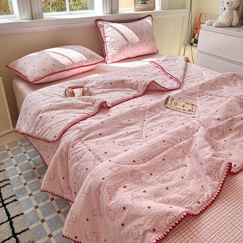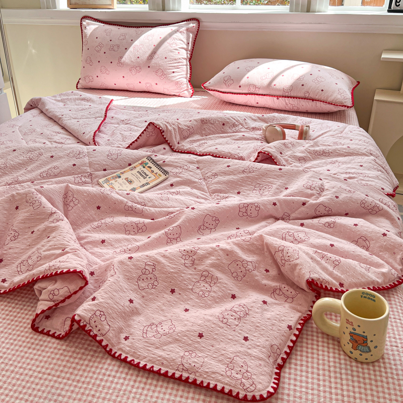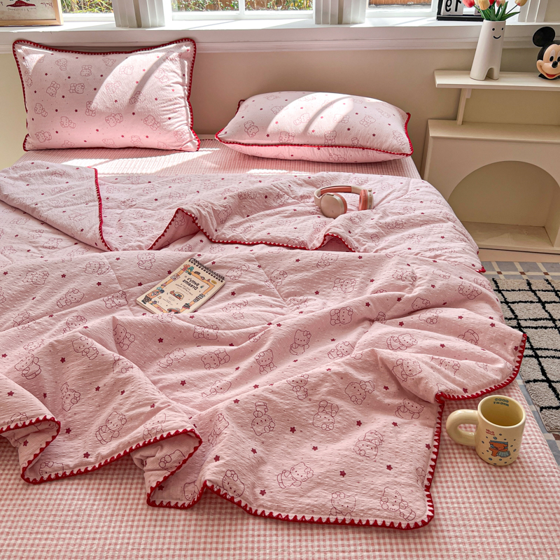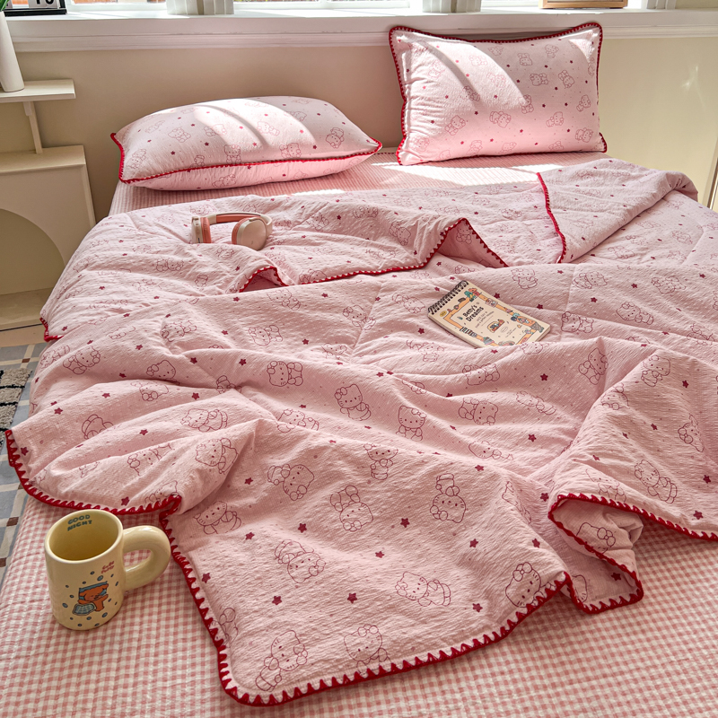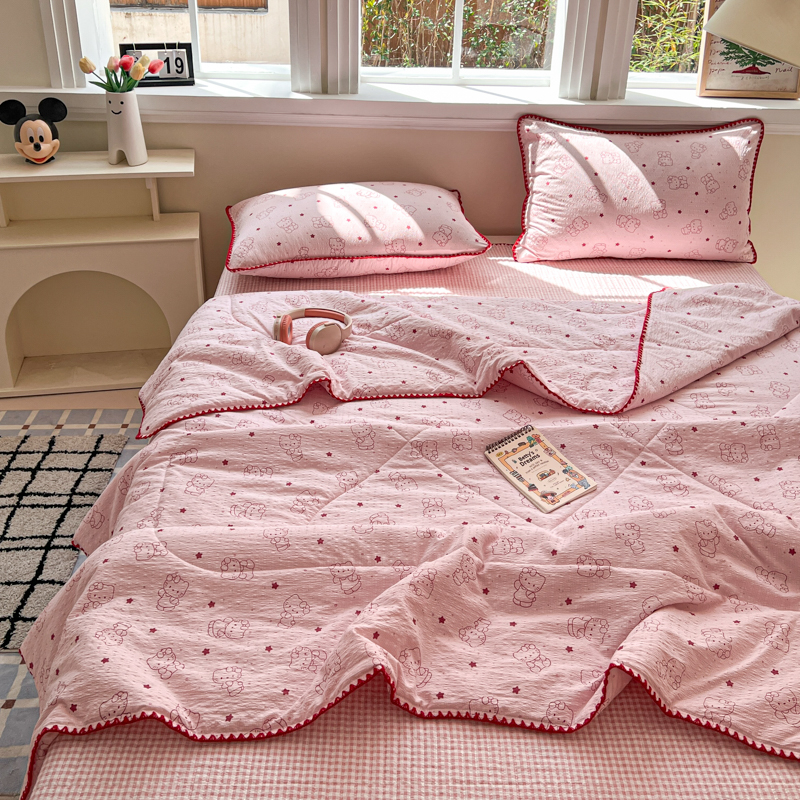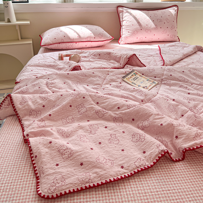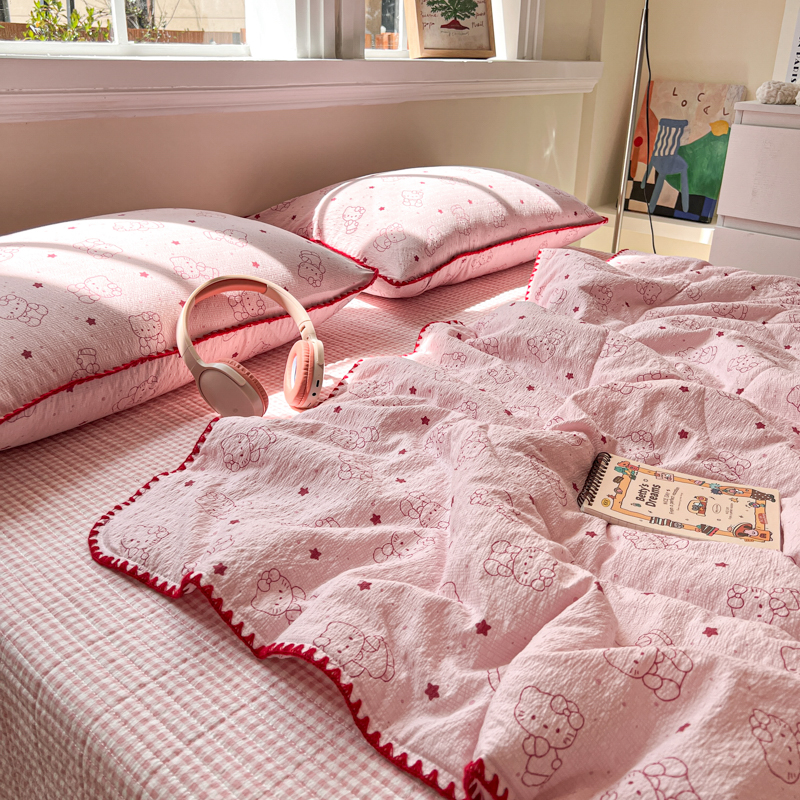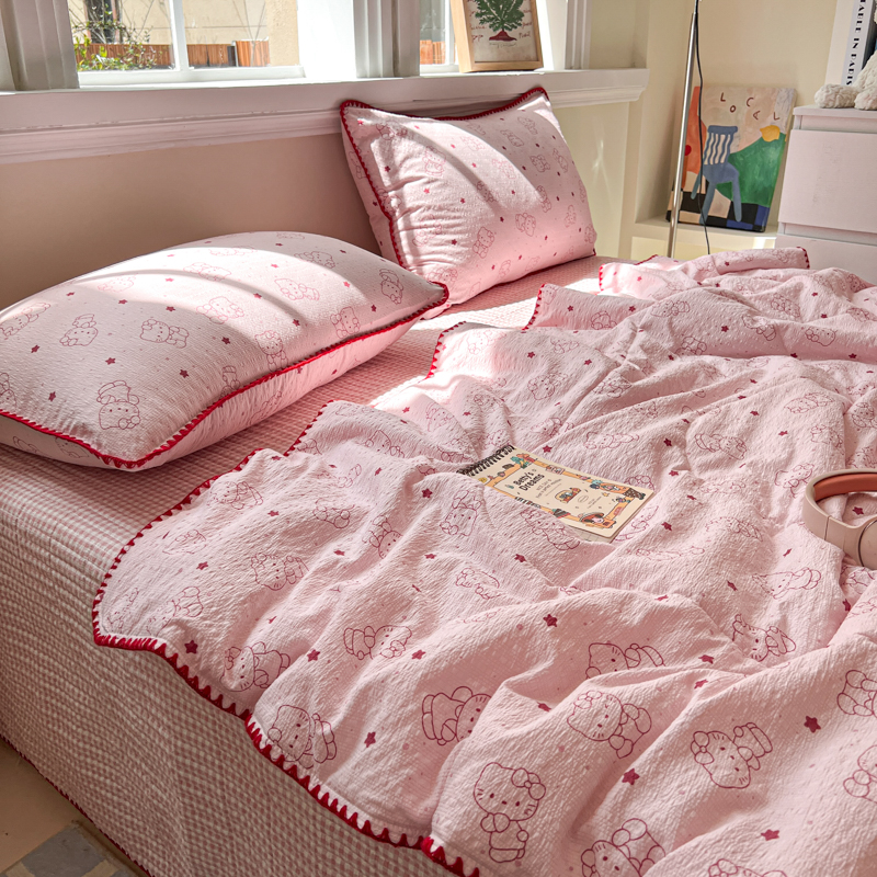 商品名称:禾沐 2026新款泡芙纱三角针床盖夏被四件套 描线小猫粉