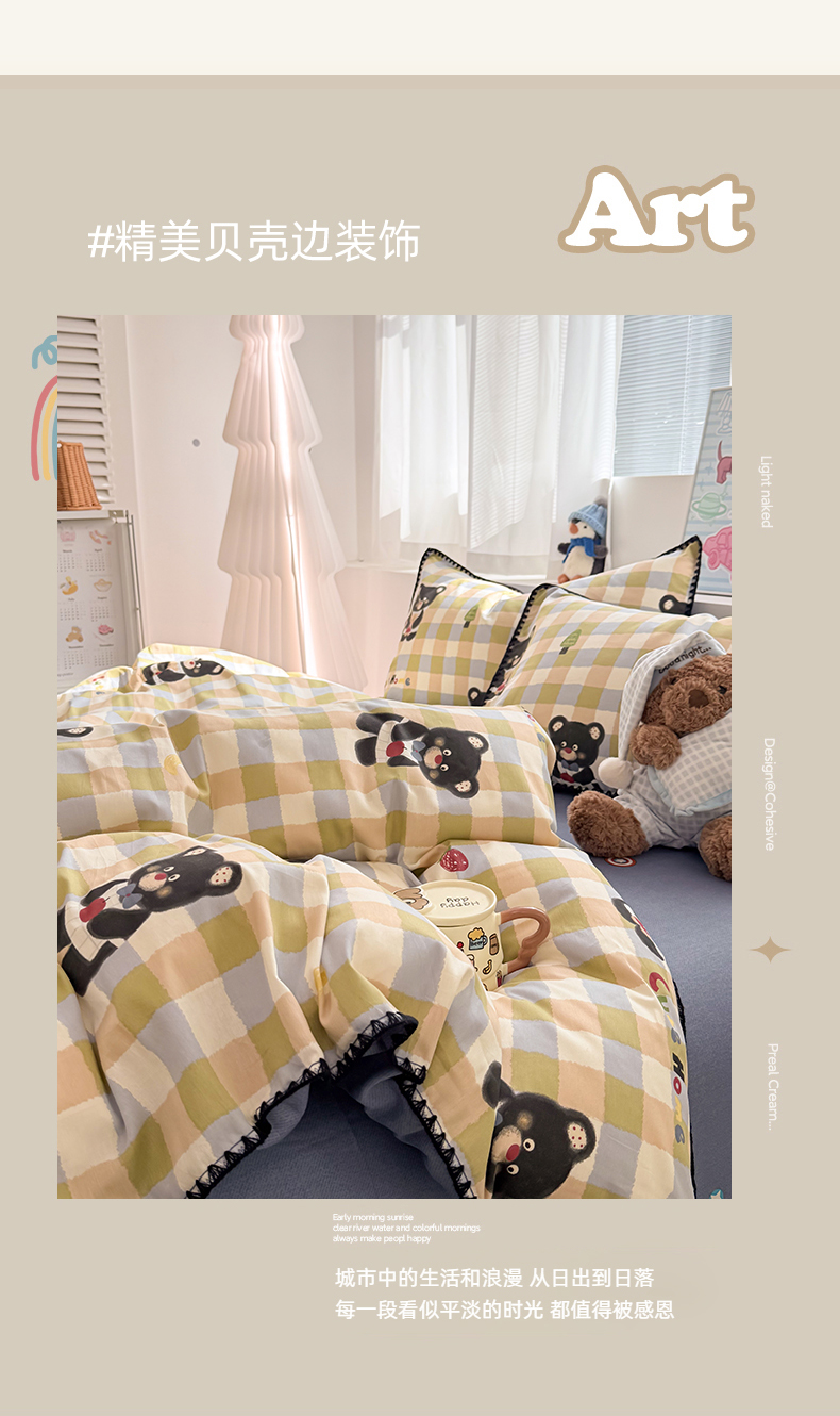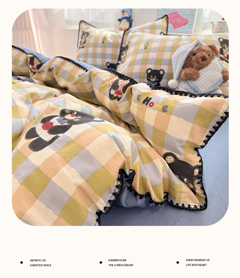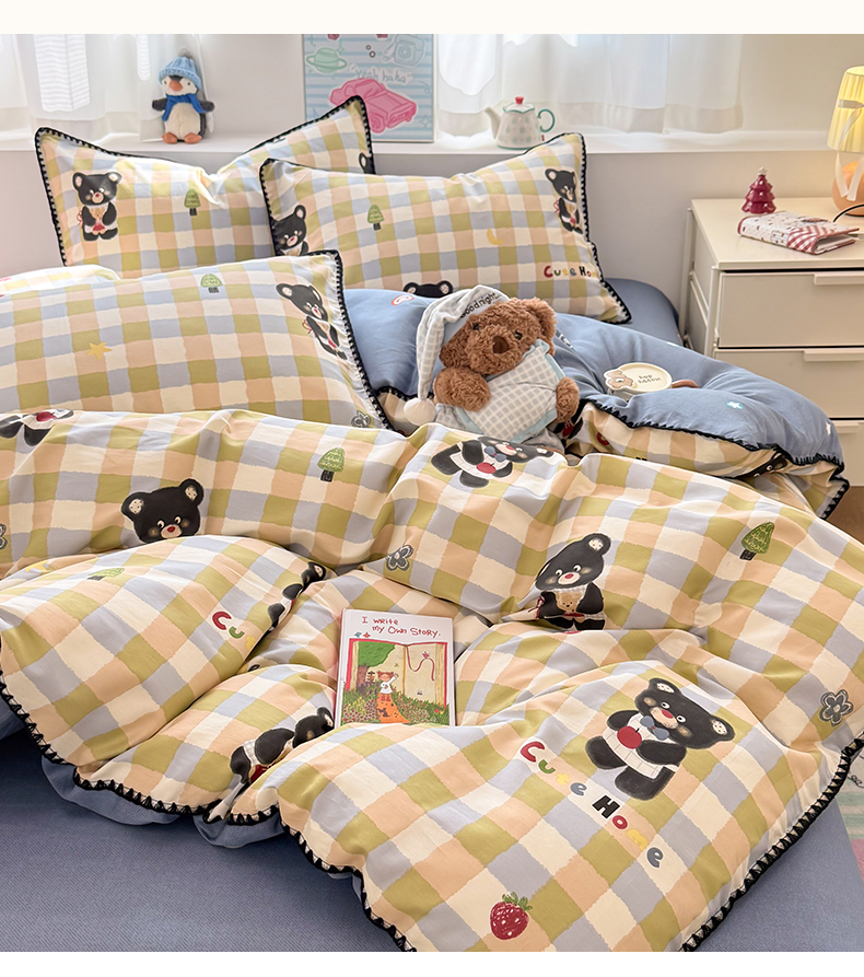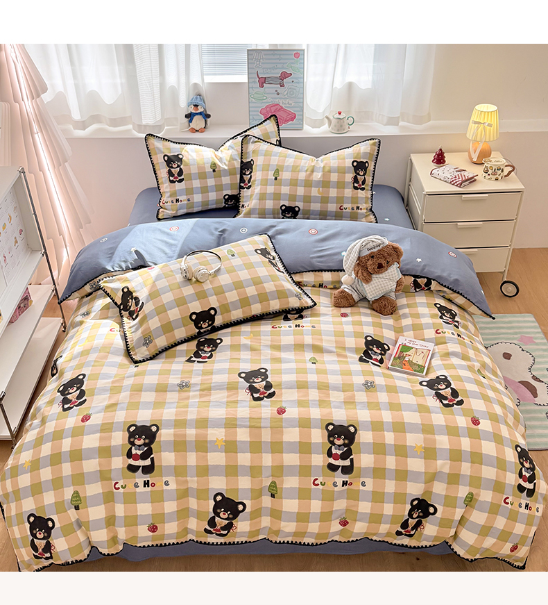 当前位置: 91家纺网 > 商品网购 > 床品套件 > 四件套 > 全棉普通四件套 > 简宜家居(朝初家纺) 2026新款贝壳边卡通可爱纯棉全棉四件套 苹果熊格子