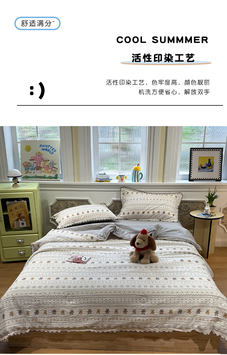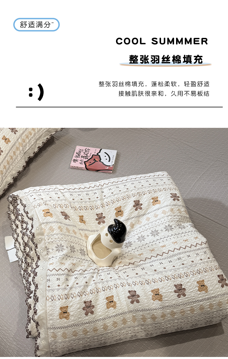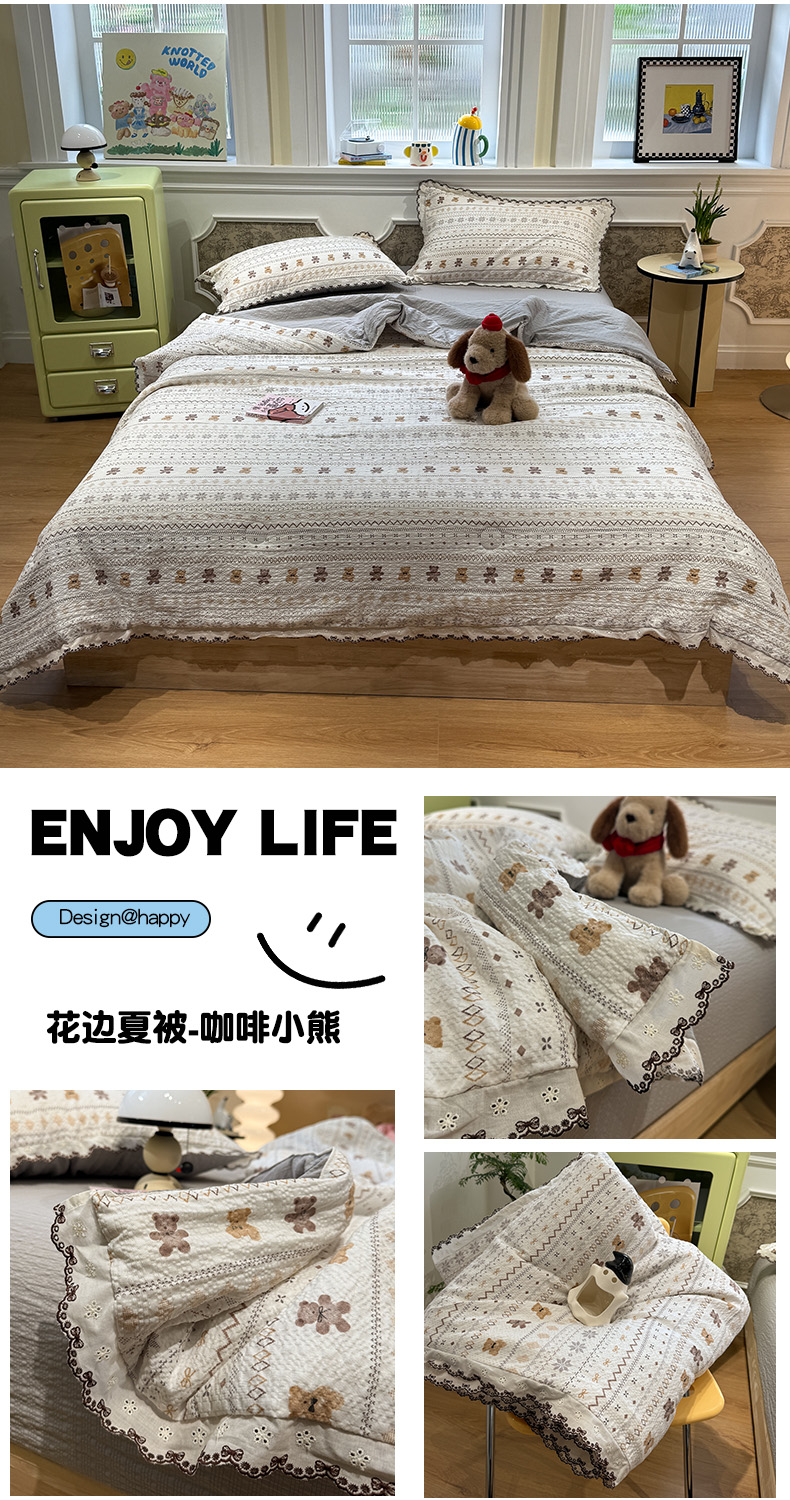 水墨江南 2026新款泡芙纱全棉花边夏被四件套 花边夏被-咖啡小熊