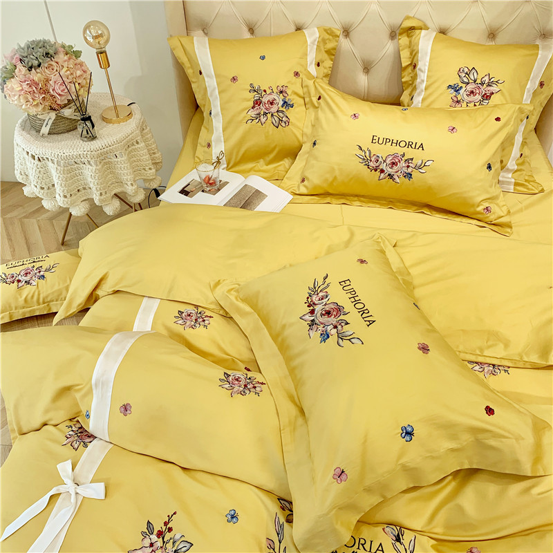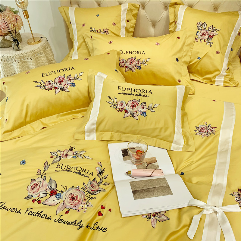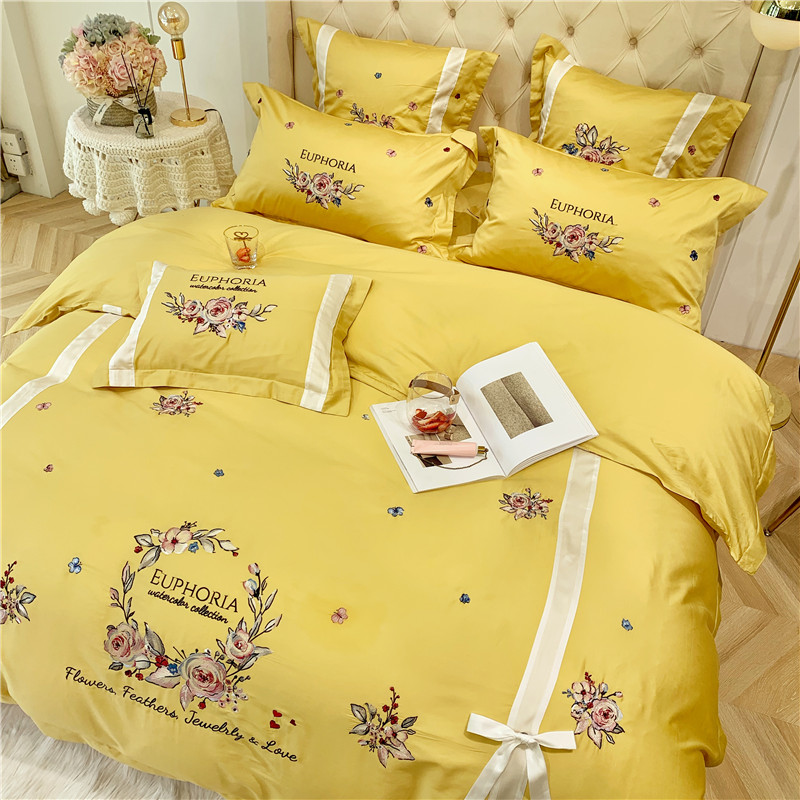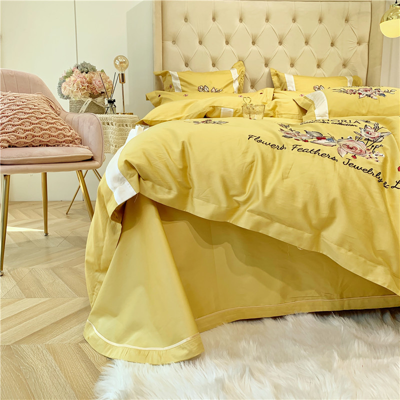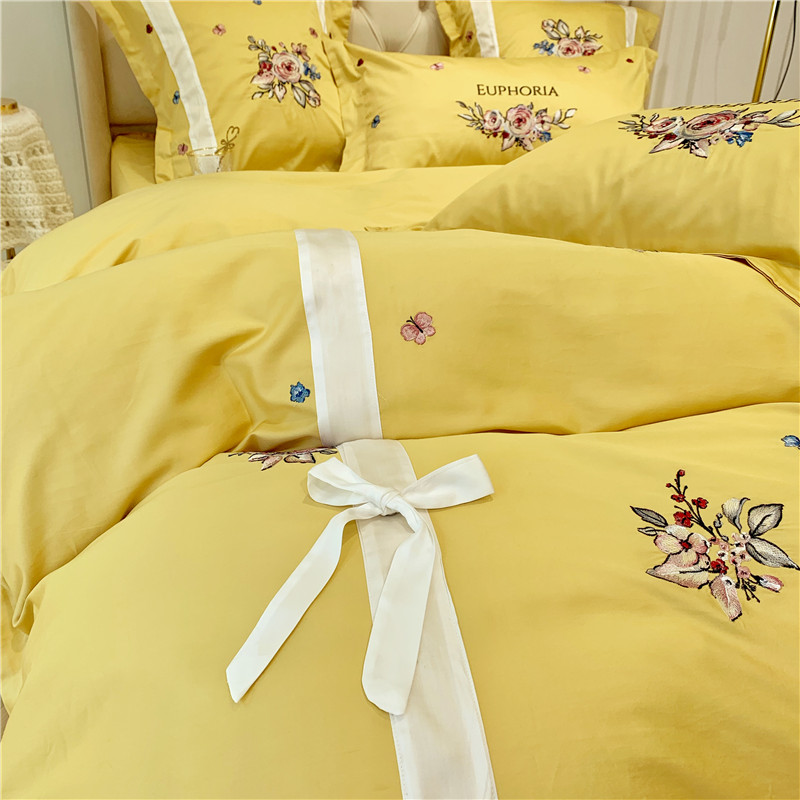 当前位置: 91家纺网 > 商品网购 > 床品套件 > 四件套 > 长绒棉四件套 > 馨蕊家居 2021新款60长绒棉绣花四件套 艾琳-柠檬黄