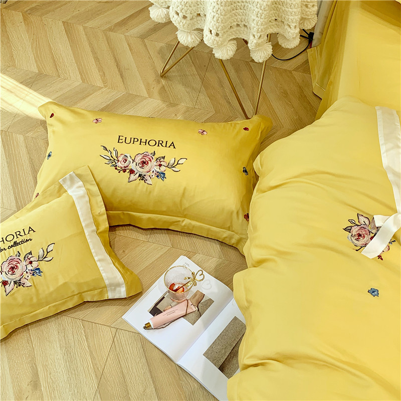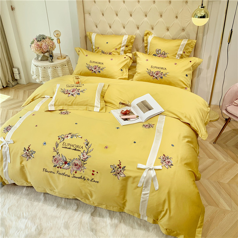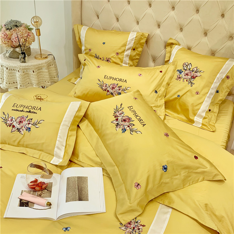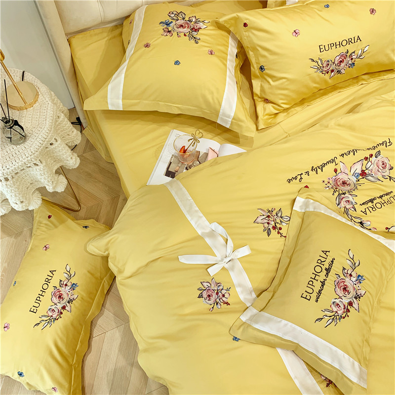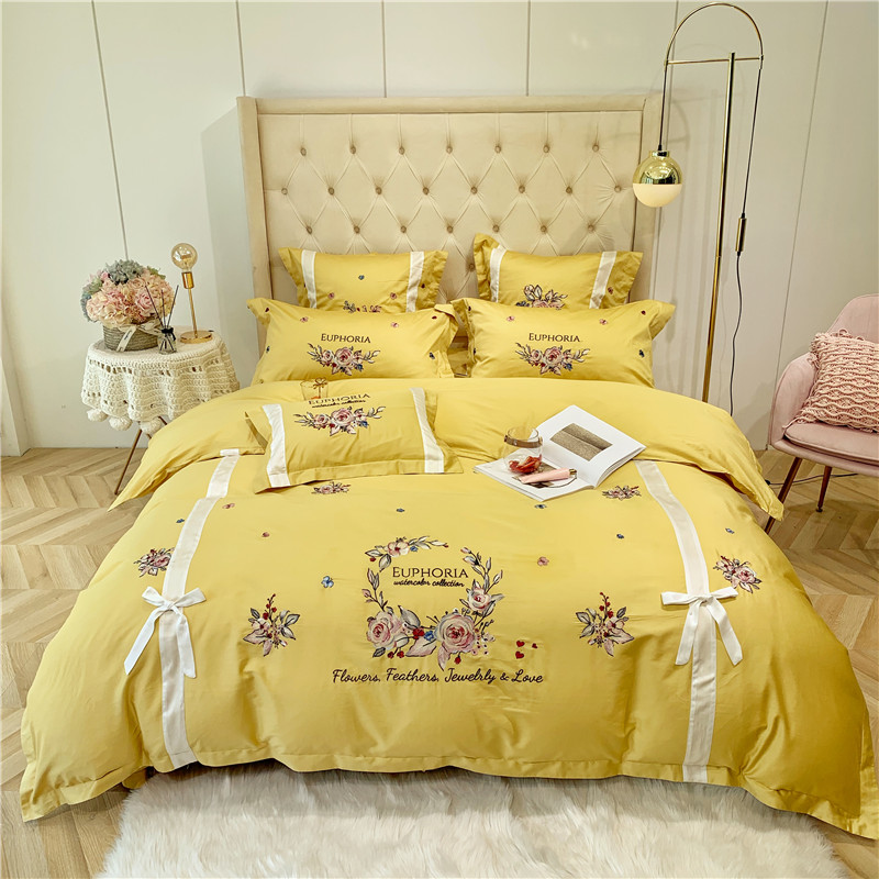 当前位置: 91家纺网 > 商品网购 > 床品套件 > 四件套 > 长绒棉四件套 > 馨蕊家居 2021新款60长绒棉绣花四件套 艾琳-柠檬黄