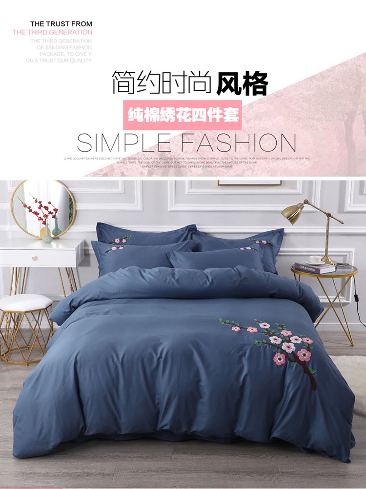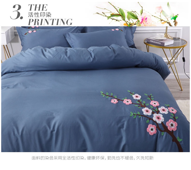 2021新款全棉13372毛巾绣纯棉刺绣花四件套桃花朵朵藏青