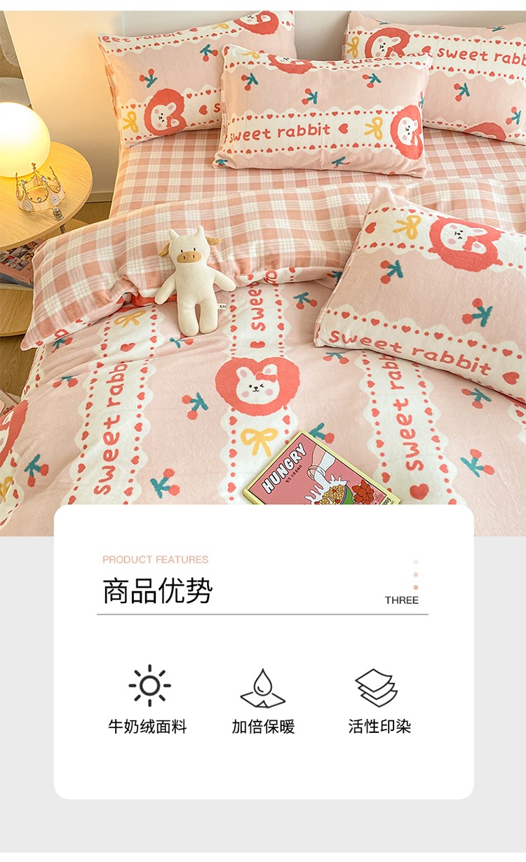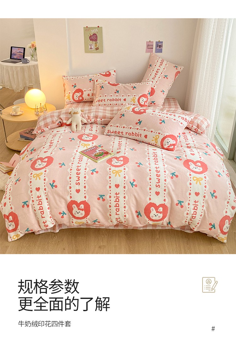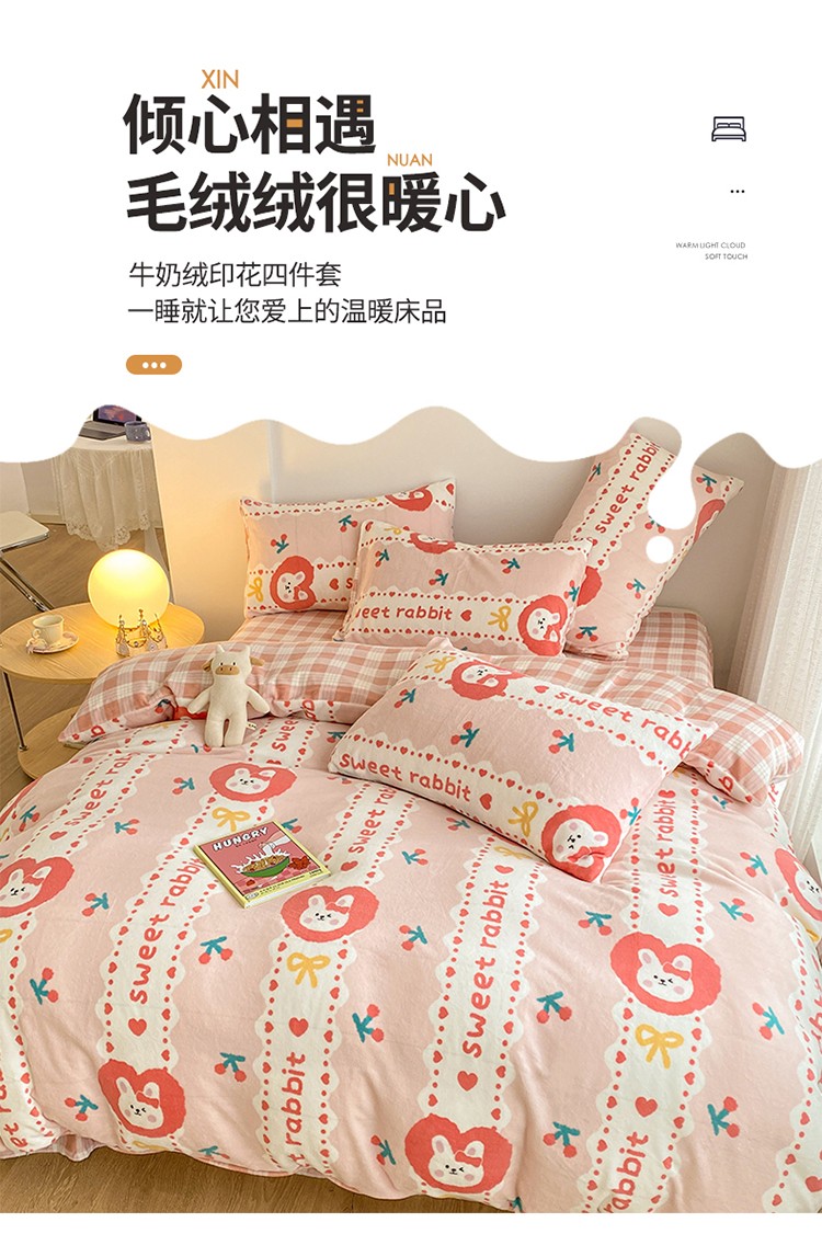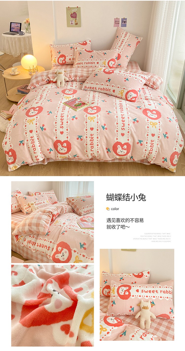商品名称:雅居纺 2022新款印花牛奶绒四件套 蝴蝶结小兔