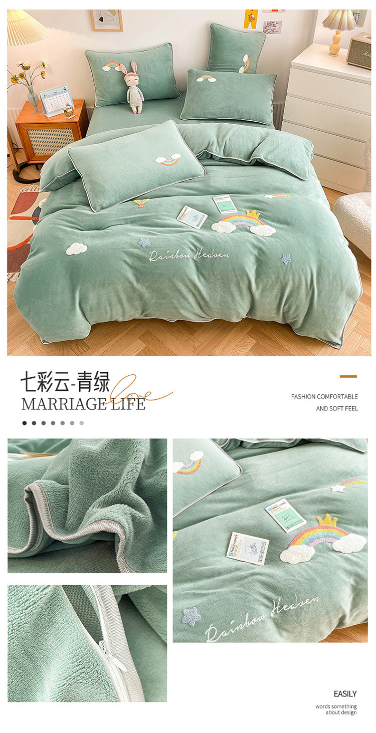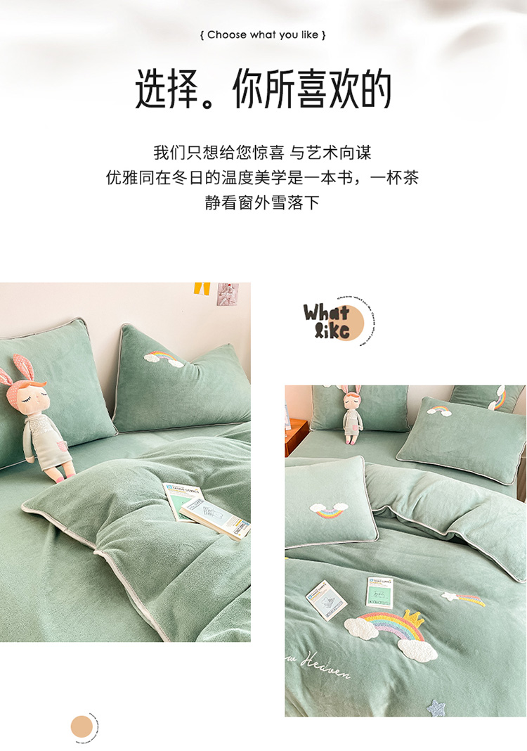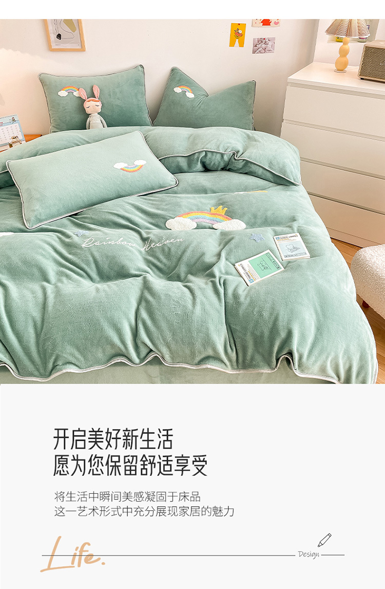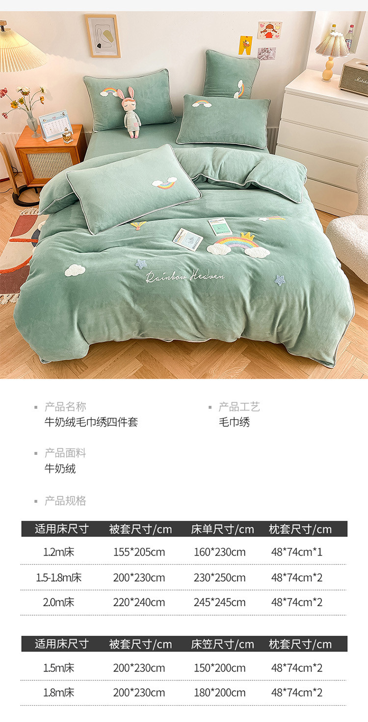 商品名称:绒兔兔 2021秋冬牛奶绒毛巾绣韩版床裙床单四件套 七彩云-青绿