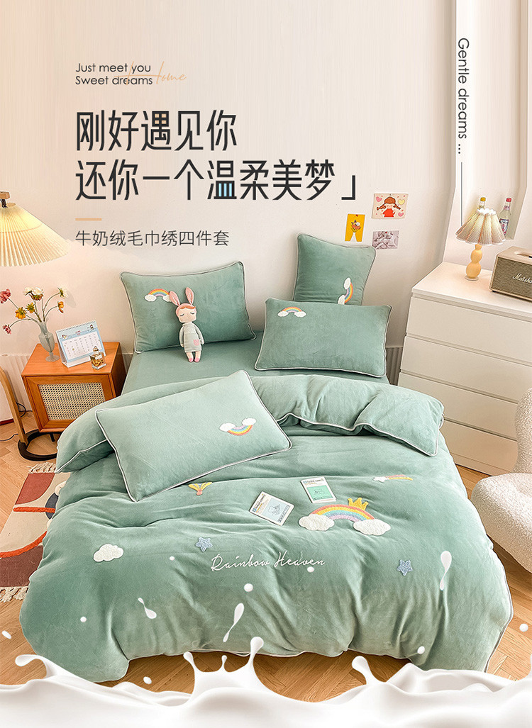 绒兔兔 2021秋冬牛奶绒毛巾绣韩版床裙床单四件套 七彩云-青绿