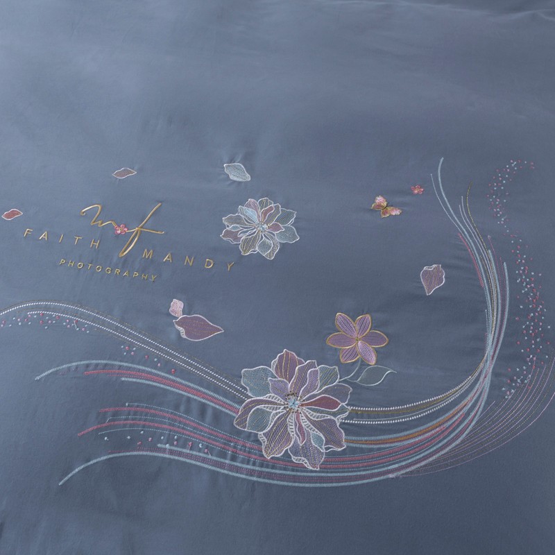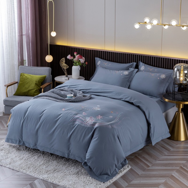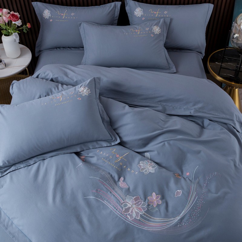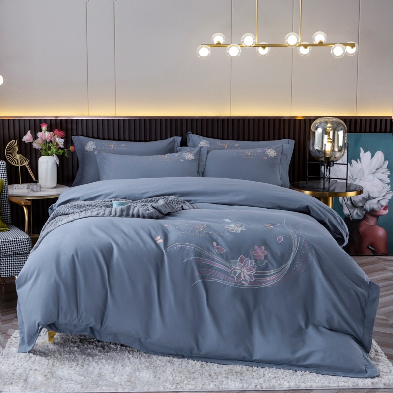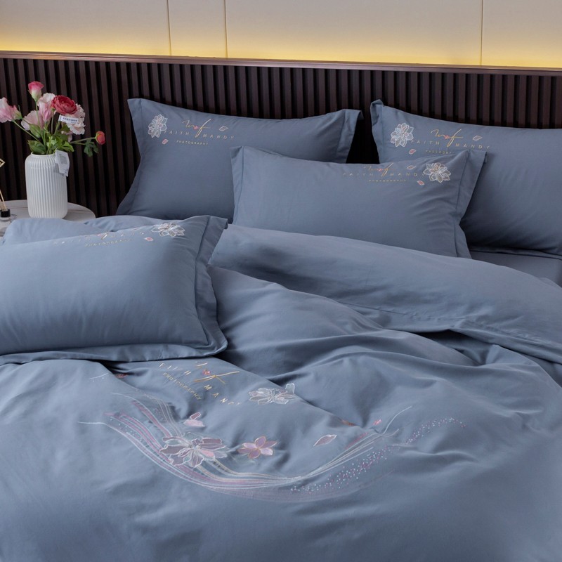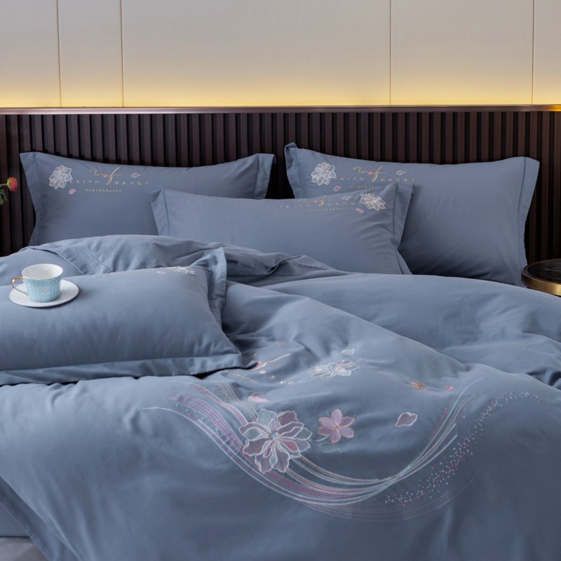 优姿 2022新款100S长绒棉宽边绣花四件套似锦年华-蓝灰