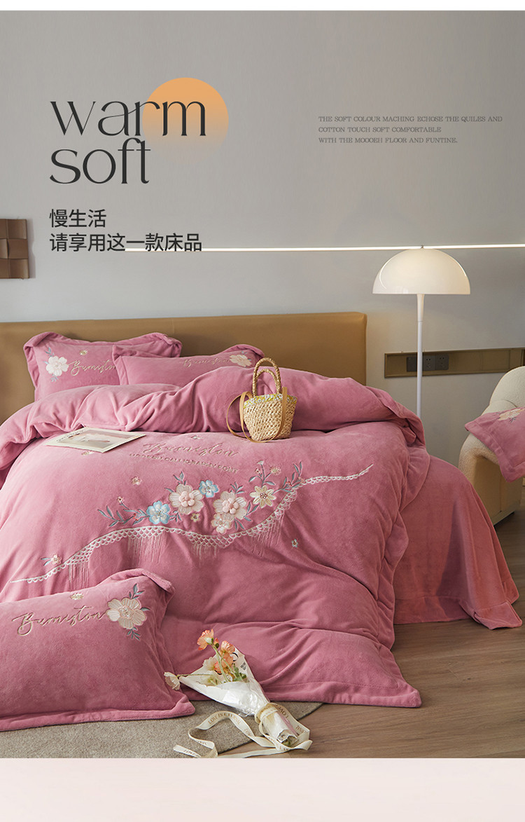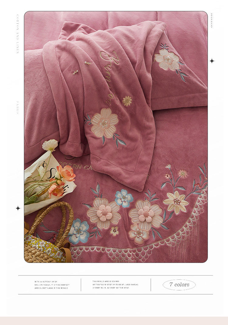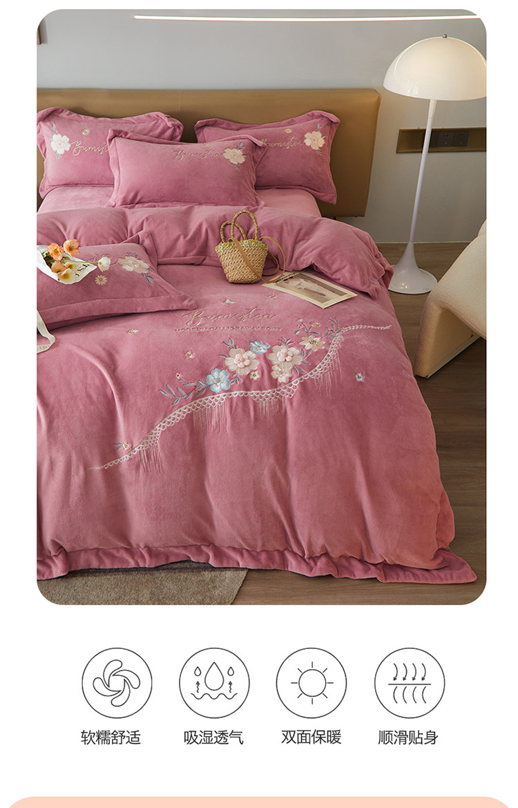 名品优仓 新款230g牛奶绒刺绣四件套-贝拉花园 豆沙粉
