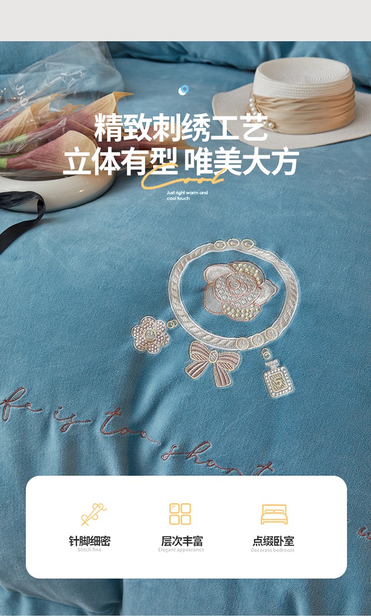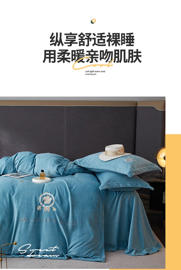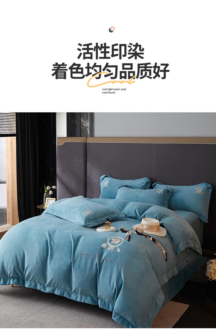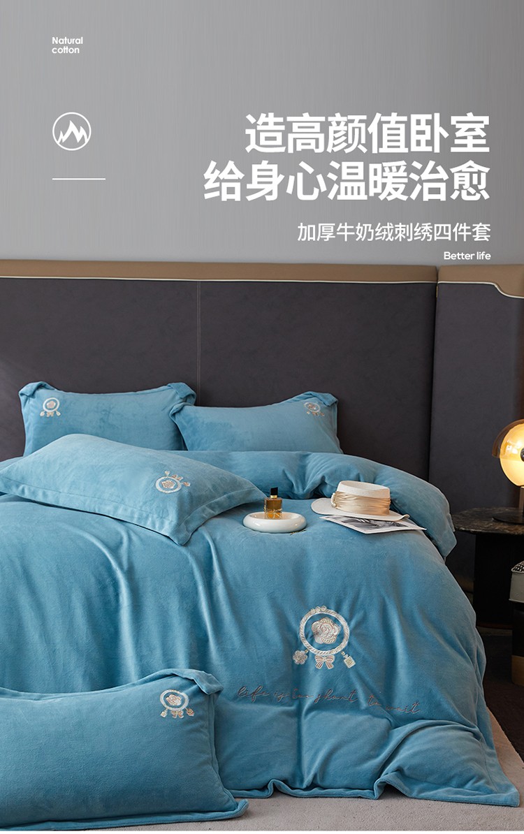 名品优仓 2022新款200g牛奶绒刺绣四件套-唯美 深海蓝