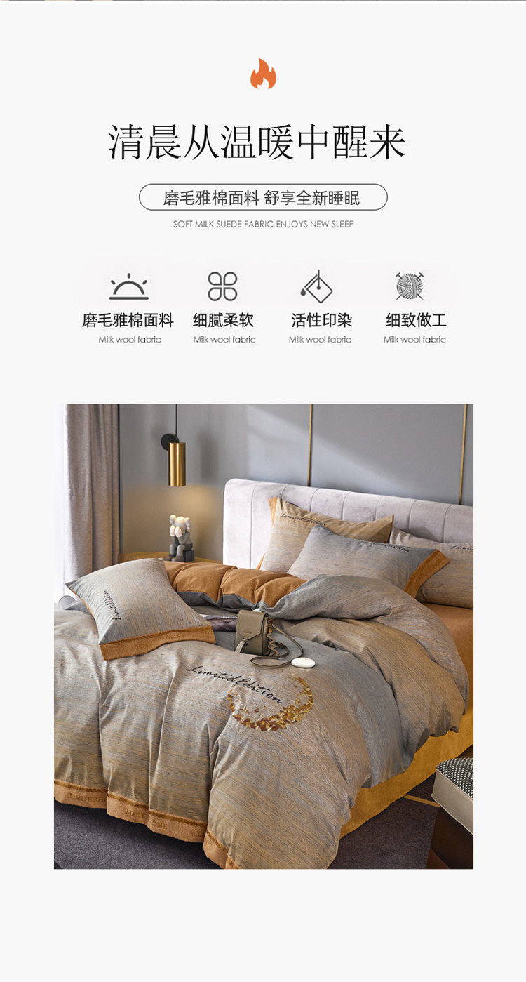 (总)凡客家居 2024新款高克重牛奶绒绣花拼角四件套,海洋蓝,奶油咖,深卡其,樱花粉