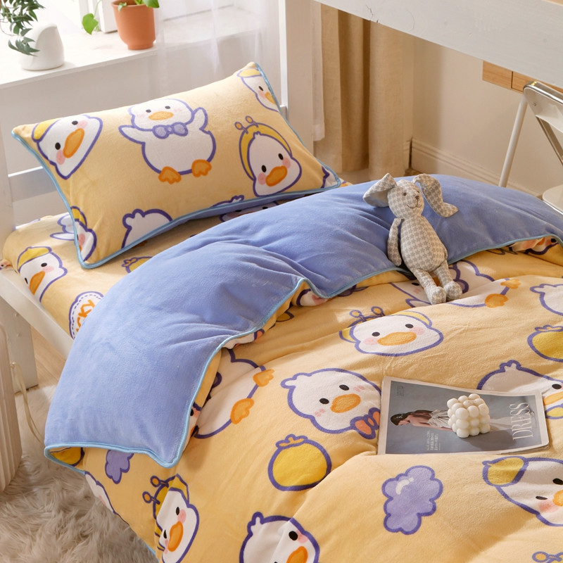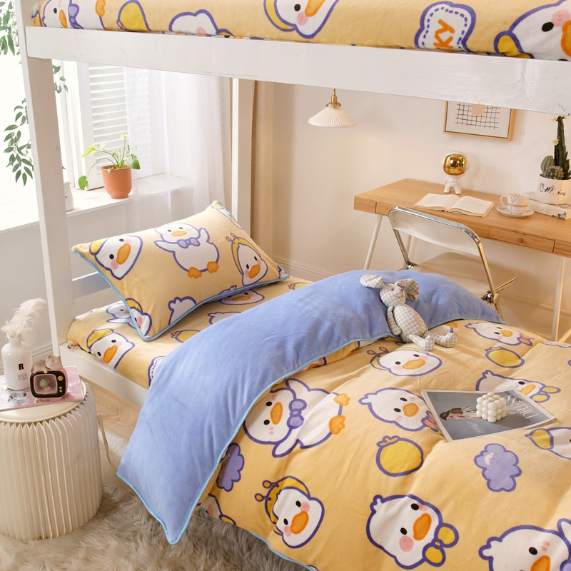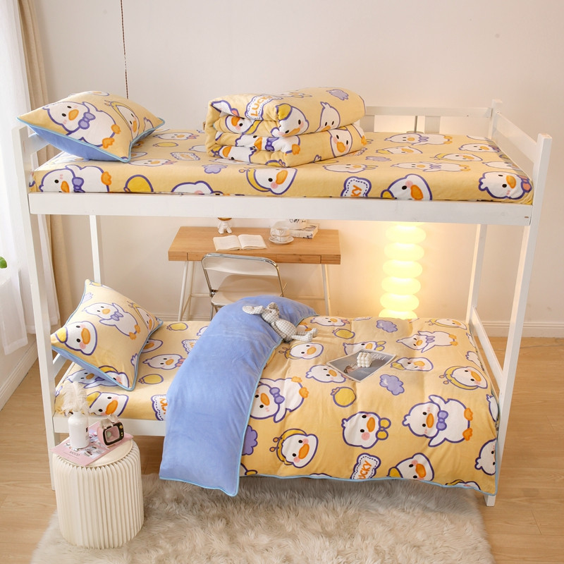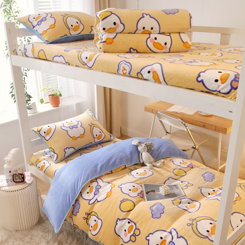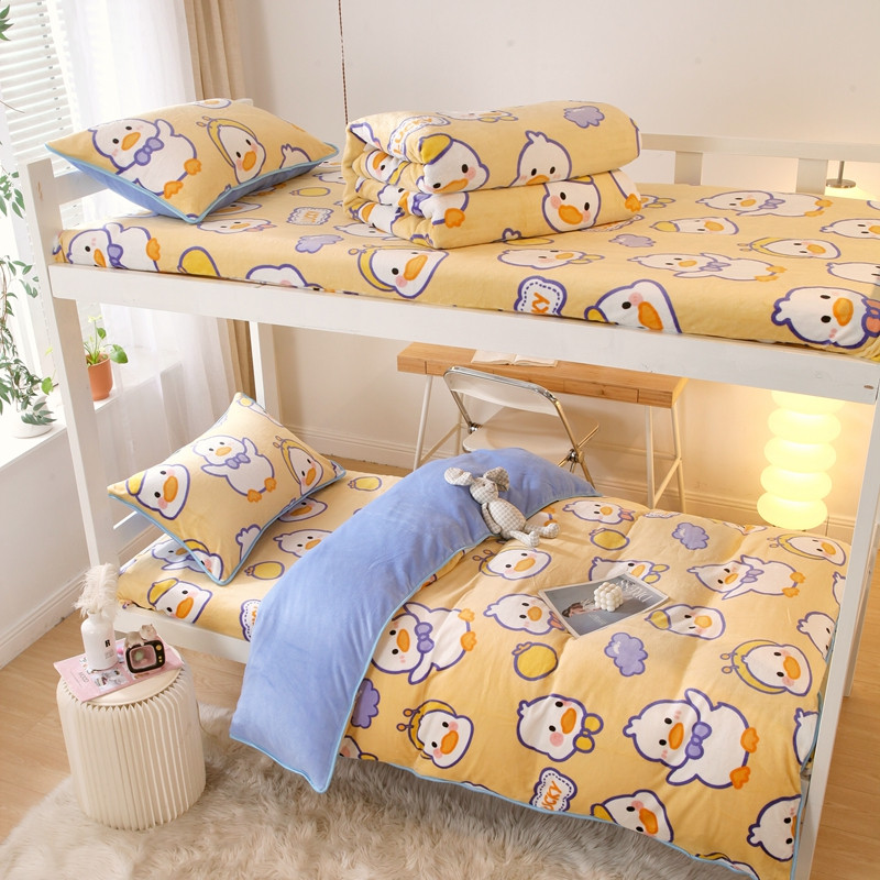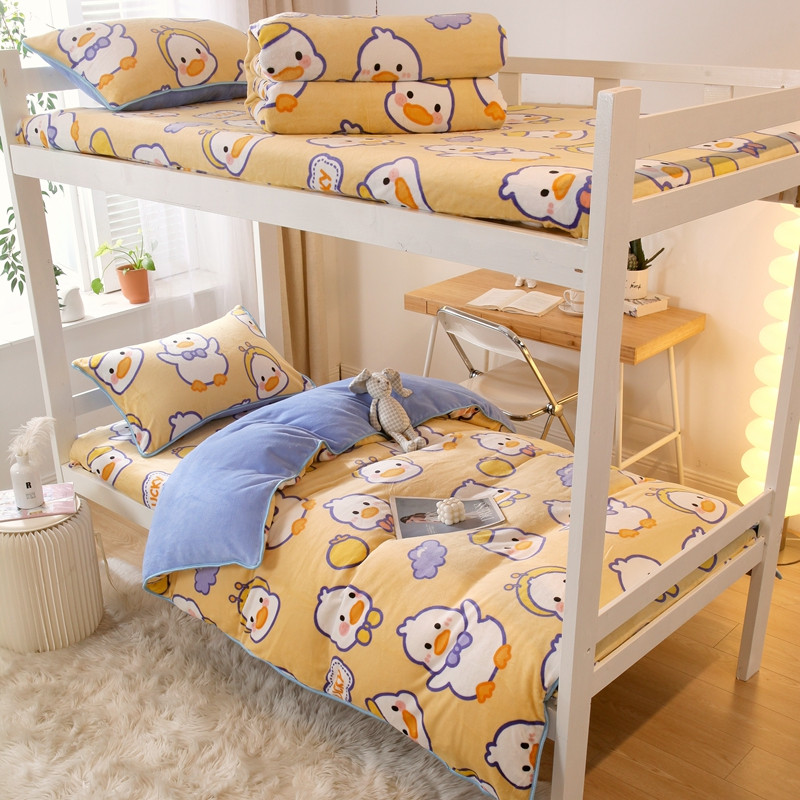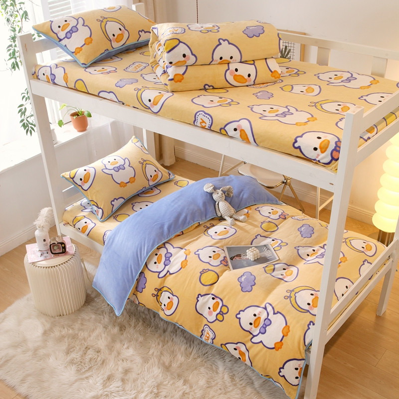 当前位置: 91家纺网 > 商品网购 > 床品套件 > 四件套 > 牛奶绒四件套 > 金鑫汇 2022新款牛奶绒学生上下铺三件套 欢乐鸭-黄