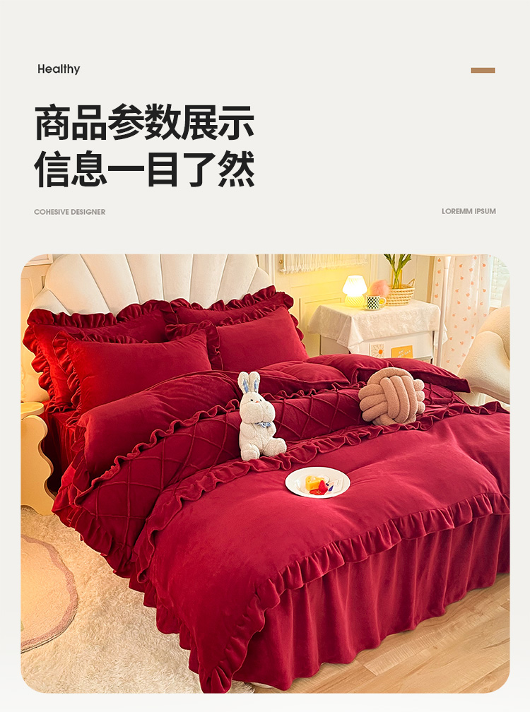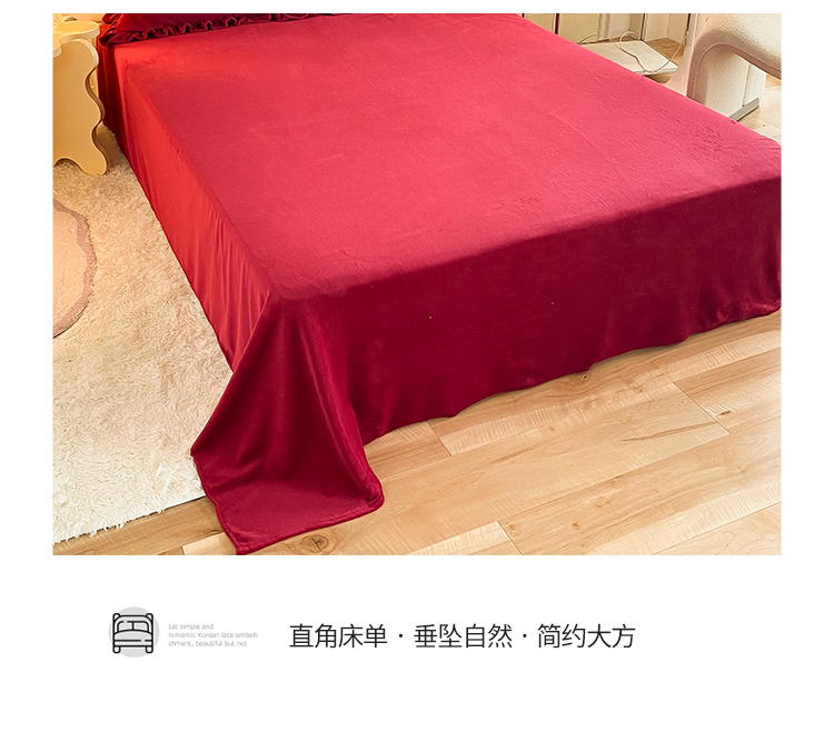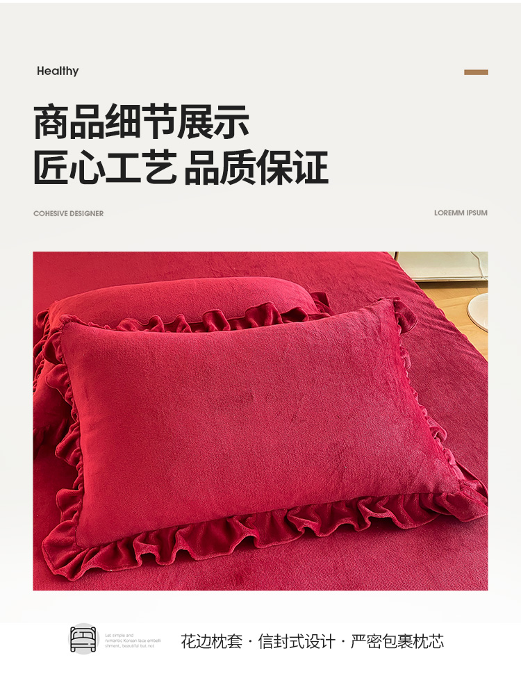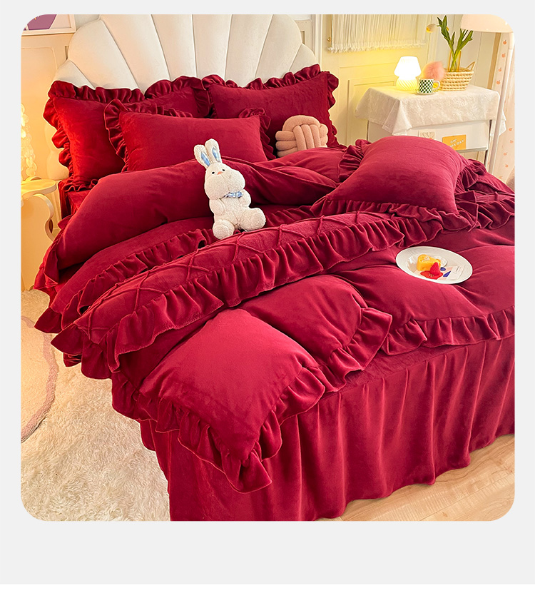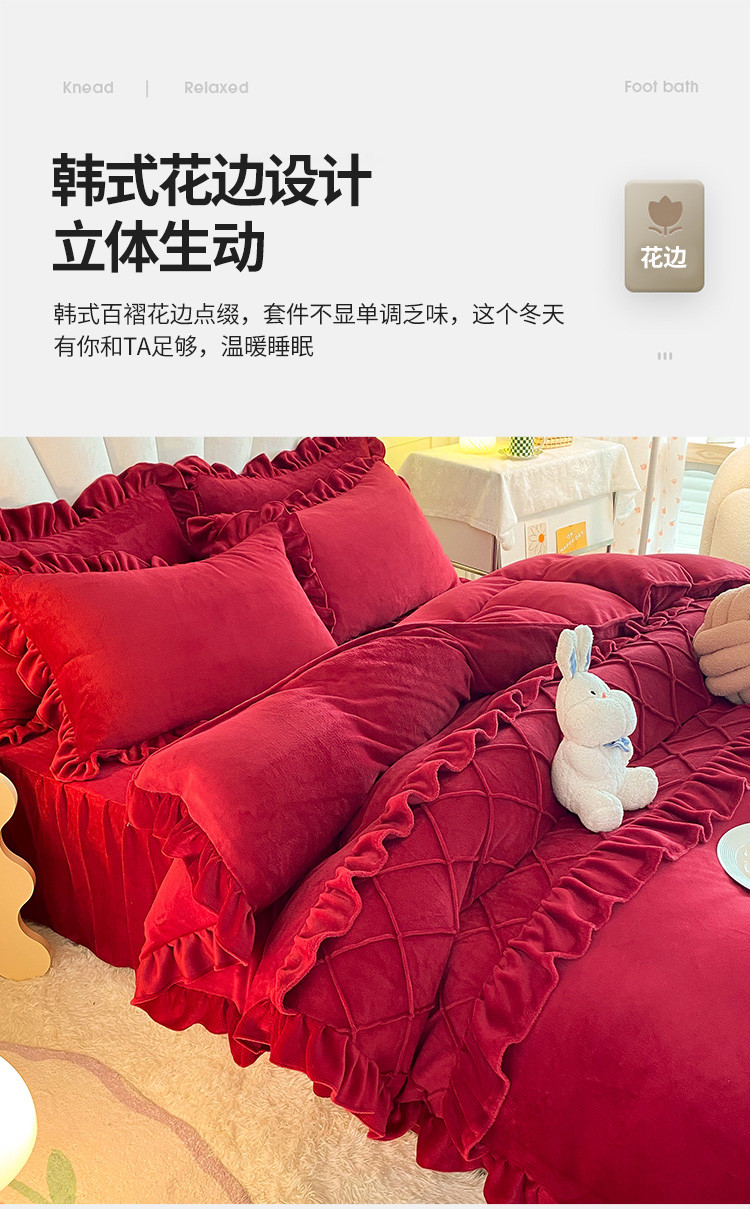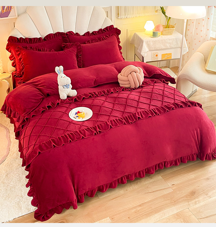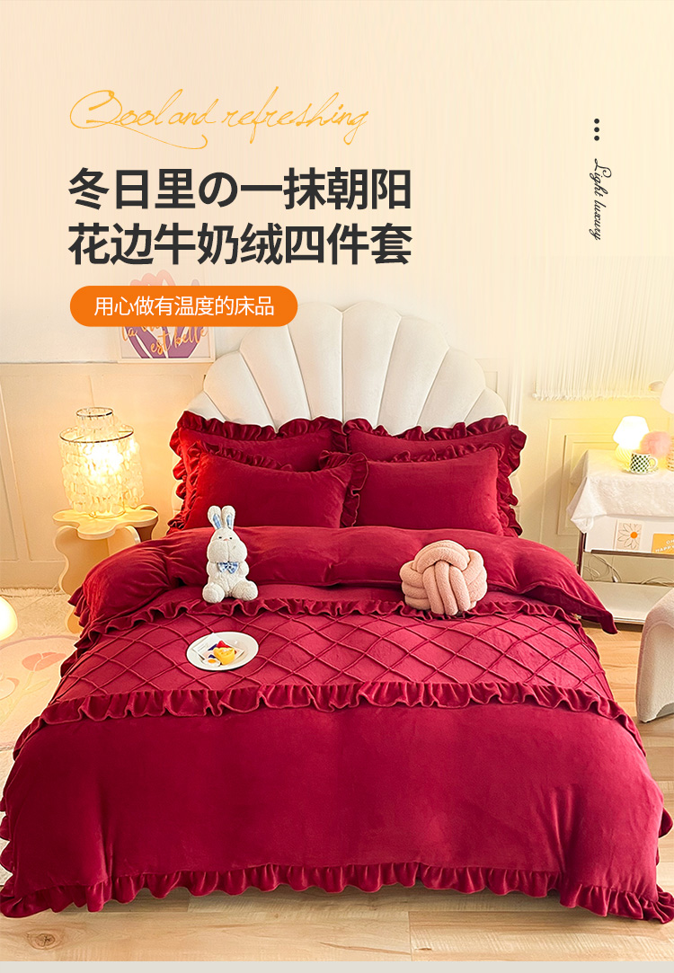 当前位置: 91家纺网 > 商品网购 > 床品套件 > 四件套 > 牛奶绒四件套 > 芭比蔓 2024新款直播供货韩版花边款牛奶绒四件套 宝石红